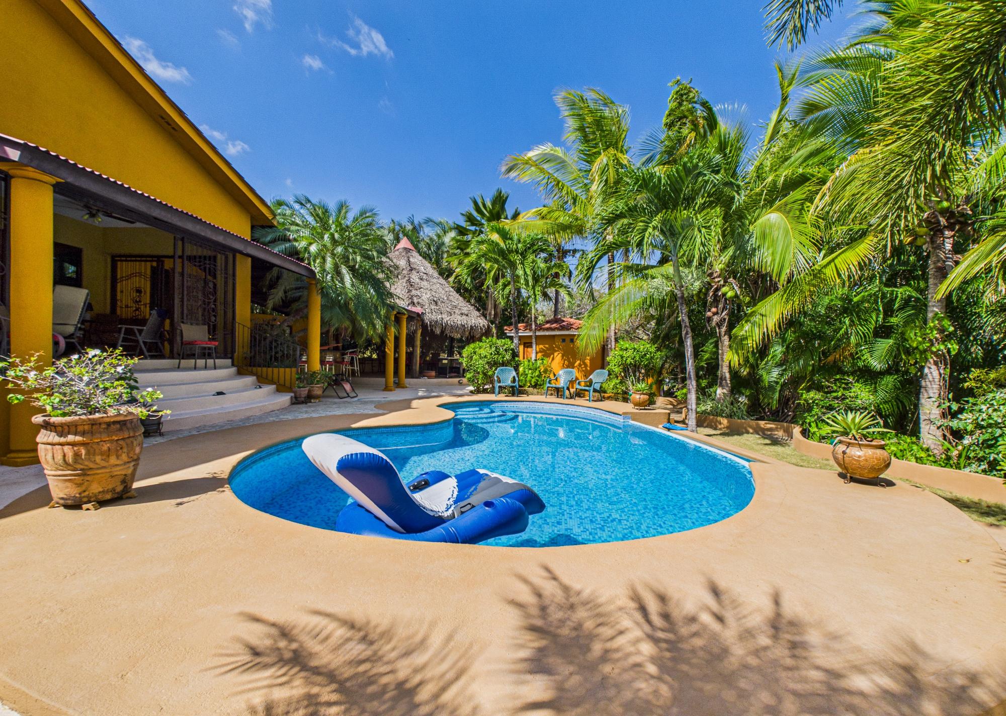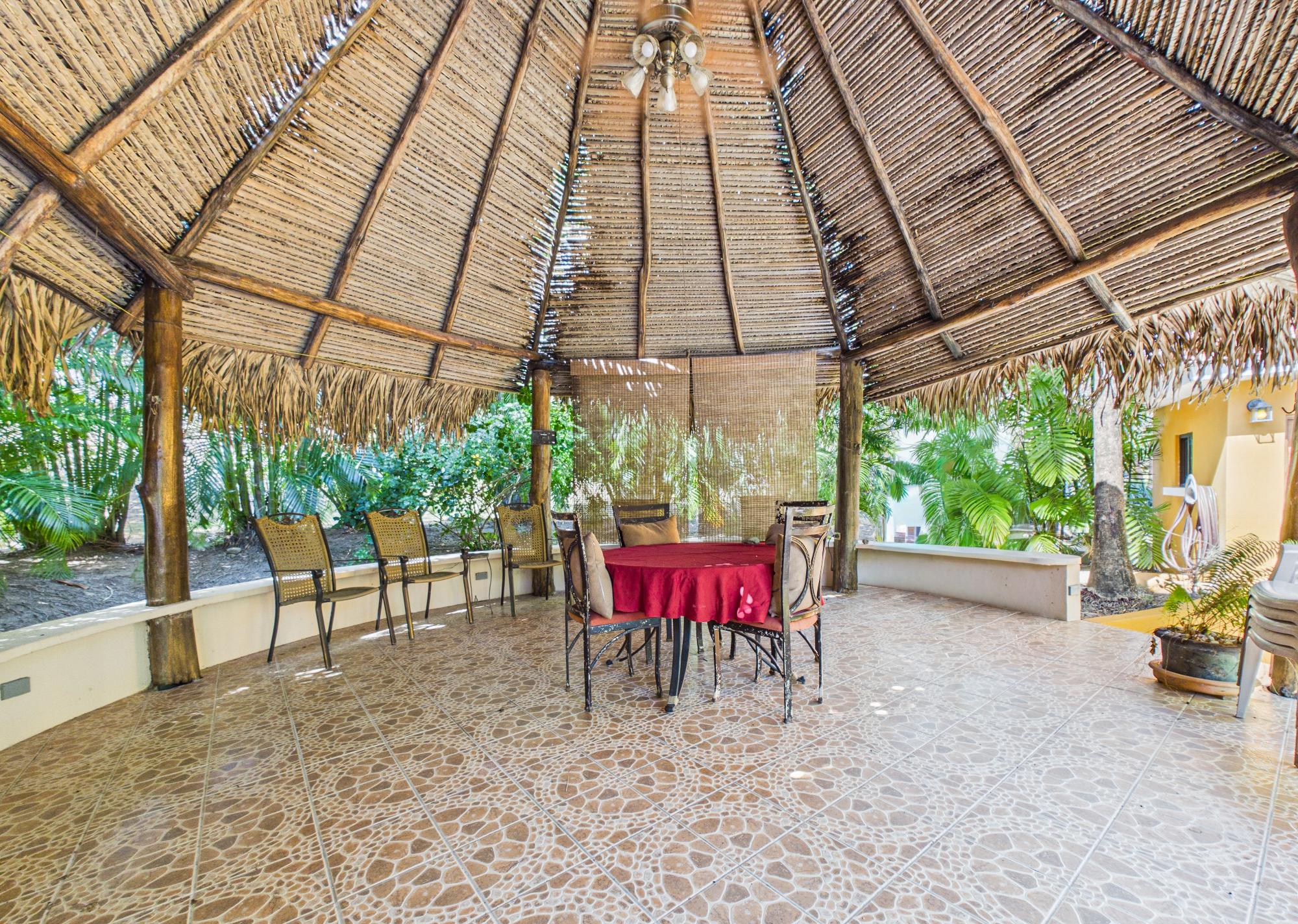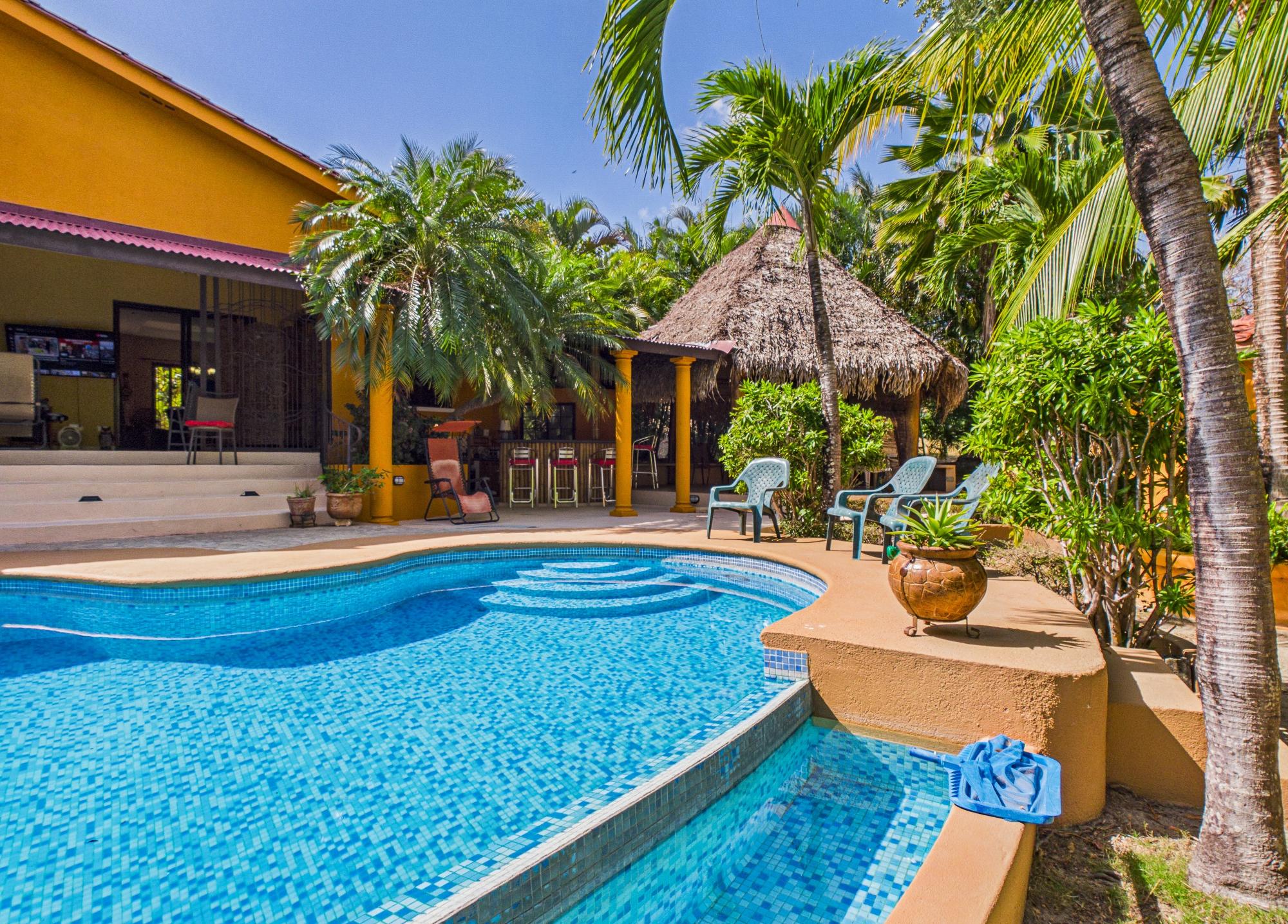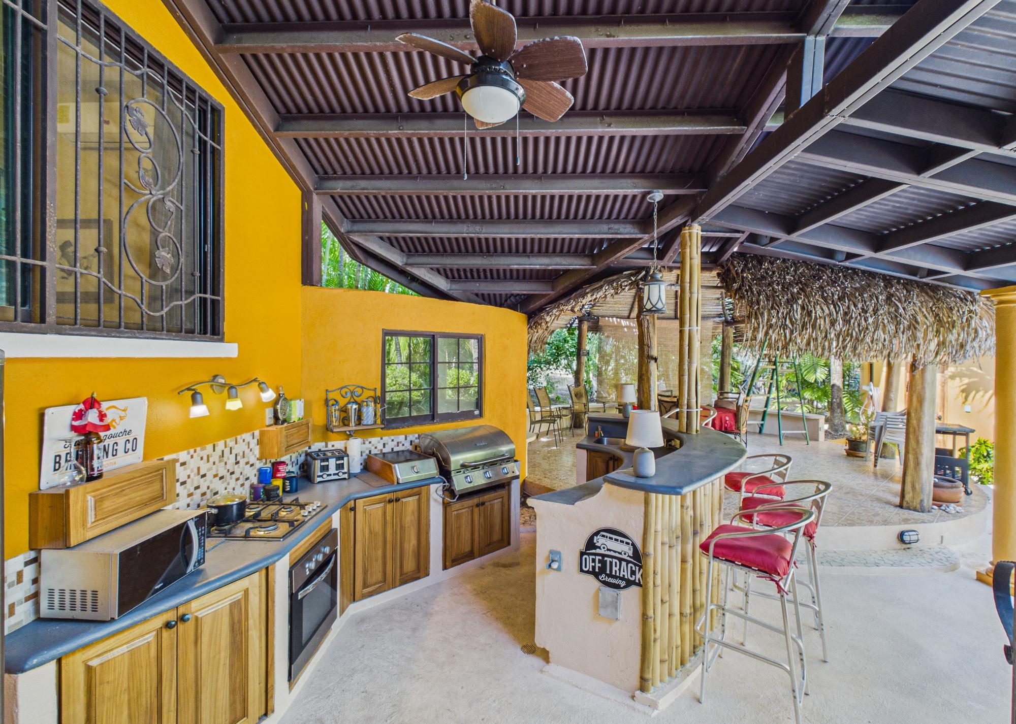 Beautiful fully furnished tropical estate located in the gated community of Hacienda Pacifica in San Carlos. This well-maintained home features an infinity-style pool, outdoor kitchen, bohío with teak columns, and lush landscaped grounds with mature fruit trees. The property offers a spacious layout with a primary suite, ensuite bathroom, and a versatile safe room that can be used as an additional bedroom or storage. Designed for indoor-outdoor living, the home includes a separate exterior building with washroom, outdoor bathroom, and additional storage spaces. Equipped with modern conveniences such as LED lighting, surge protection, and full appliances, this property is move-in ready. Enjoy privacy, security, and a relaxed lifestyle just minutes from the beach. Ideal as a full-time residence, vacation home, or investment property.