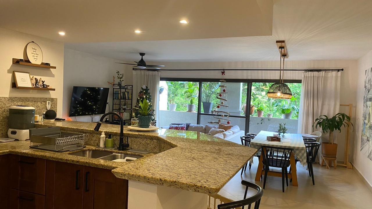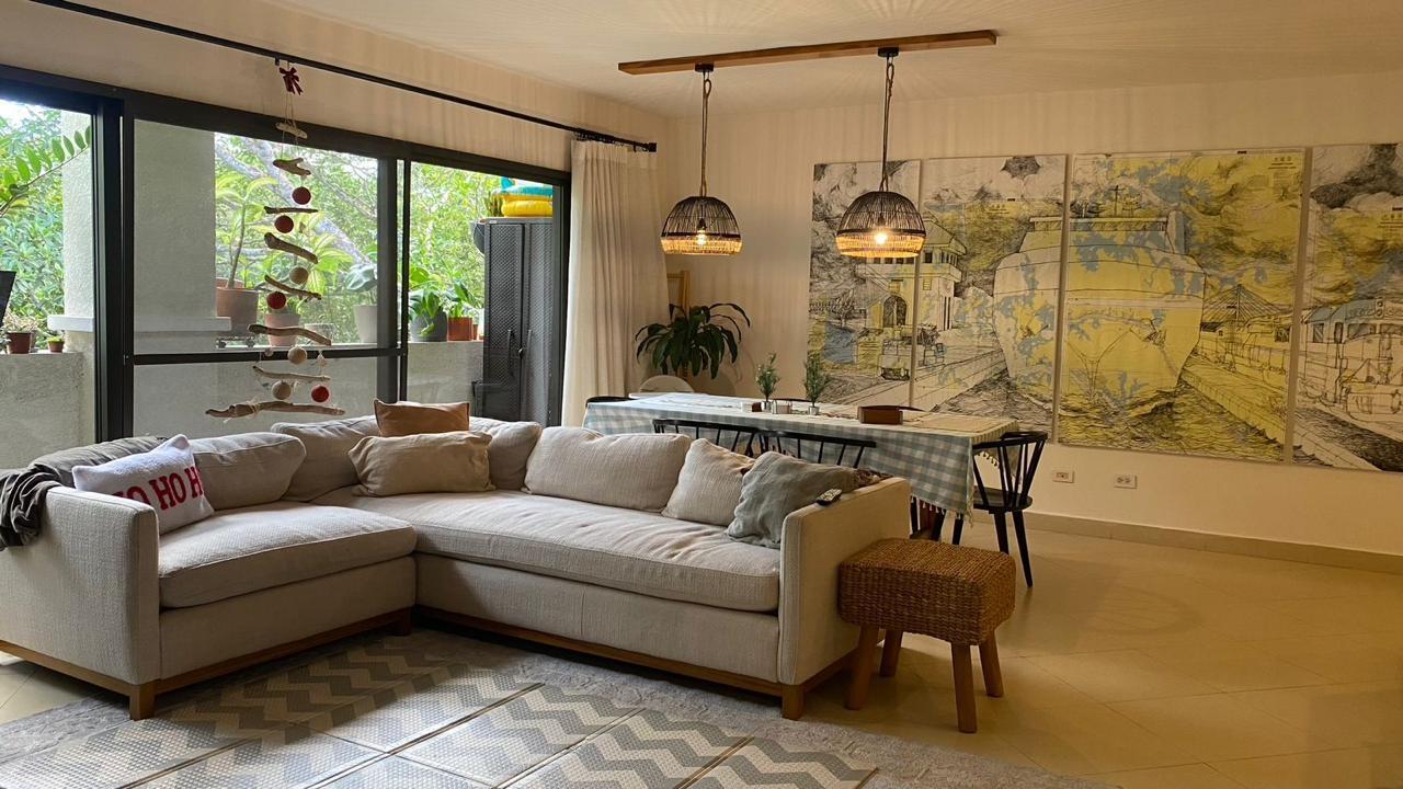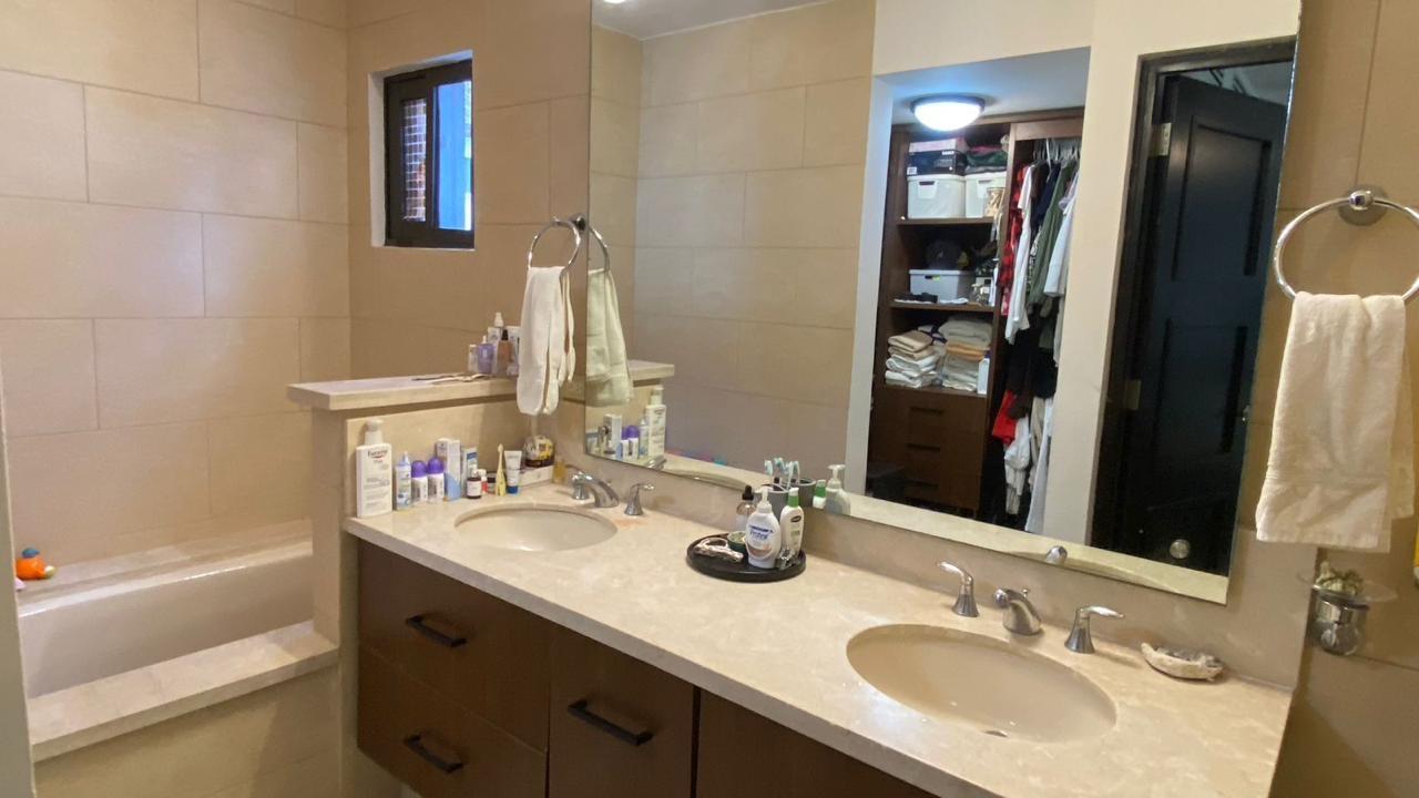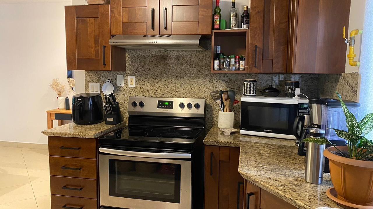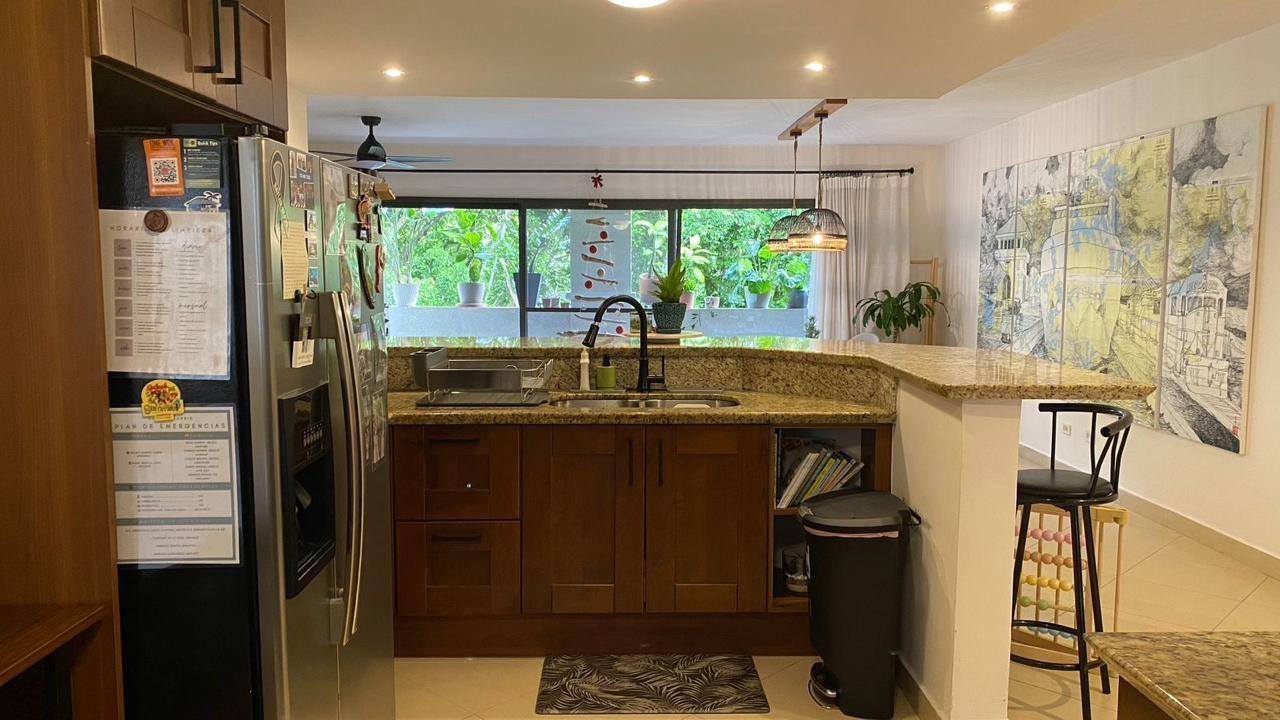 It has 2 bedrooms, 2 bathrooms, a guest half-bath, a maid’s room and bathroom, and 2 parking spaces.