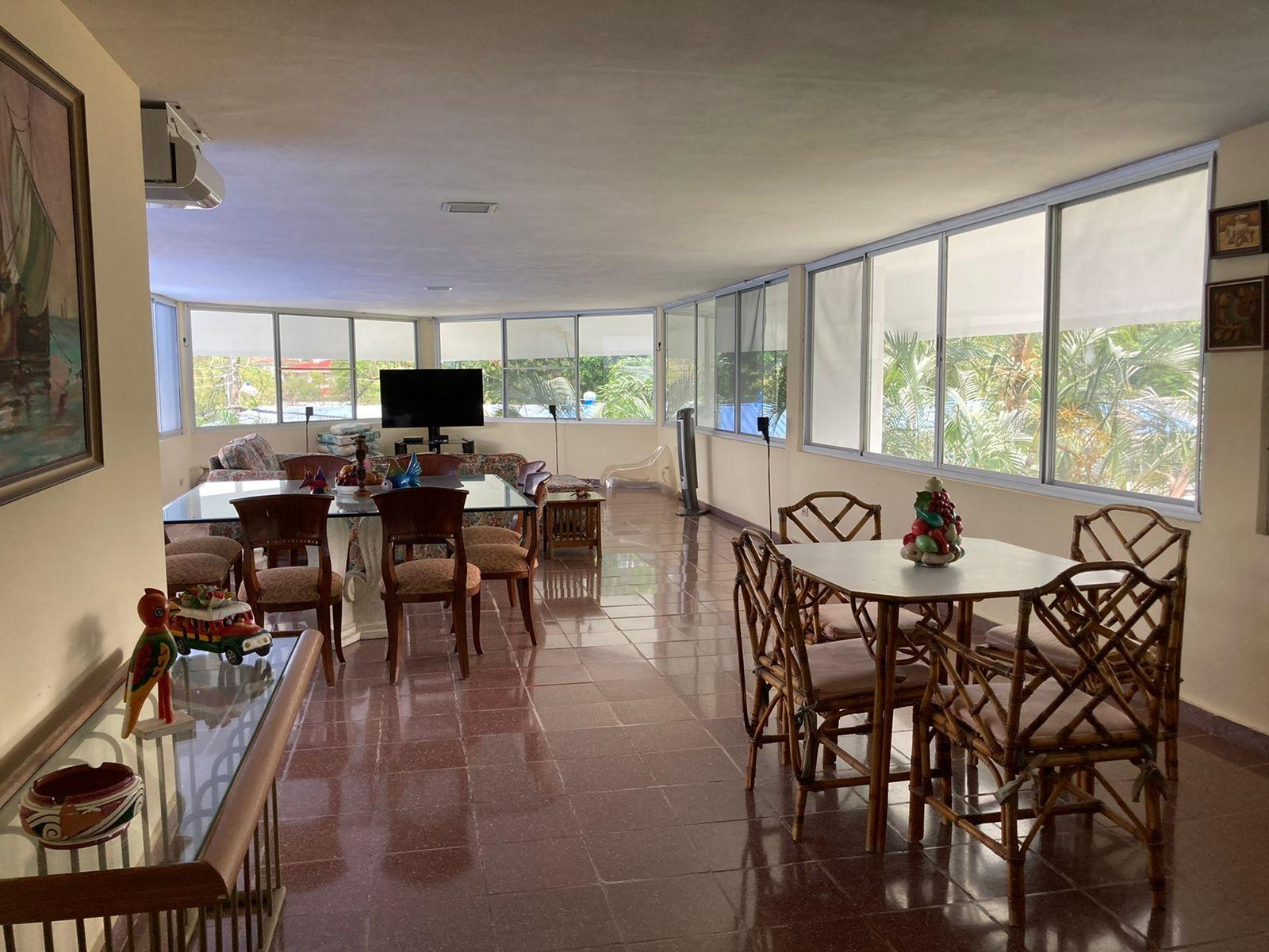 It is a furnished apartment with three bedrooms, a living room, a kitchen, two bathrooms for the bedrooms, and a maid’s room with its own bathroom.