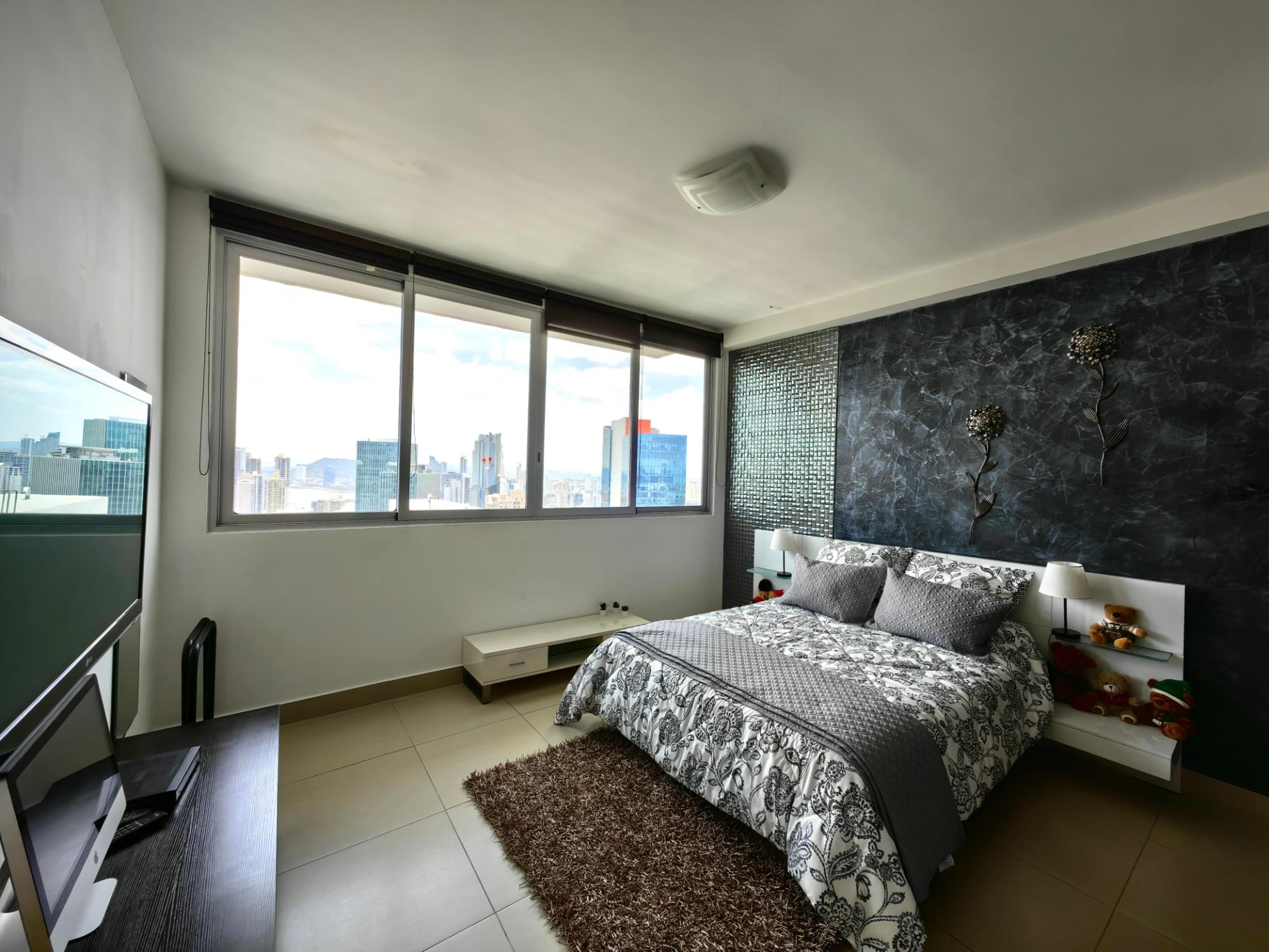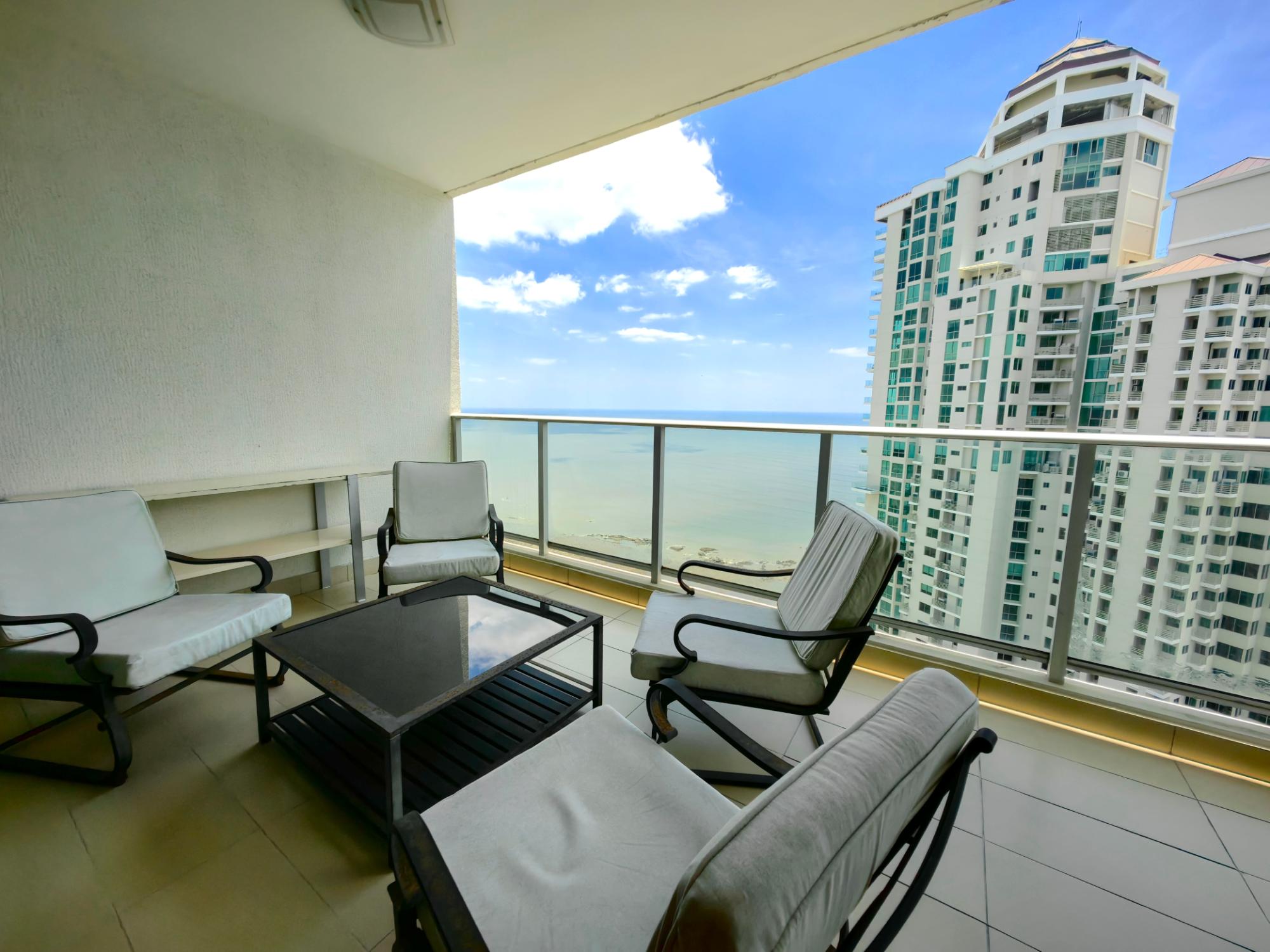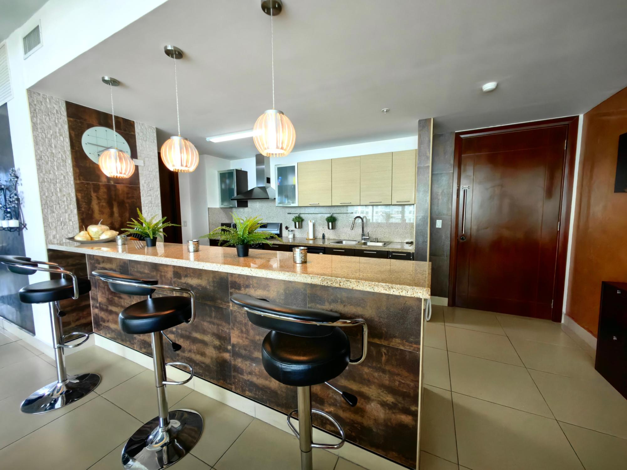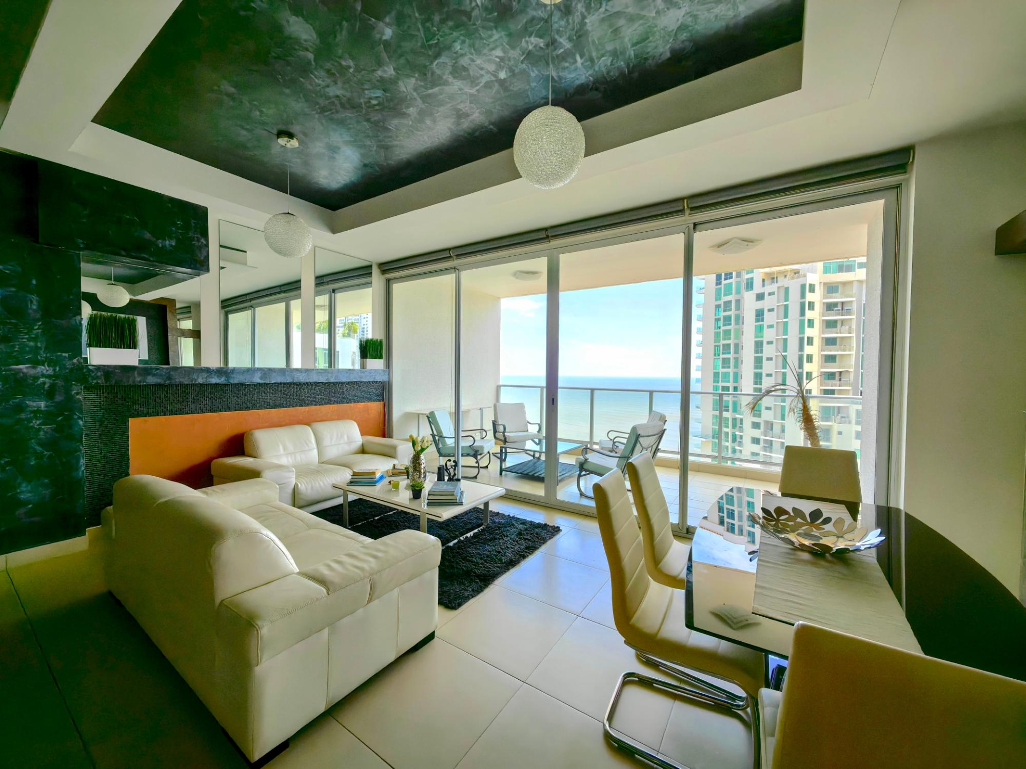 In the heart of one of Panama City’s most exclusive neighborhoods, surrounded by supermarkets, restaurants, top private clinics, and the iconic Multiplaza Mall, stands this impressive building with access via a private street and excellent space distribution. Tucked away behind a private entrance, it offers impeccable and sophisticated design. Upon entering the apartment, you are greeted by breathtaking views of the sea and the urban skyline. This fully move-in ready apartment epitomizes refined living, meticulously furnished, tastefully decorated, and equipped with top-of-the-line appliances and central air conditioning. Your sanctuary includes: Spacious living-dining area Large terrace with direct sea view Fully equipped open kitchen with breakfast bar Two bedrooms: the master with a spacious private bathroom with tub and shower, and the second with a full external bathroom that also serves as a guest bathroom. The building features a complete social area including a pool, gym, party room, children’s play area, and squash court. Soon, both the social area and the spacious lobby will be remodeled with a luxurious, contemporary design. HOA Monthly Fees: US$209.00, Yearly Land Tax: US$1,000.00
