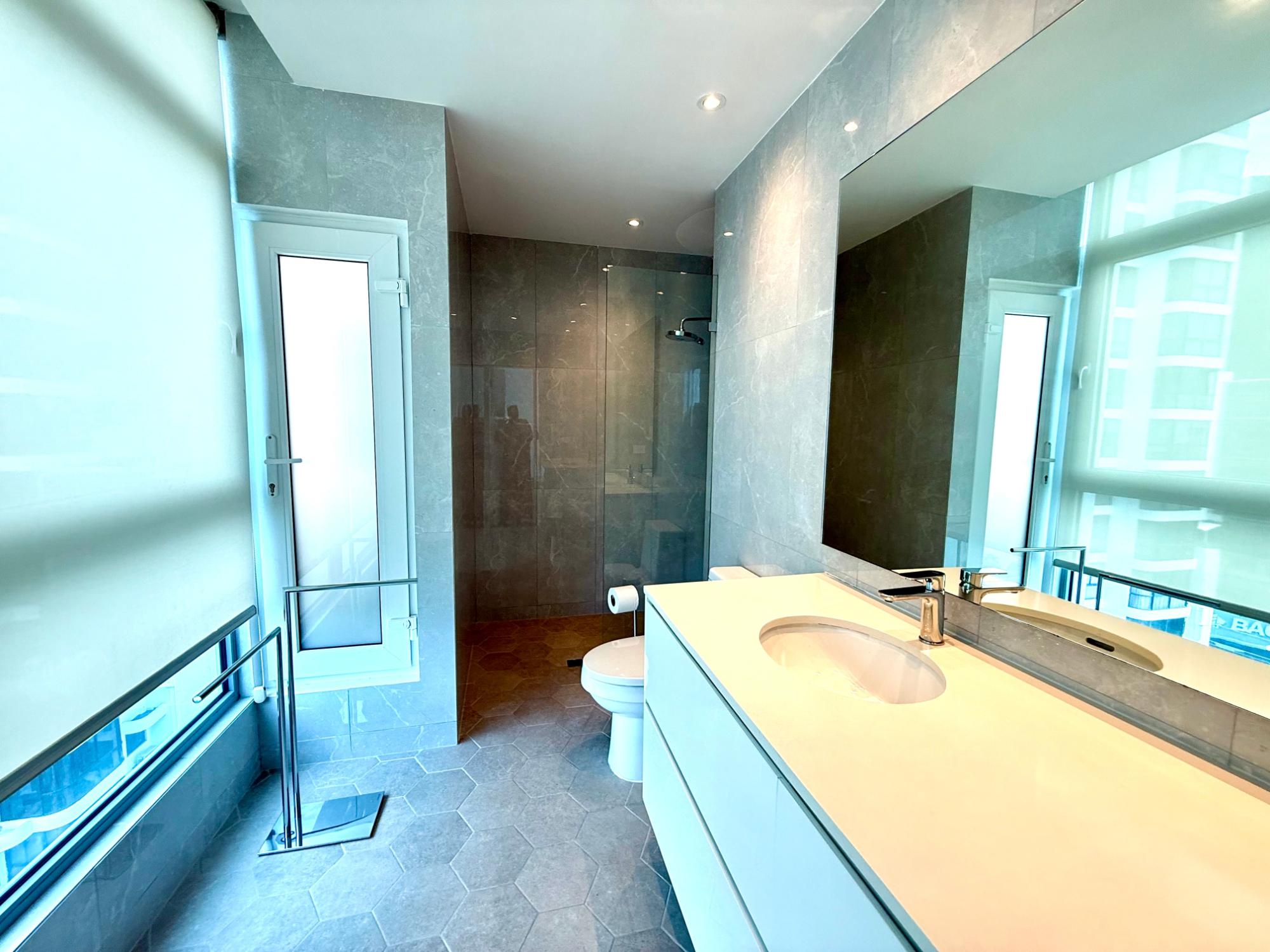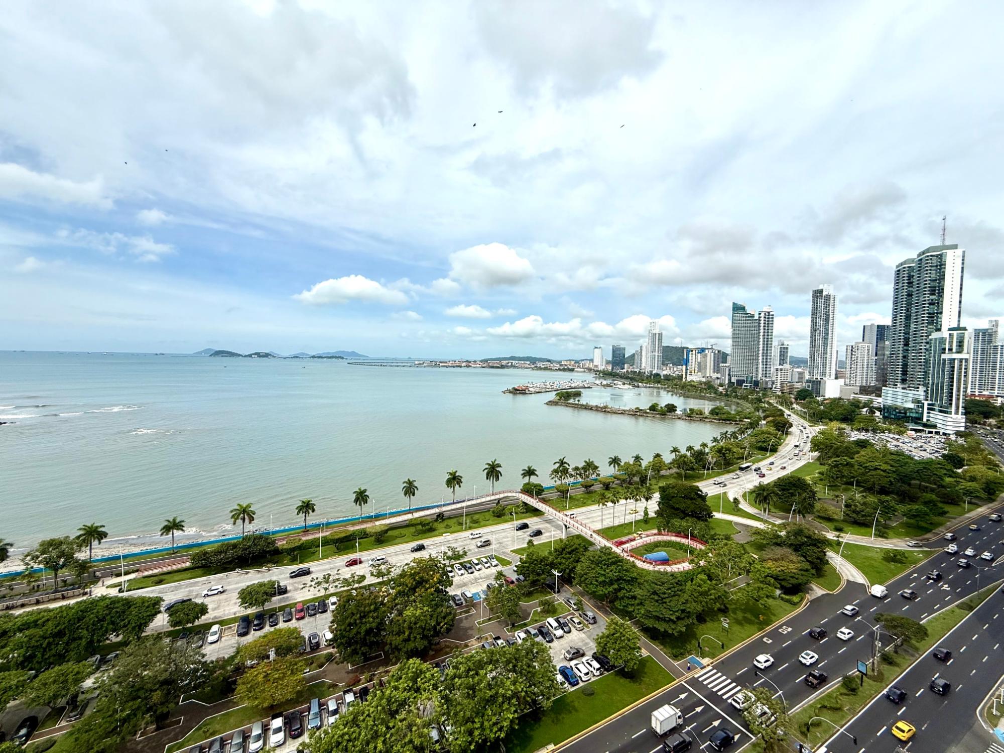 Beautifully remodeled apartment in a Bayfront building. Kitchen, bathroom, windows, and flooring have all been updated. It boasts stunning views of Balboa Avenue, yet is quieter thanks to the new double-glazed windows. Features include hardwood floors, a beautiful new kitchen with quartz countertops and a built-in electric cooktop, and electric blinds in the living room and master bedroom. The spacious living room and master bedroom offer breathtaking views of Panama Bay.