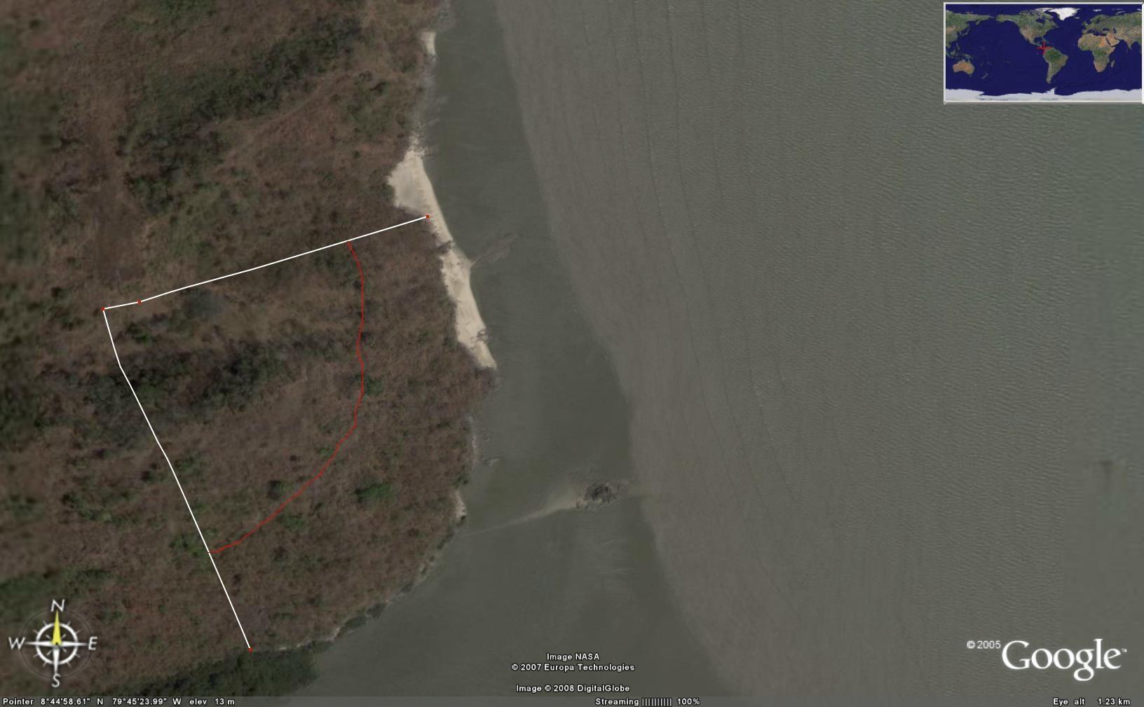 This beautiful piece of land offers something for everybody: untouched nature covered with forest, a white-sandy beach, a rocky beach, a knoll with an incredible view over the Pacific Ocean towards the islands. Of the over 9.5 hectares, almost half is titled (4.3 hectares) and the process to title the remaining 5.37 hectares on the beach has been initiated but not continued. A spring 10 meters into the adjacent property close to the beach on the north side, which lies in the beach concession area, promises your own fresh water supply. The owners have built a rough road to the property which is now accessible by 4×4 car. There is also an impressive access is by boat. And all this less than an hour away from Panama City, just 16 km from the Interamericana. Build your holiday house here and you can retreat from the hot and noisy City to this breezy paradise over the weekends. Or plan your retirement when you can spend your time going fishing or relaxing in the shade, watching the whales swim by.