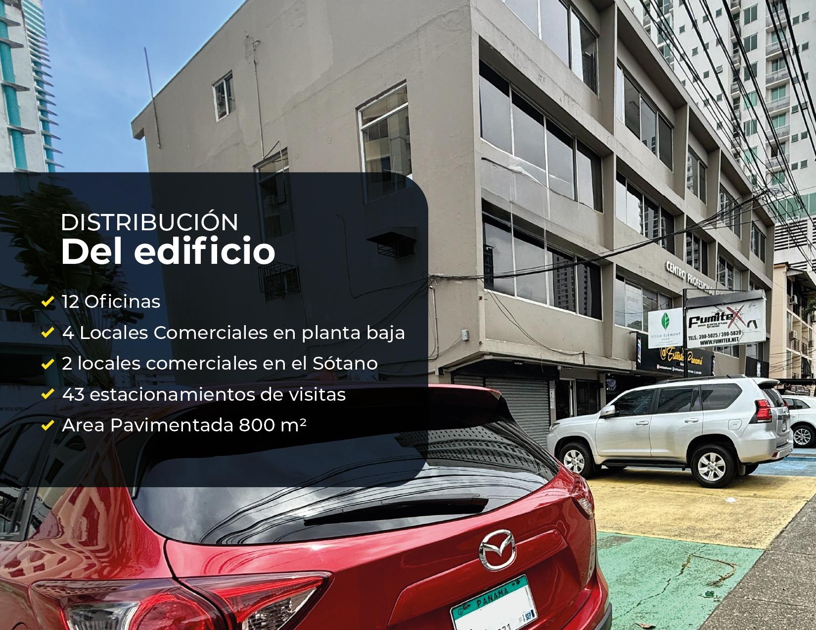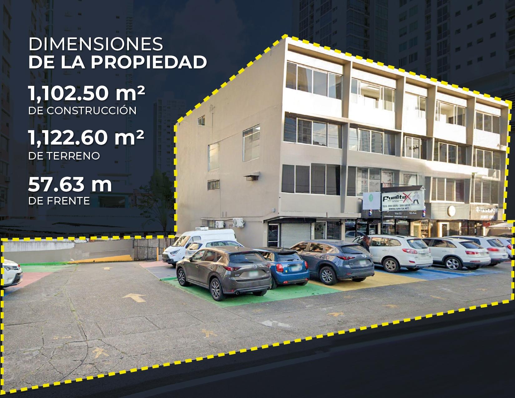 The property offers excellent visibility as it is located directly behind the battery house on Vía Porras and only 25 meters from Omar Park, close to banks, restaurants, and other businesses. It has easy access from Vía Porras and Calle 50. The building features: 12 offices, 4 commercial spaces on the ground floor, 2 commercial spaces in the basement, 42 visitor parking spaces, and 800 m² of paved area.