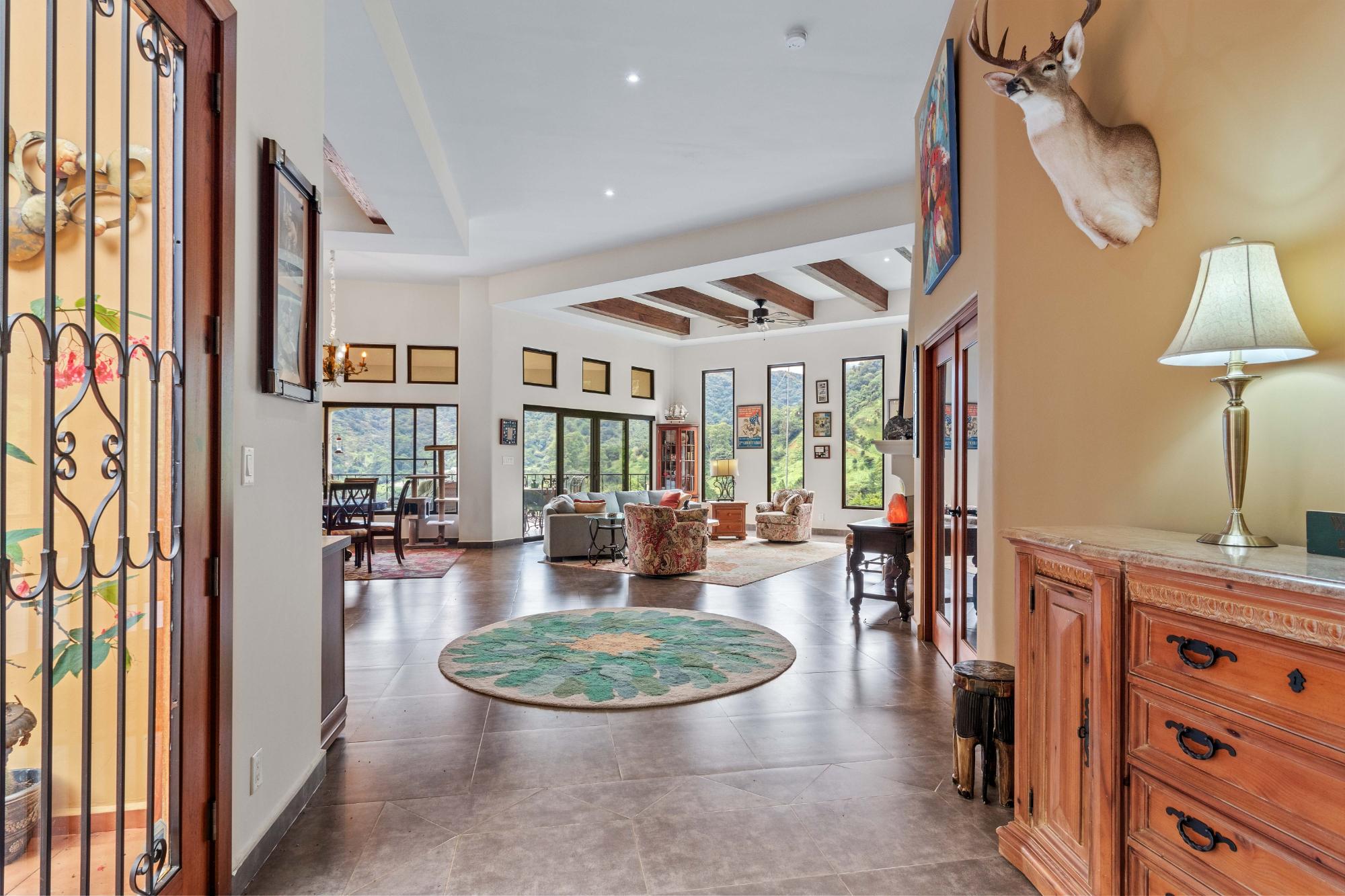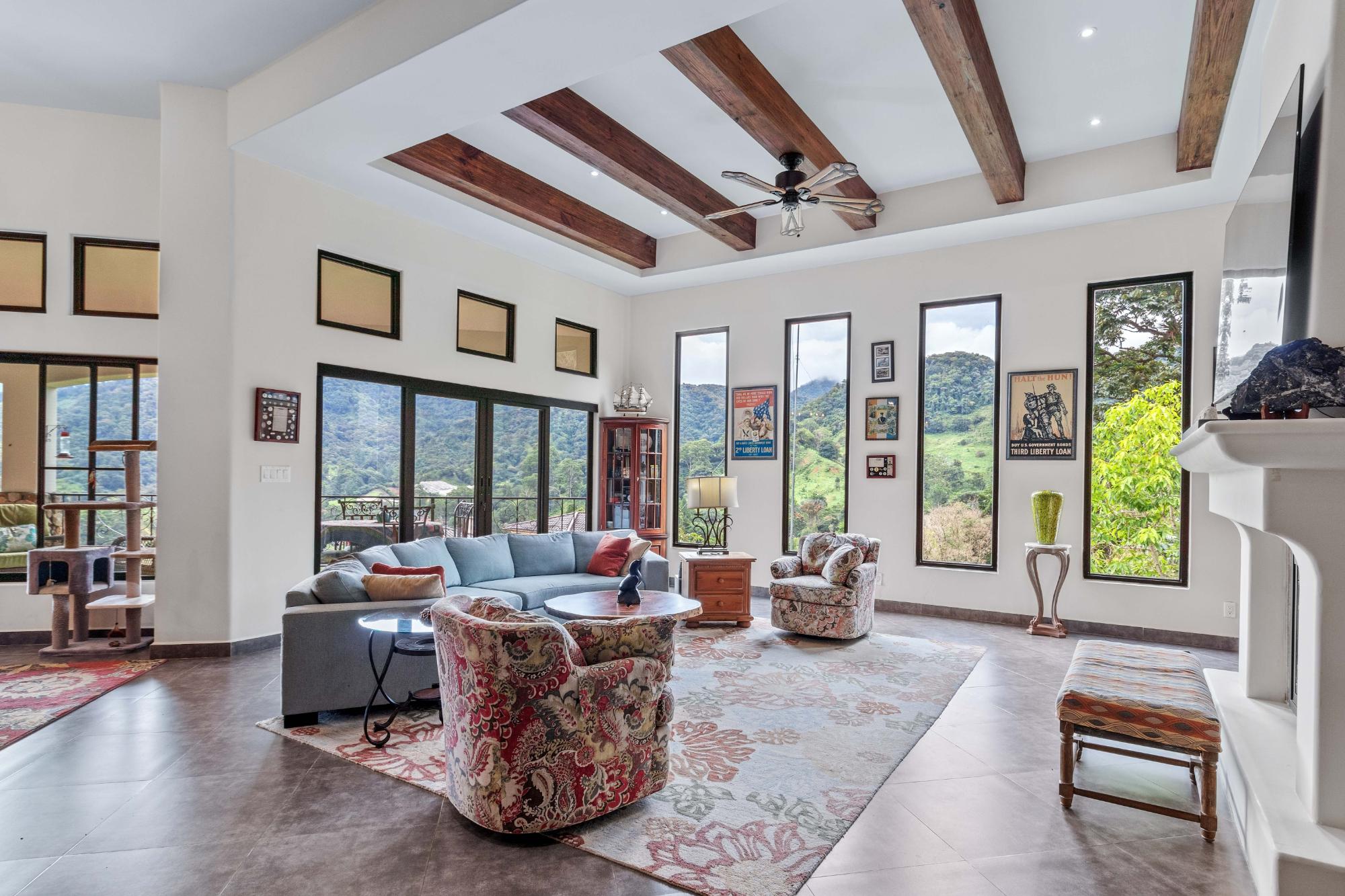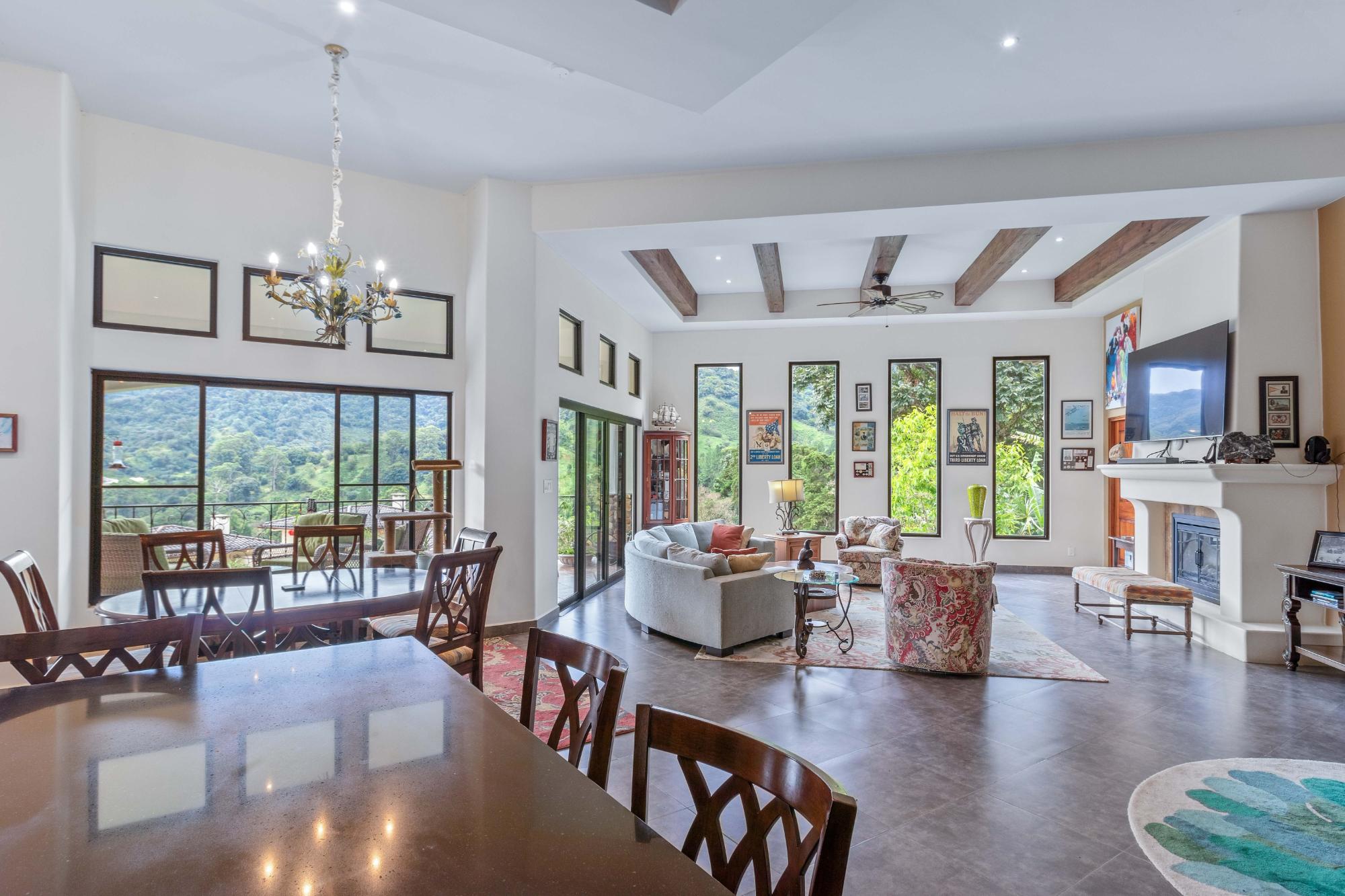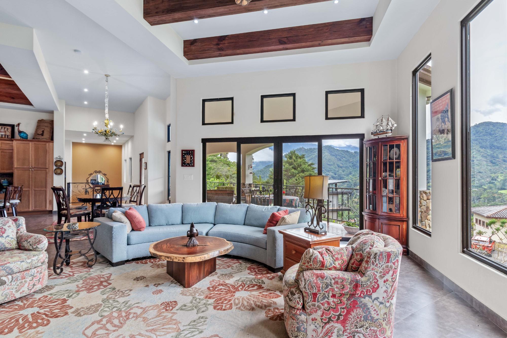 Tucked into the lush, elevated landscapes of Boquete, this fully furnished 4-bedroom estate with a dedicated office space offers panoramic elegance, natural serenity, and resilient, future-ready design. Located within The Springs — a gated and friendly HOA community backed by protected National Park land — the home is just minutes from town and Boquete’s finest dining, offering convenience without sacrificing tranquility. This two-story residence embraces light, space, and comfort. High ceilings and oversized windows on both levels create an atmosphere of openness, while thoughtfully placed terraces and garden paths invite seamless indoor-outdoor living. The main level features a wide, open-concept layout anchored by a warm, spacious kitchen, flowing into expansive living and dining areas and out to a covered terrace with stunning views of the surrounding mountains. Downstairs offers additional bedrooms, a secondary living space, and a private kitchenette, perfect for extended guests, multigenerational living, or income potential. A dedicated office room provides the ideal space to work remotely or convert into a creative studio, library, or flex room. This estate includes a fully enclosed two-car garage, plus two dehumidified storage rooms — one on each floor — giving you plenty of secure space for storage and seasonal items. And what truly sets this home apart is its smart, self-sufficient infrastructure: A computerized lithium battery system with whole-home surge protection automatically activates during outages — powering the entire home silently for up to 12 hours.