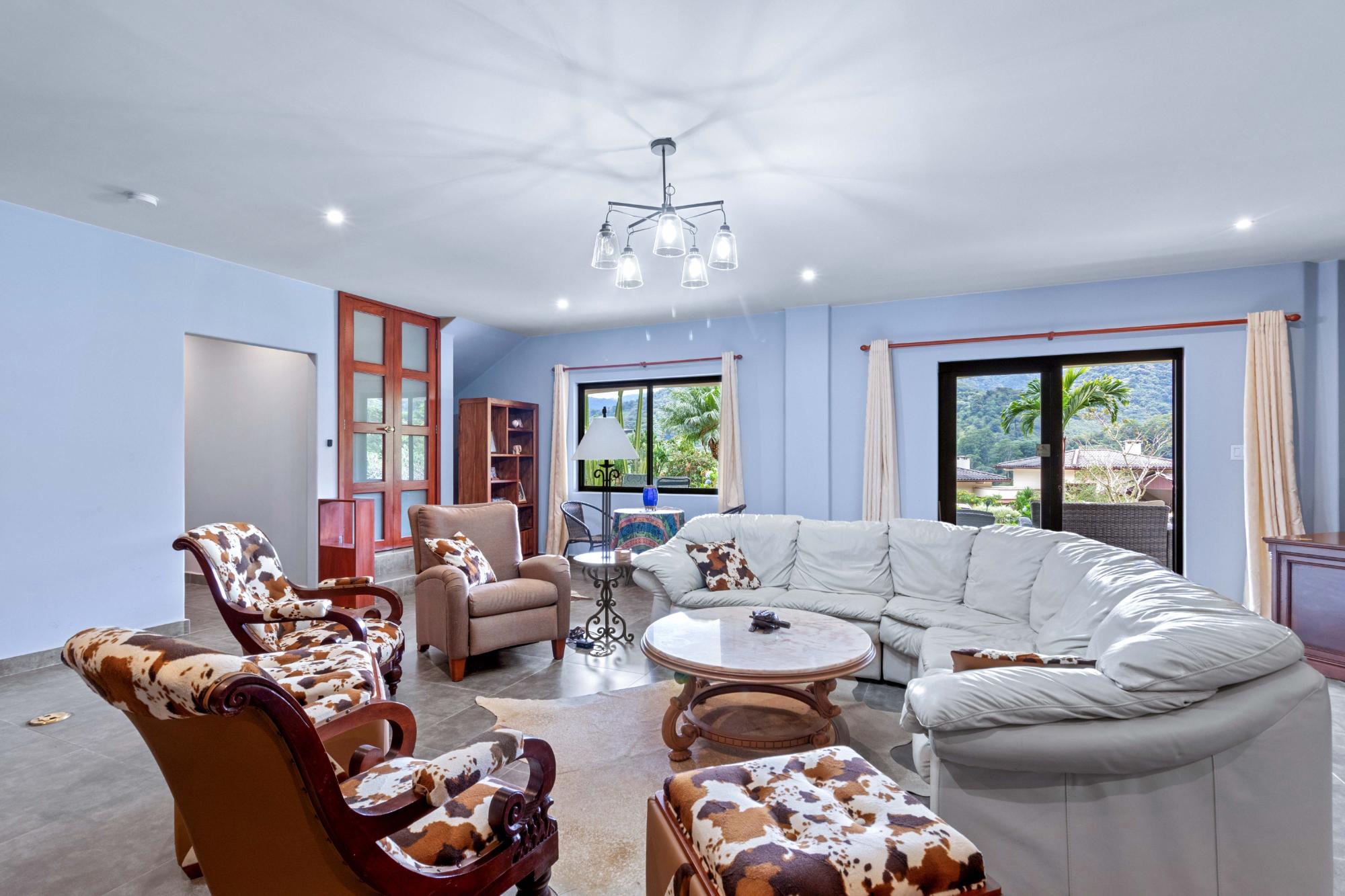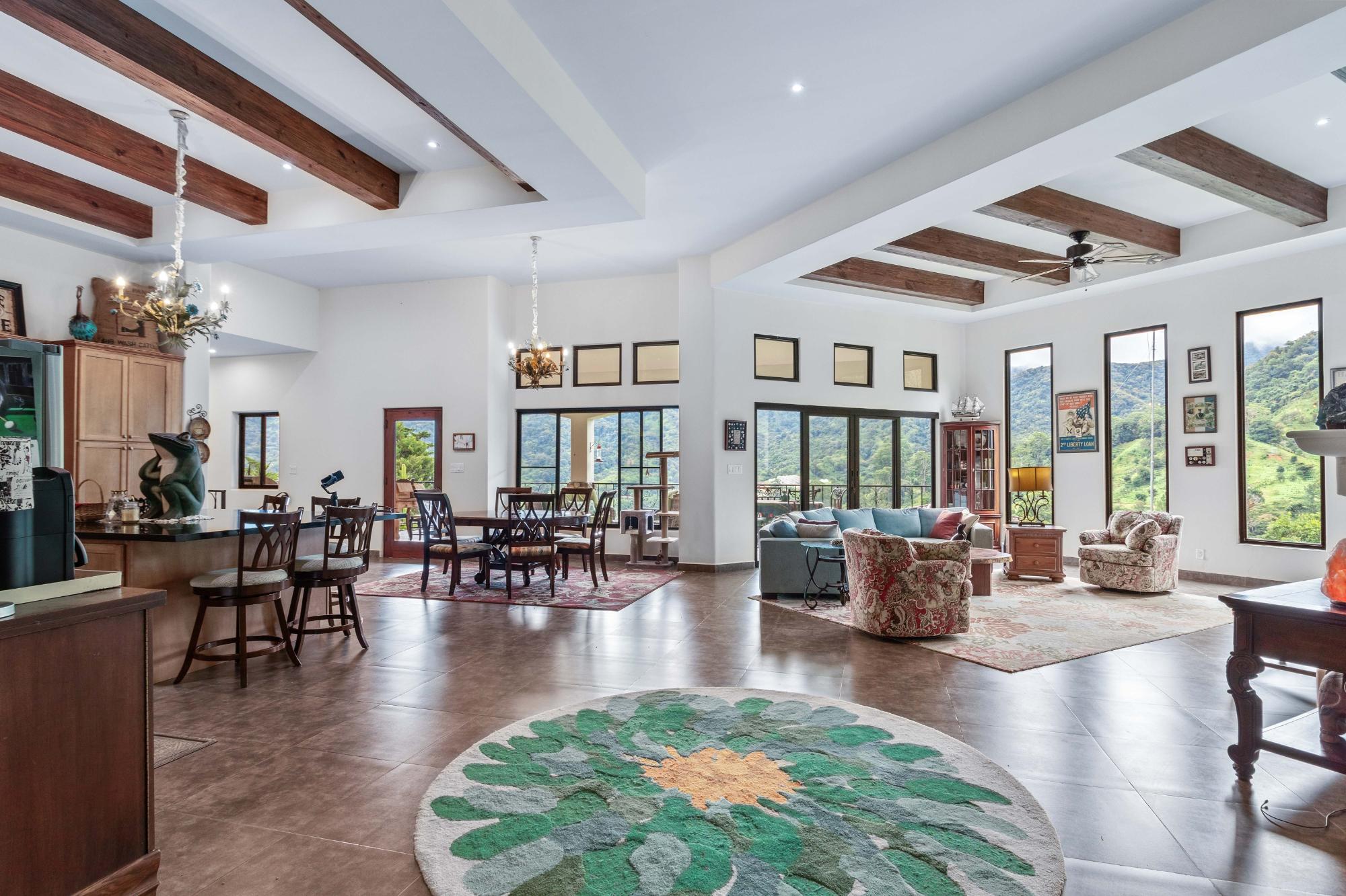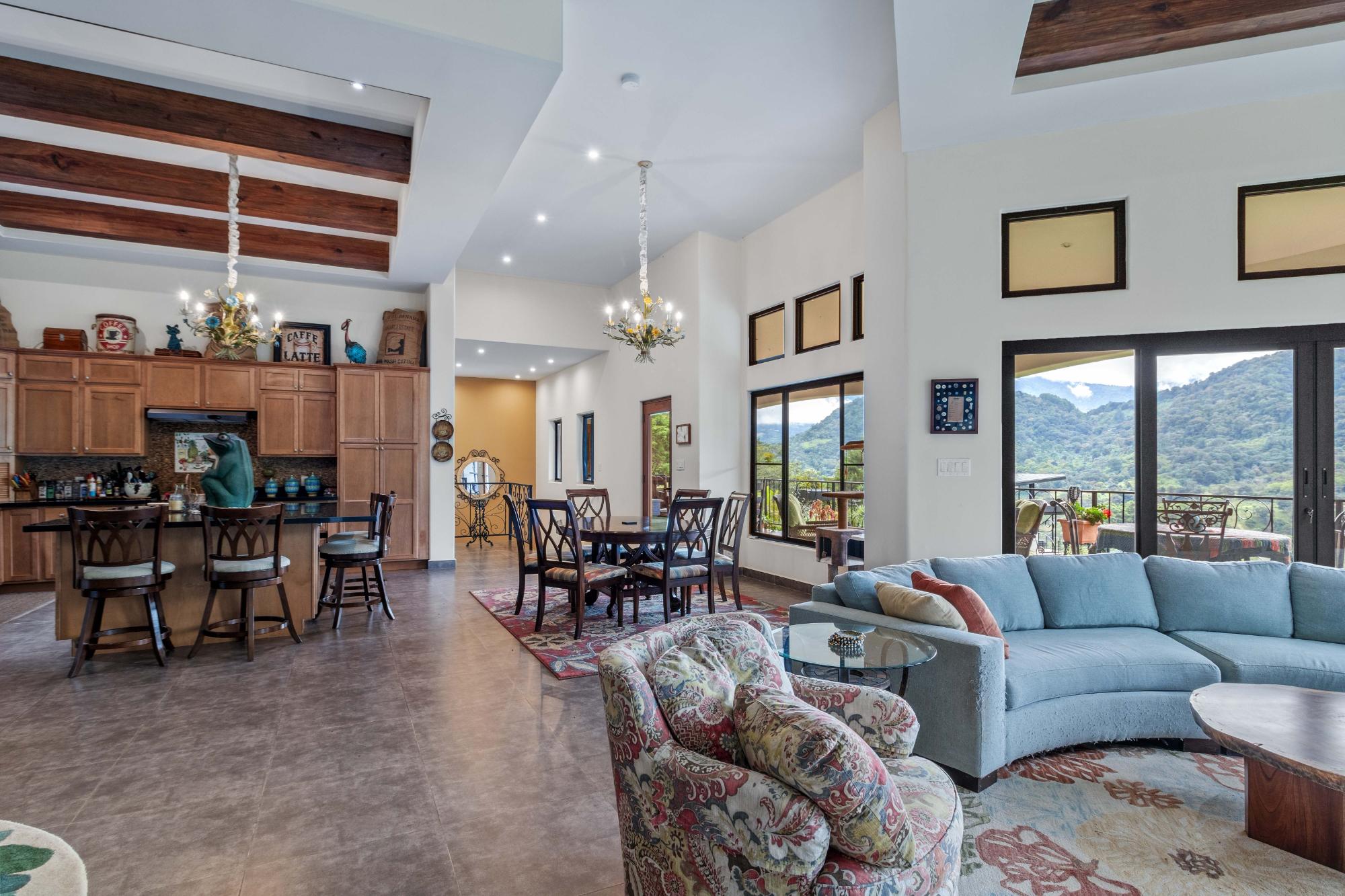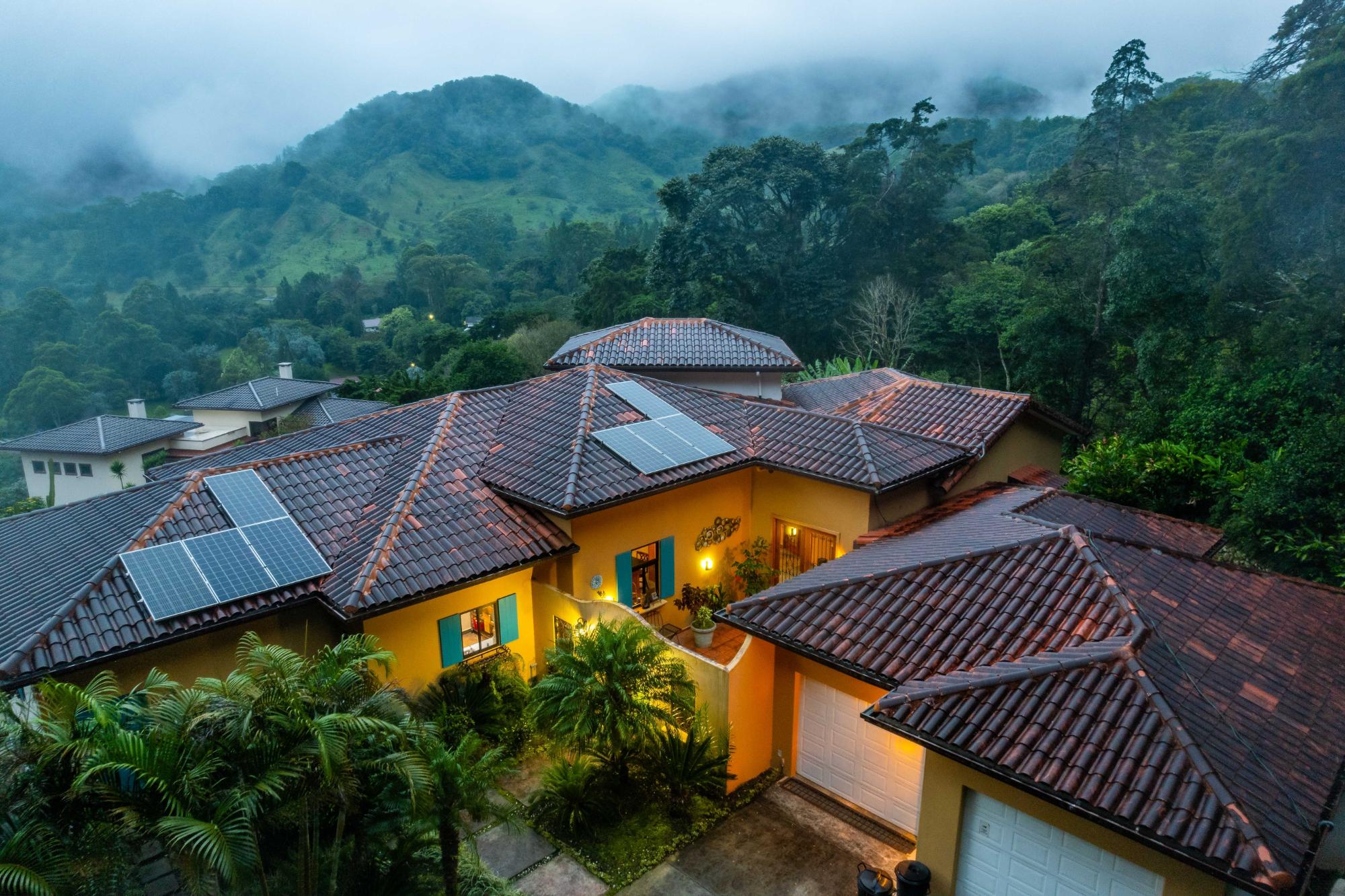 Tucked into the lush, elevated landscapes of Boquete, this fully furnished 4-bedroom estate with a dedicated office space offers panoramic elegance, natural serenity, and resilient, future-ready design. Located within The Springs — a gated and friendly HOA community backed by protected National Park land — the home is just minutes from town and Boquete’s finest dining, offering convenience without sacrificing tranquility. This two-story residence embraces light, space, and comfort. High ceilings and oversized windows on both levels create an atmosphere of openness, while thoughtfully placed terraces and garden paths invite seamless indoor-outdoor living. The main level features a wide, open-concept layout anchored by a warm, spacious kitchen, flowing into expansive living and dining areas and out to a covered terrace with stunning views of the surrounding mountains. Downstairs offers additional bedrooms, a secondary living space, and a private kitchenette, perfect for extended guests, multigenerational living, or income potential. A dedicated office room provides the ideal space to work remotely or convert into a creative studio, library, or flex room. This estate includes a fully enclosed two-car garage, plus two dehumidified storage rooms — one on each floor — giving you plenty of secure space for storage and seasonal items. And what truly sets this home apart is its smart, self-sufficient infrastructure: A computerized lithium battery system with whole-home surge protection automatically activates during outages — powering the entire home silently for up to 12 hours.