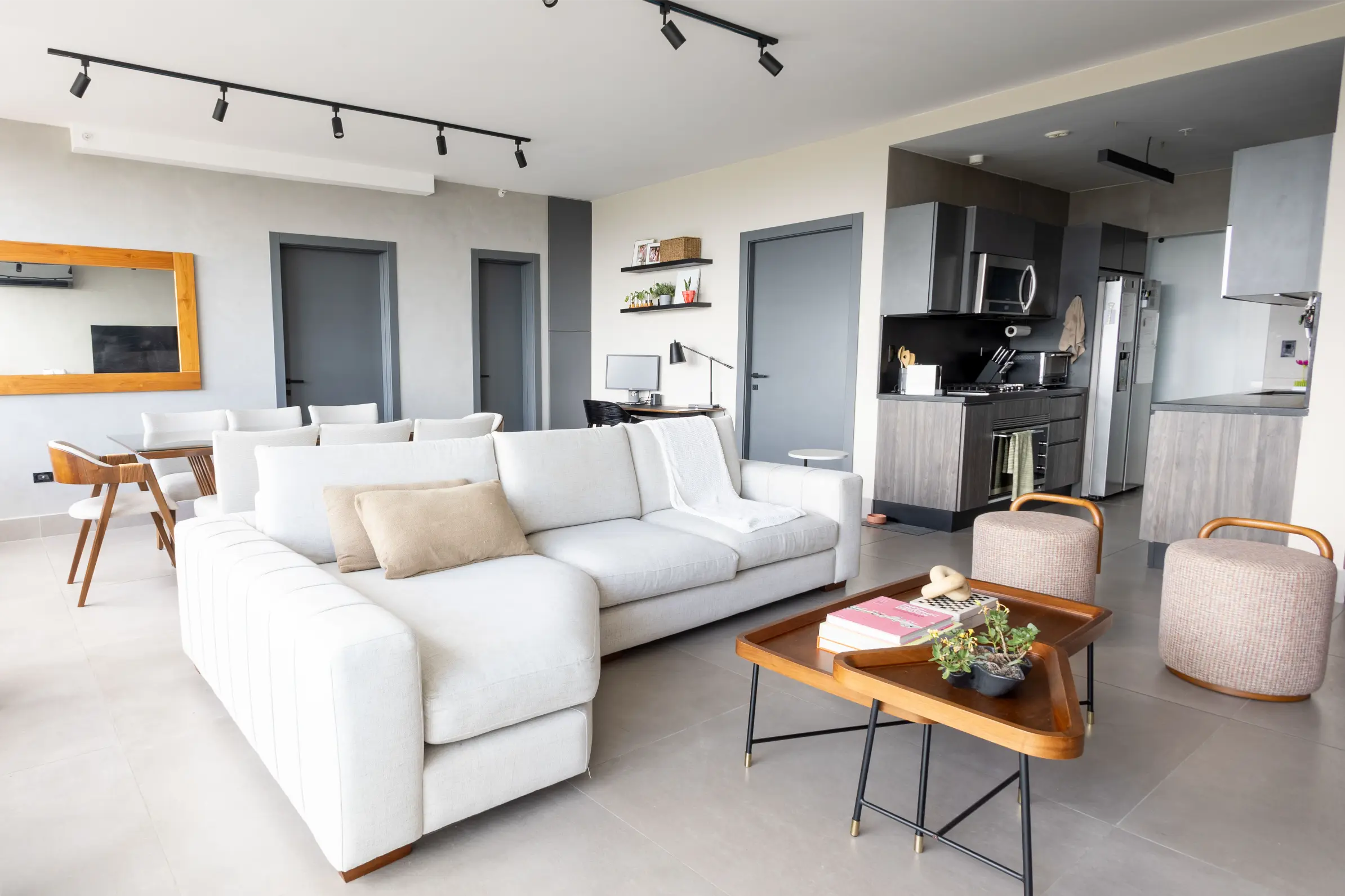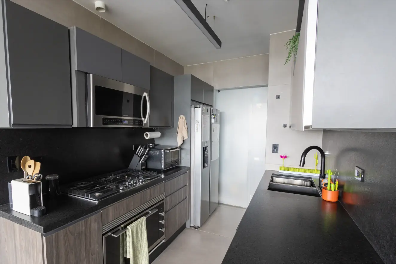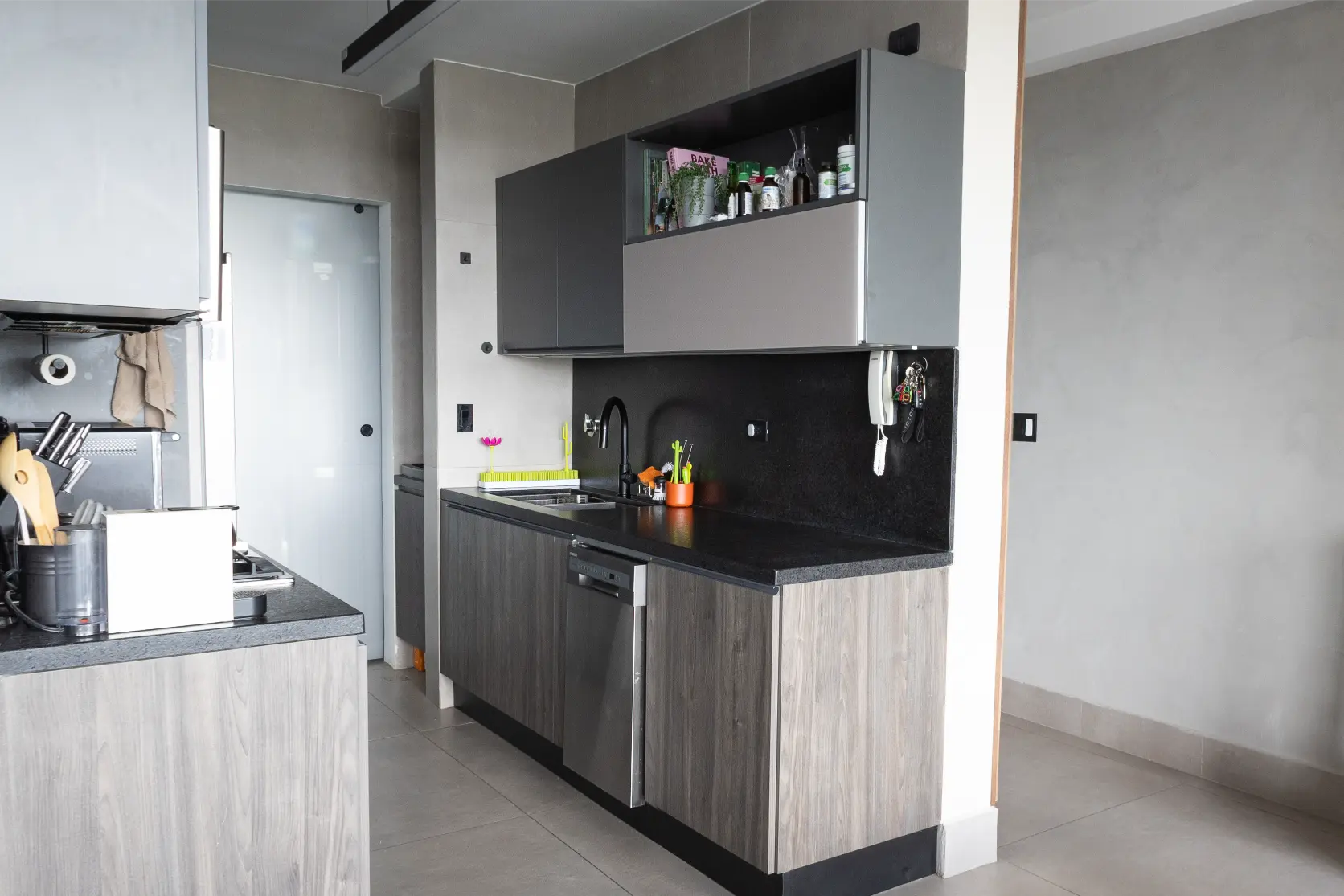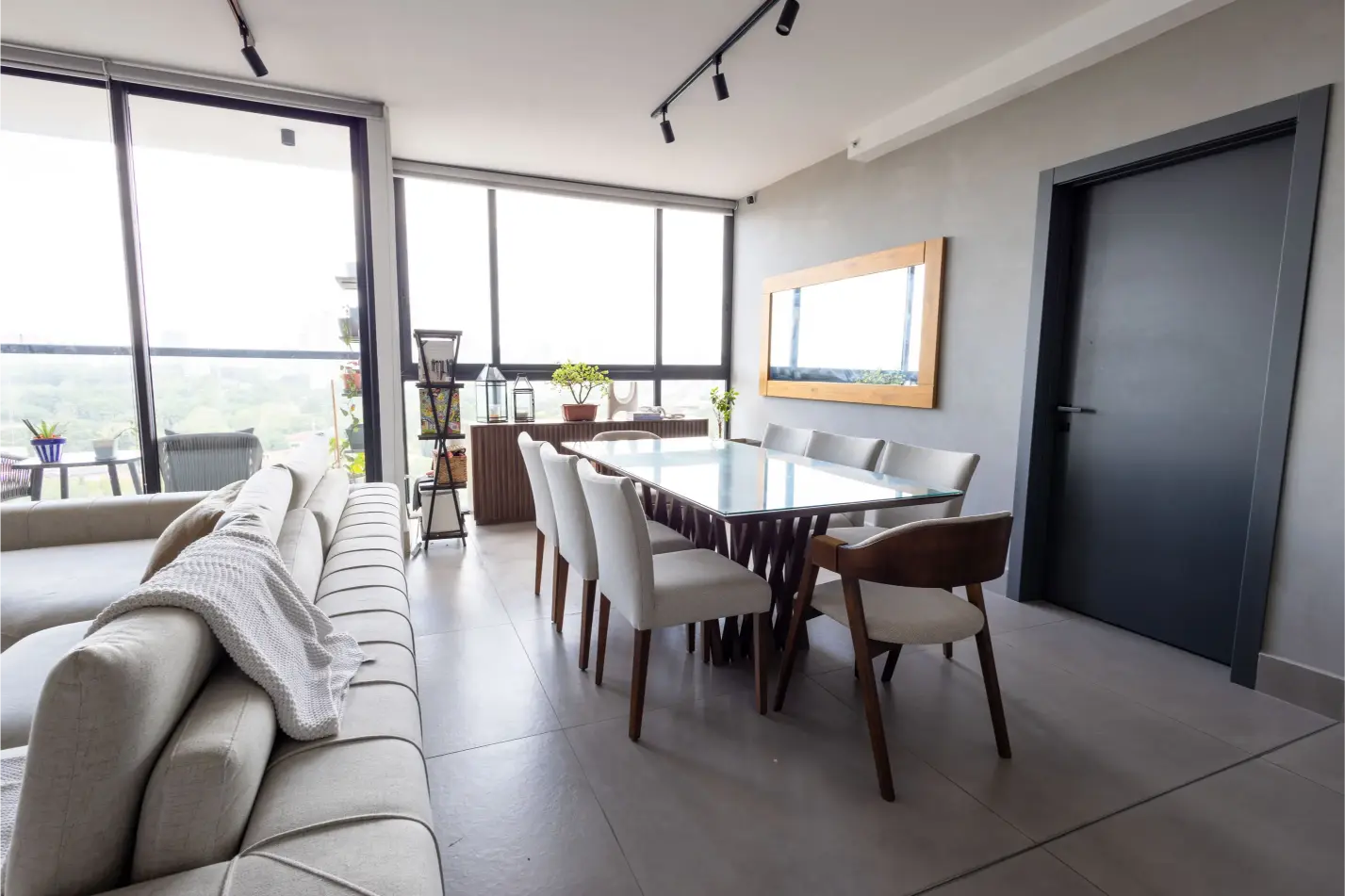 With 115 m² (1,238 ft²) of well-distributed space, the apartment features two spacious bedrooms, two full bathrooms, and a separate maid’s room with its own bathroom, offering flexibility and comfort. The interiors boast modern finishes, including a stylish microcement coating in the living and dining area, custom built-in furniture in the TV area and entryway, and high-quality roller blinds throughout. The kitchen comes equipped with modern appliances, and air conditioning units are already installed. The unit is unfurnished, allowing you to bring your personal style to this beautiful home, and it includes two dedicated parking spaces. The monthly rent also covers building maintenance and gas, adding extra value.