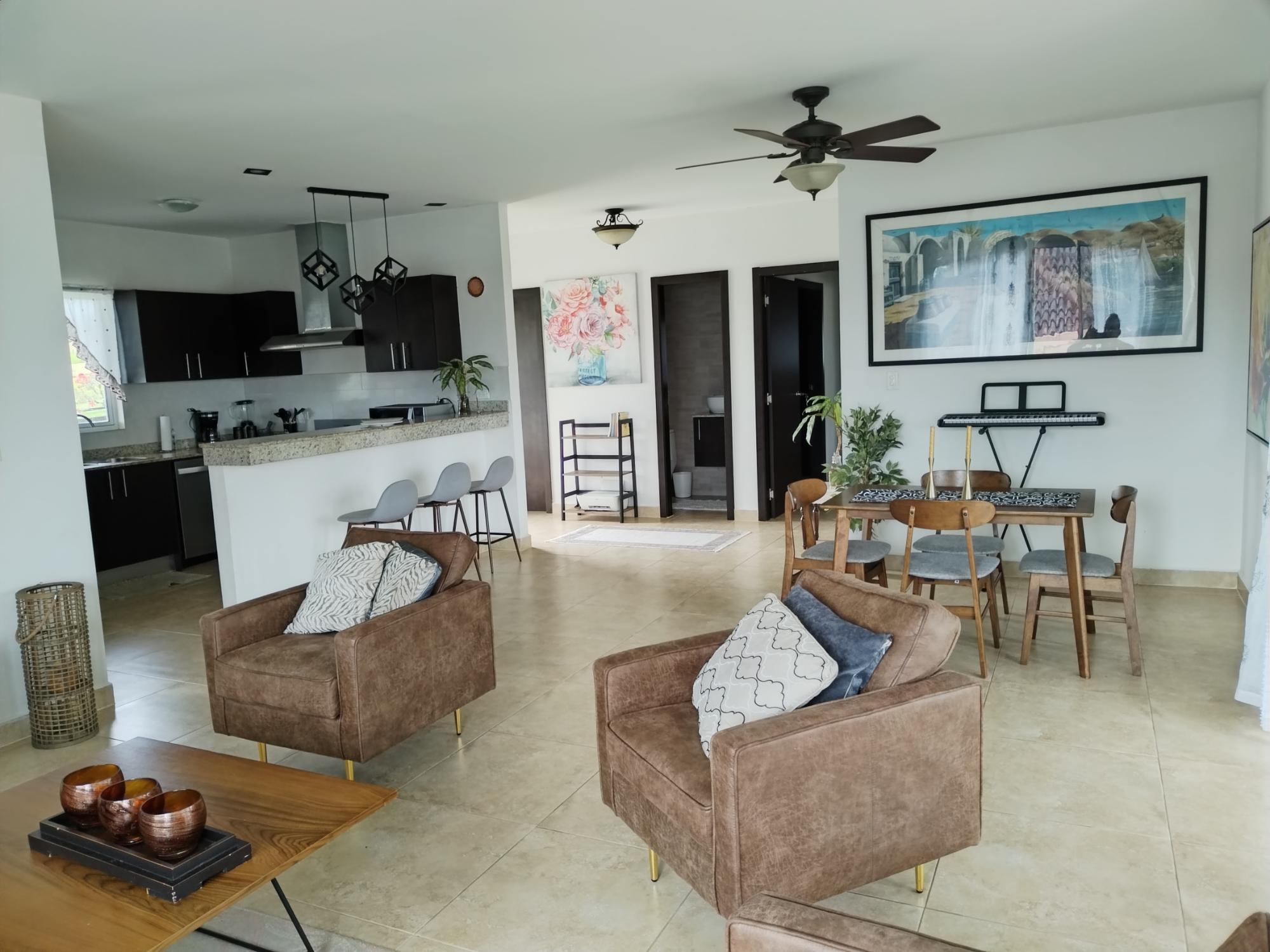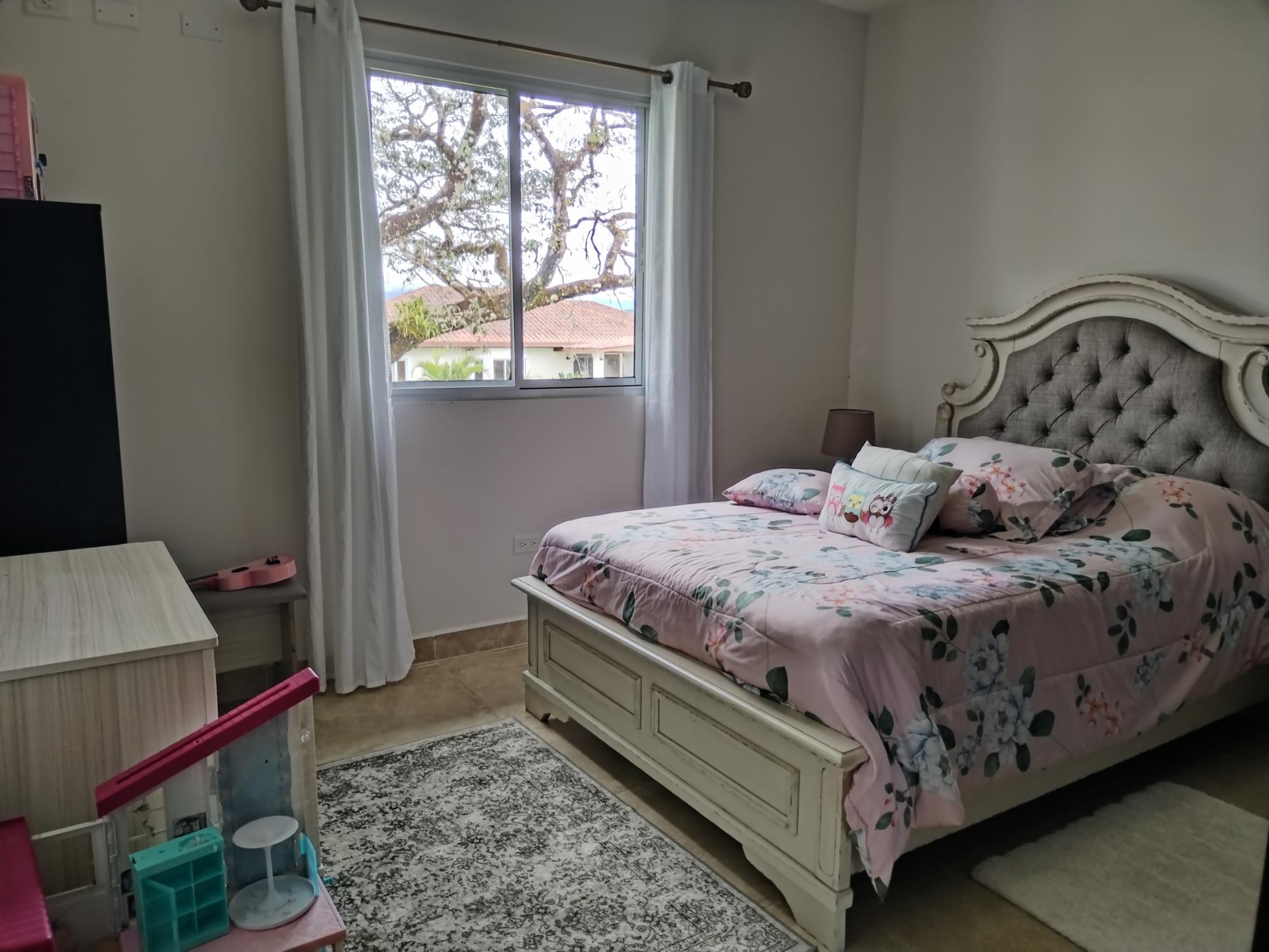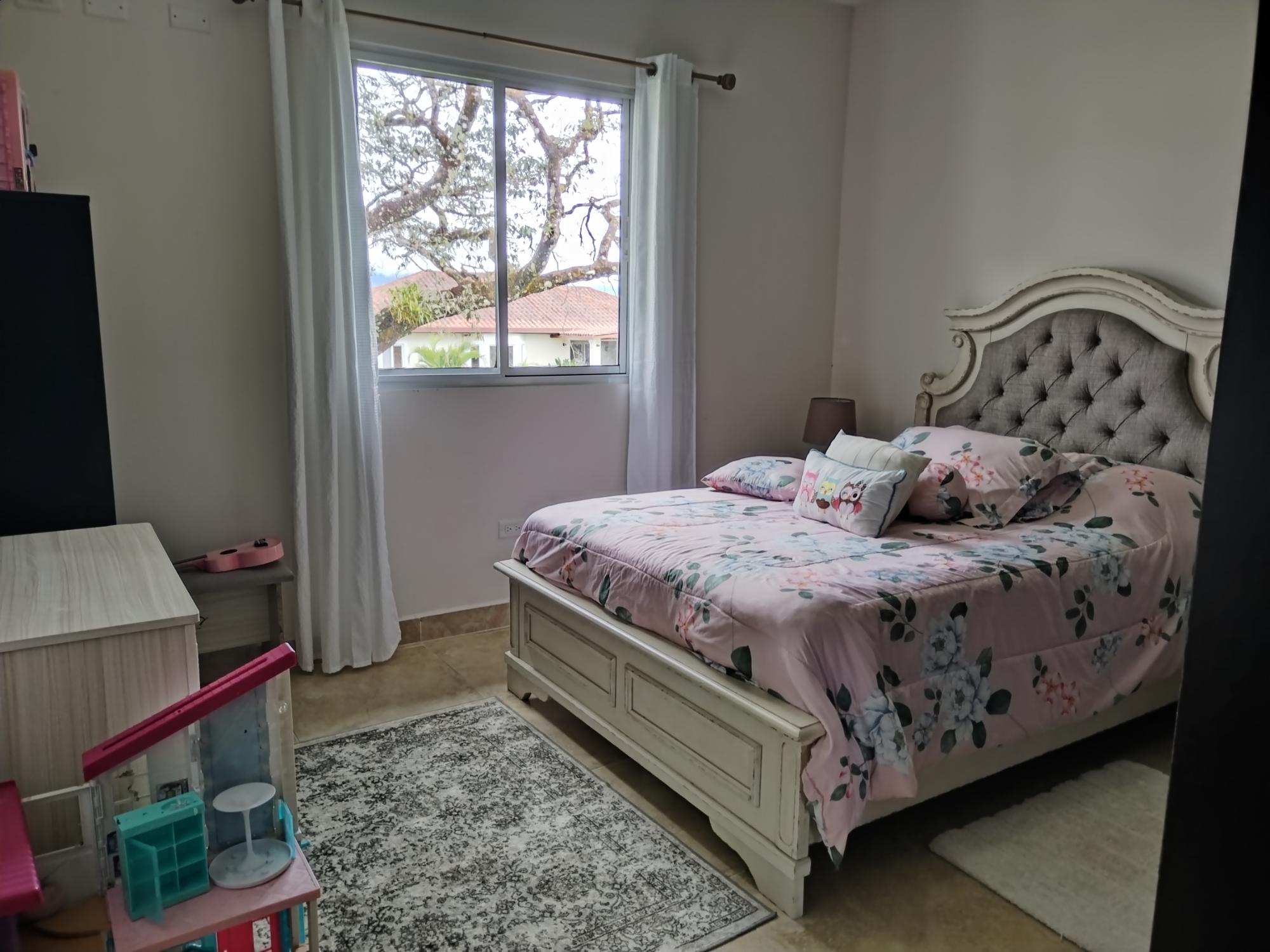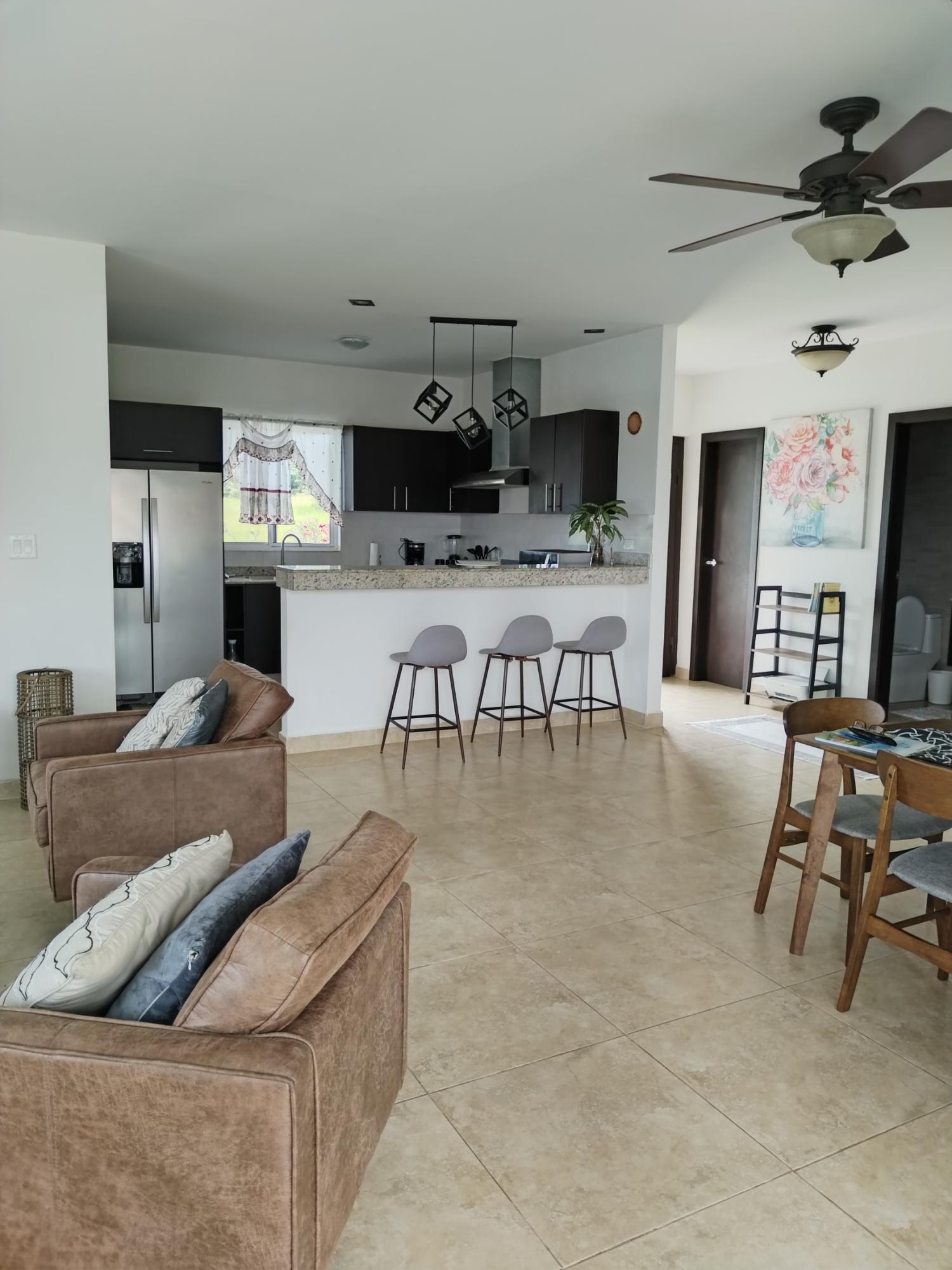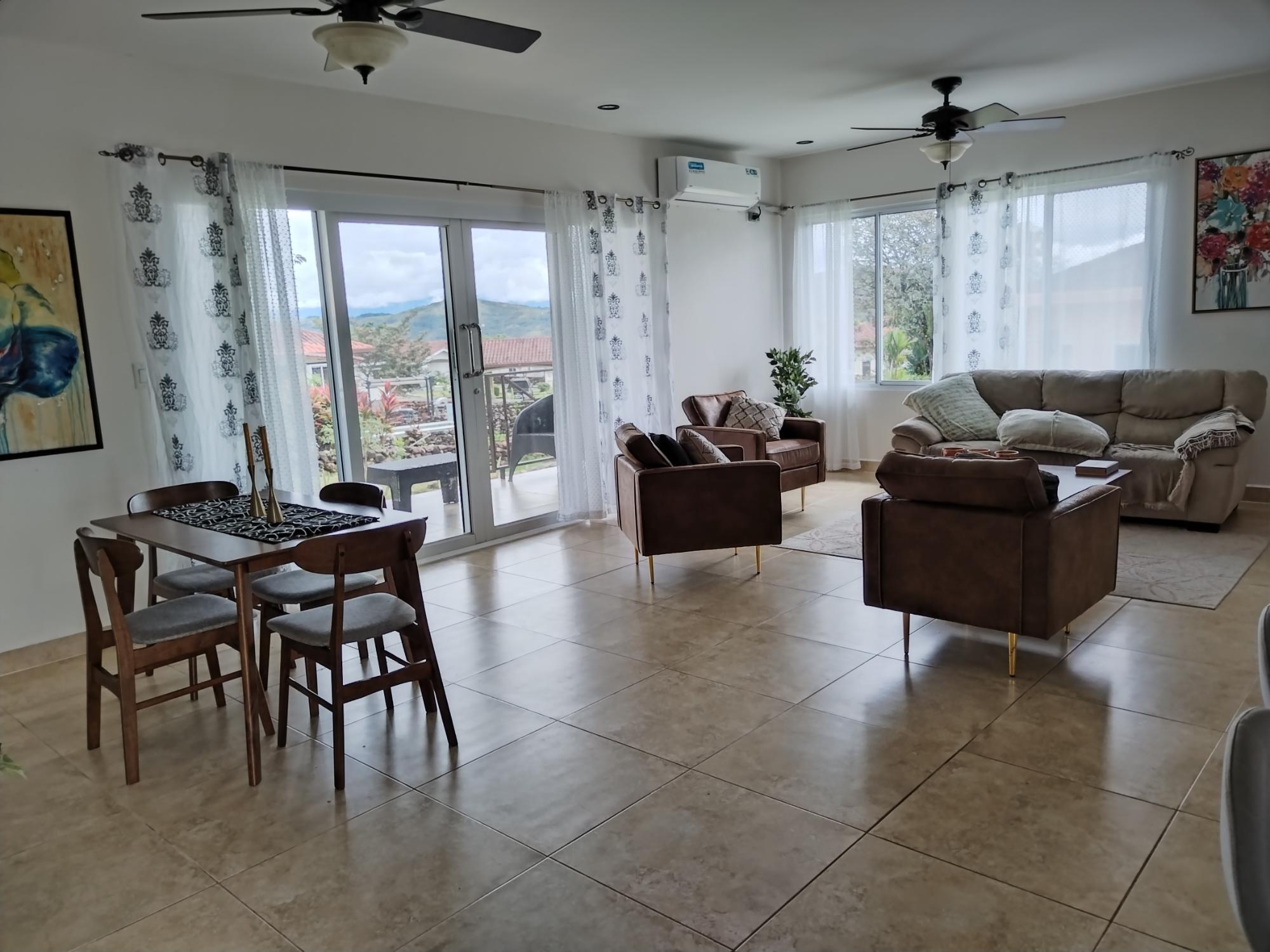 Located in the desirable Boquete Canyon Village, this 3-bedroom, 2.5-bathroom home offers a 1,500-square-meter flat lot with beautifully landscaped trees. Sold fully furnished, this property is ready for you to move in and start enjoying all that Boquete has to offer. The open-concept living and dining area connects seamlessly with the kitchen, making it a perfect space for both relaxation and entertaining. The kitchen is equipped with a breakfast bar and stools, along with a double-door refrigerator, dishwasher, stove, and hood. A glass door from the living area leads to the terrace, where you can unwind while taking in views of the mountains and the lush landscaping that surrounds the home.