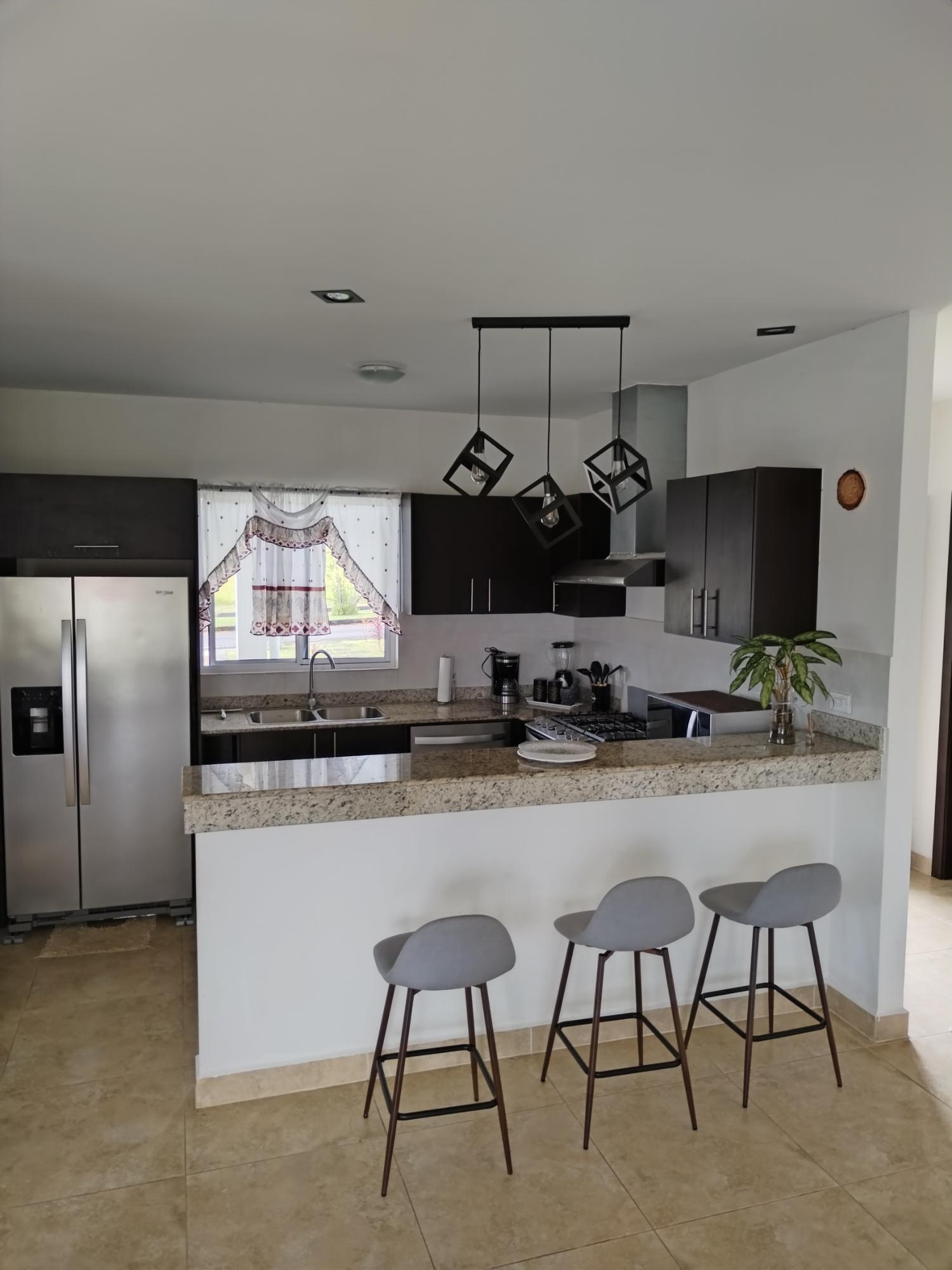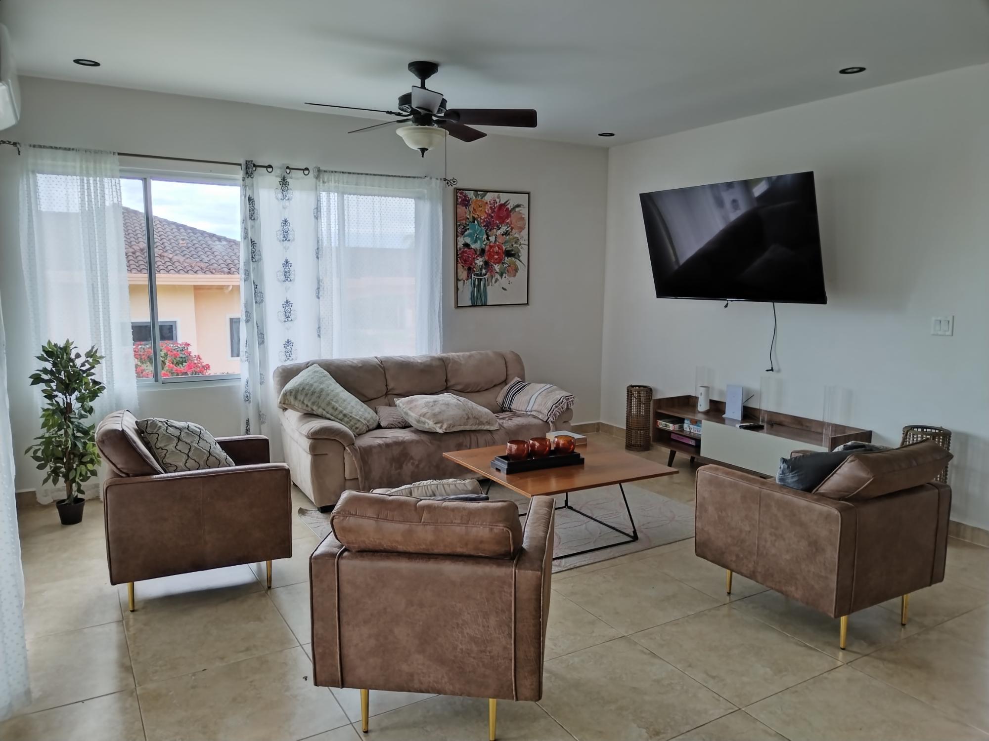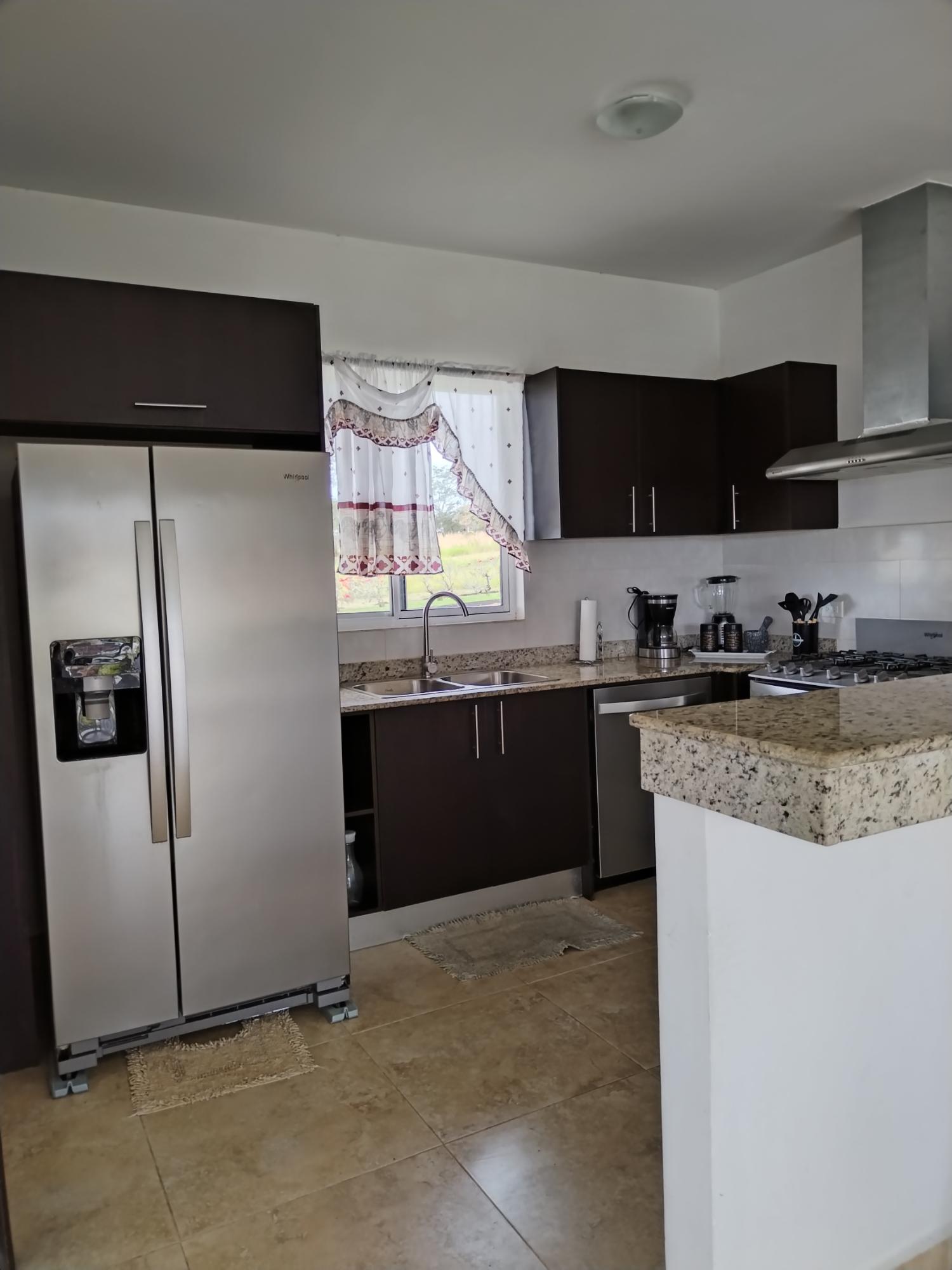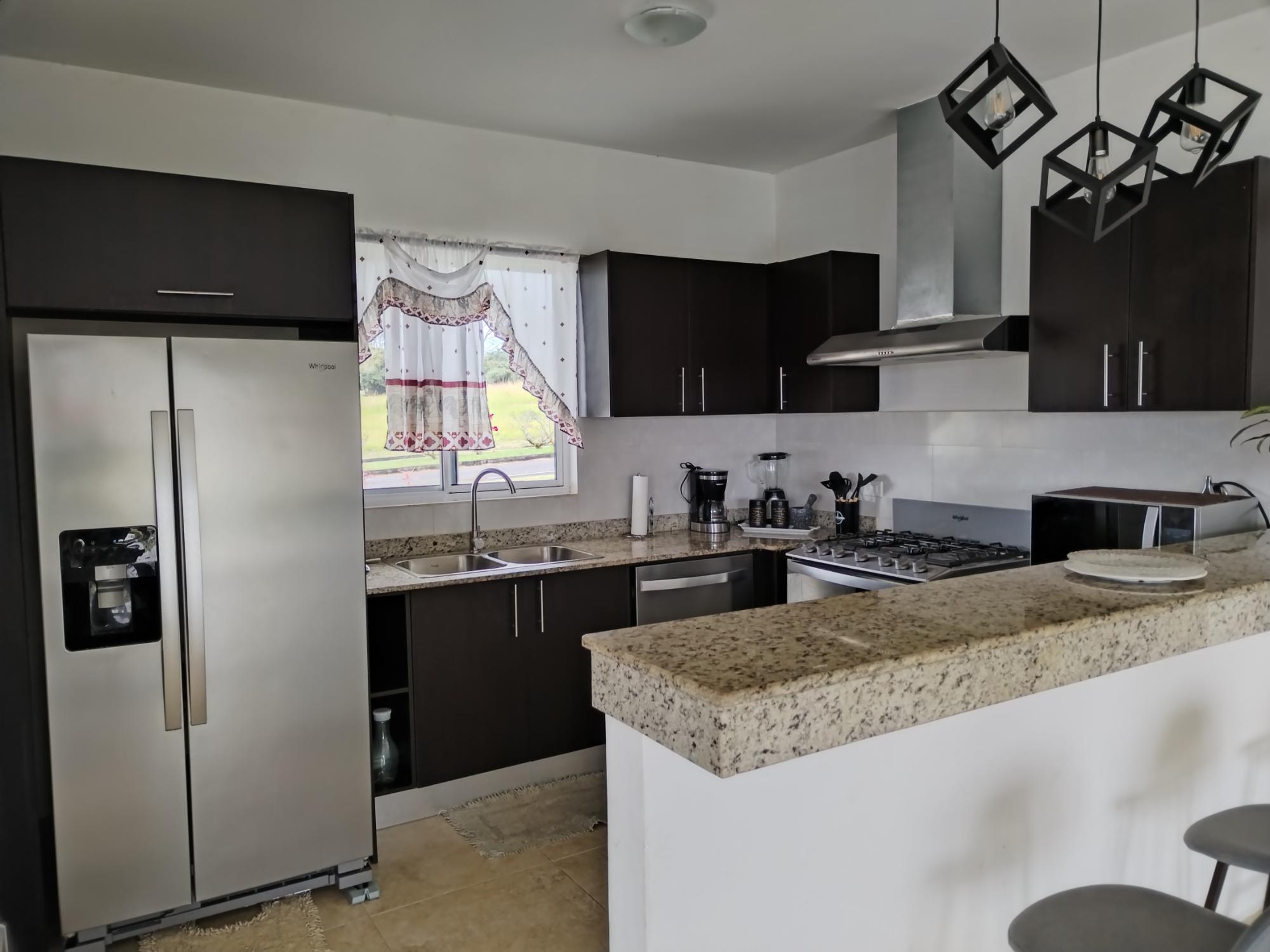 Located in the desirable Boquete Canyon Village, this 3-bedroom, 2.5-bathroom home offers a 1,500-square-meter flat lot with beautifully landscaped trees. Sold fully furnished, this property is ready for you to move in and start enjoying all that Boquete has to offer. The open-concept living and dining area connects seamlessly with the kitchen, making it a perfect space for both relaxation and entertaining. The kitchen is equipped with a breakfast bar and stools, along with a double-door refrigerator, dishwasher, stove, and hood. A glass door from the living area leads to the terrace, where you can unwind while taking in views of the mountains and the lush landscaping that surrounds the home.