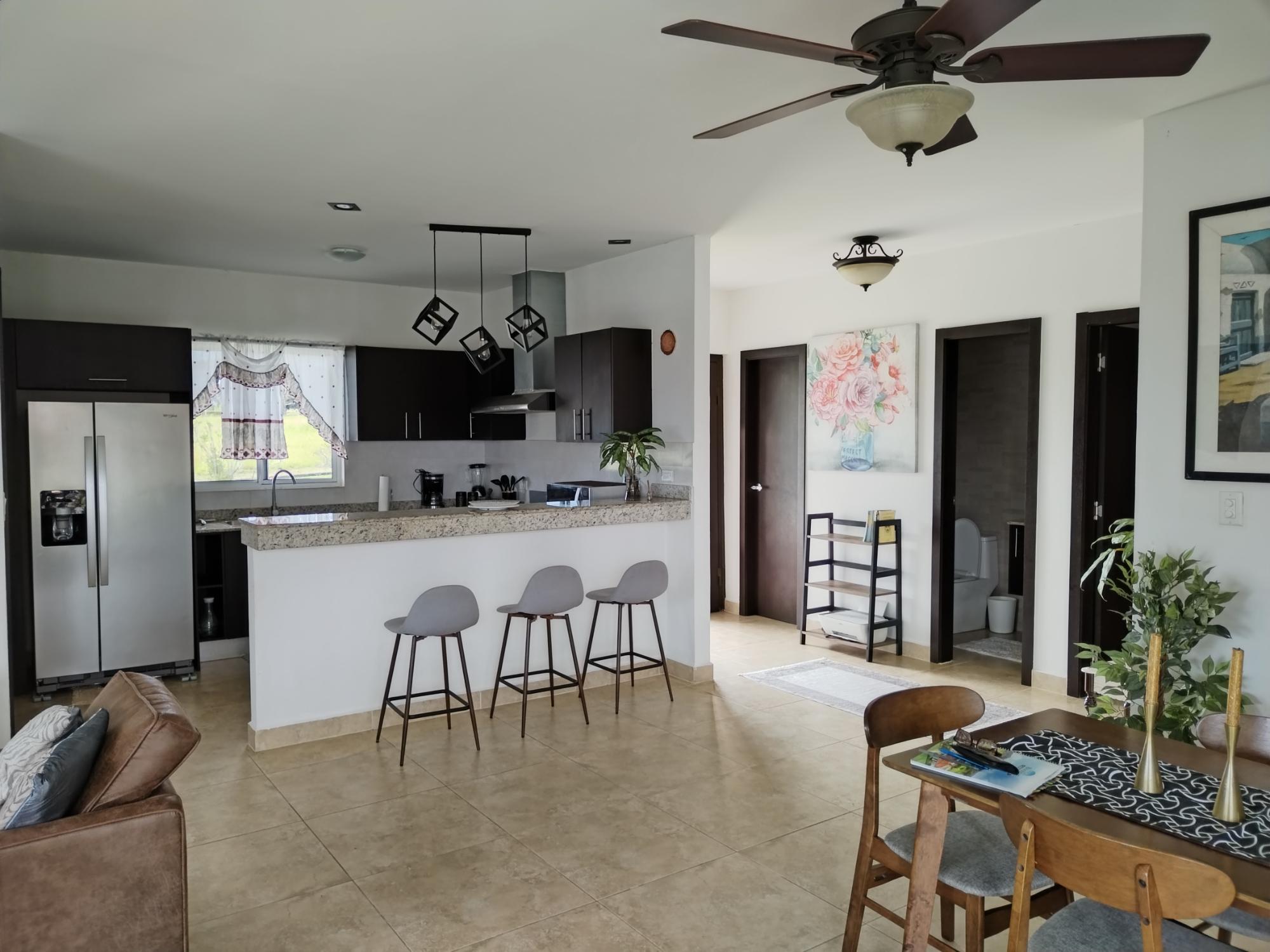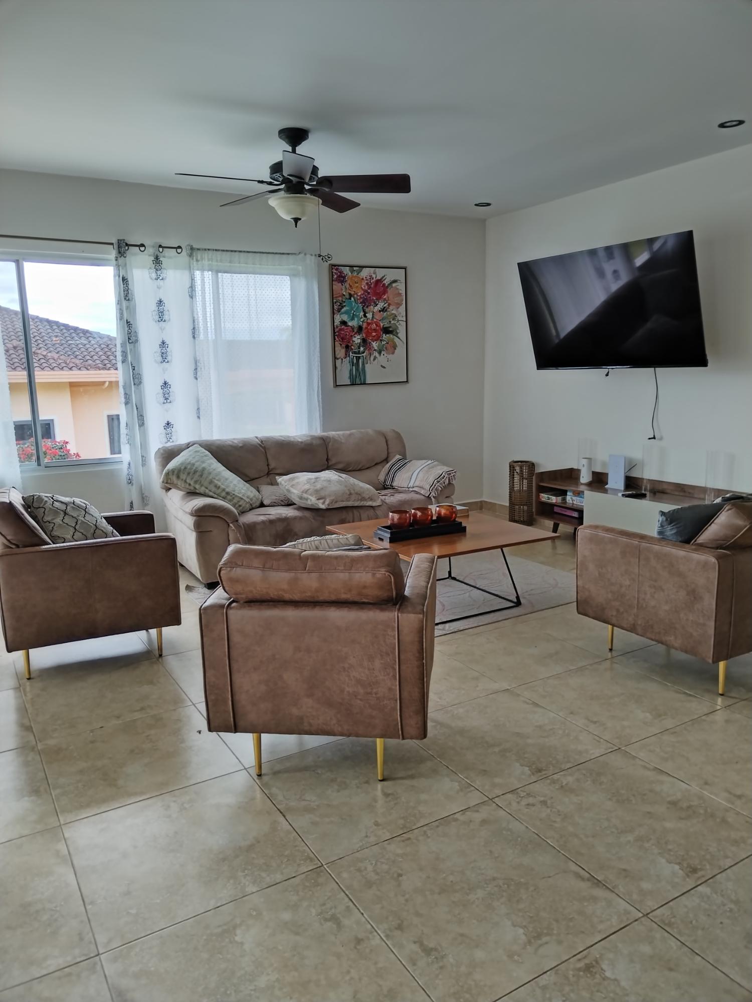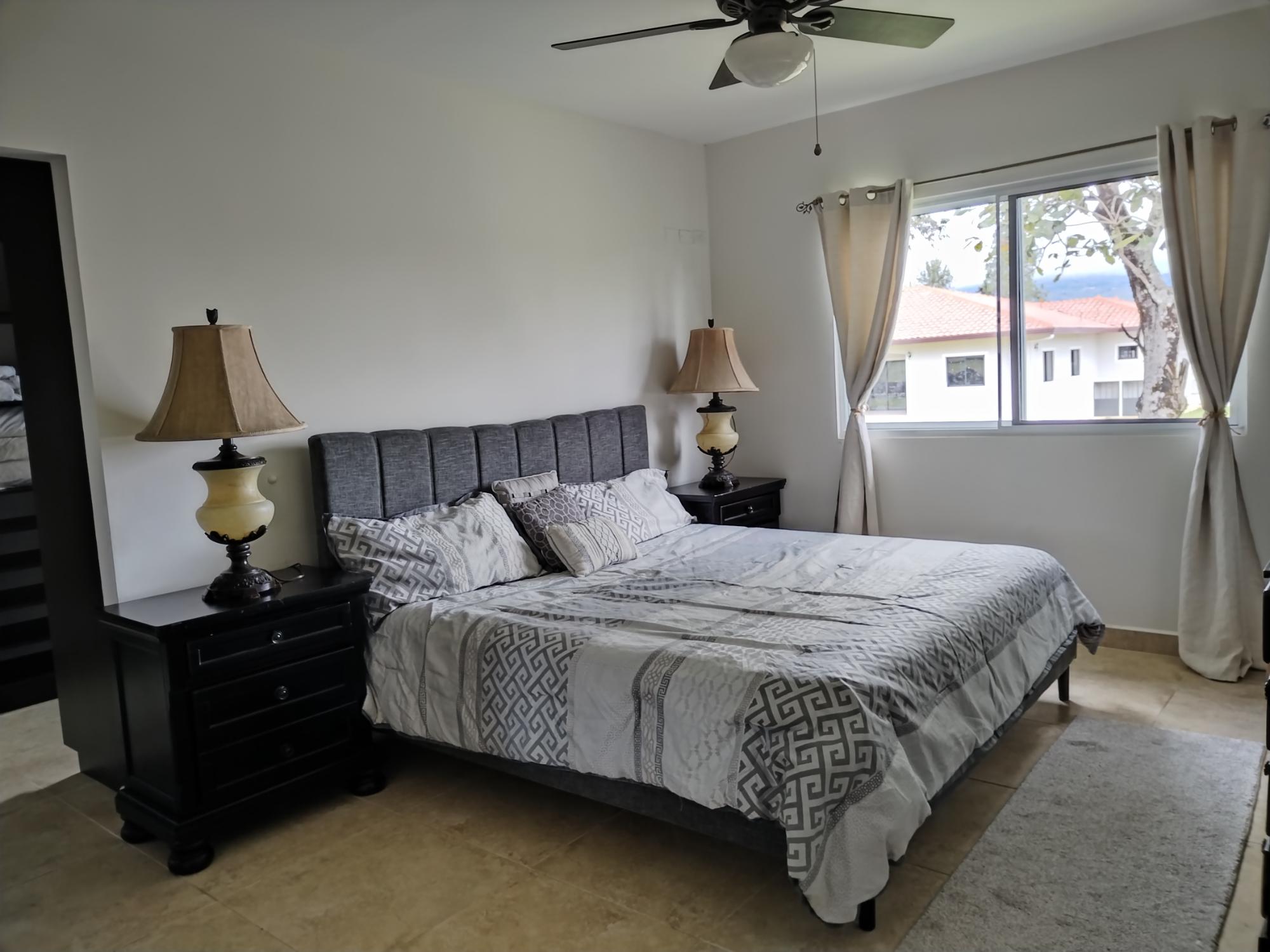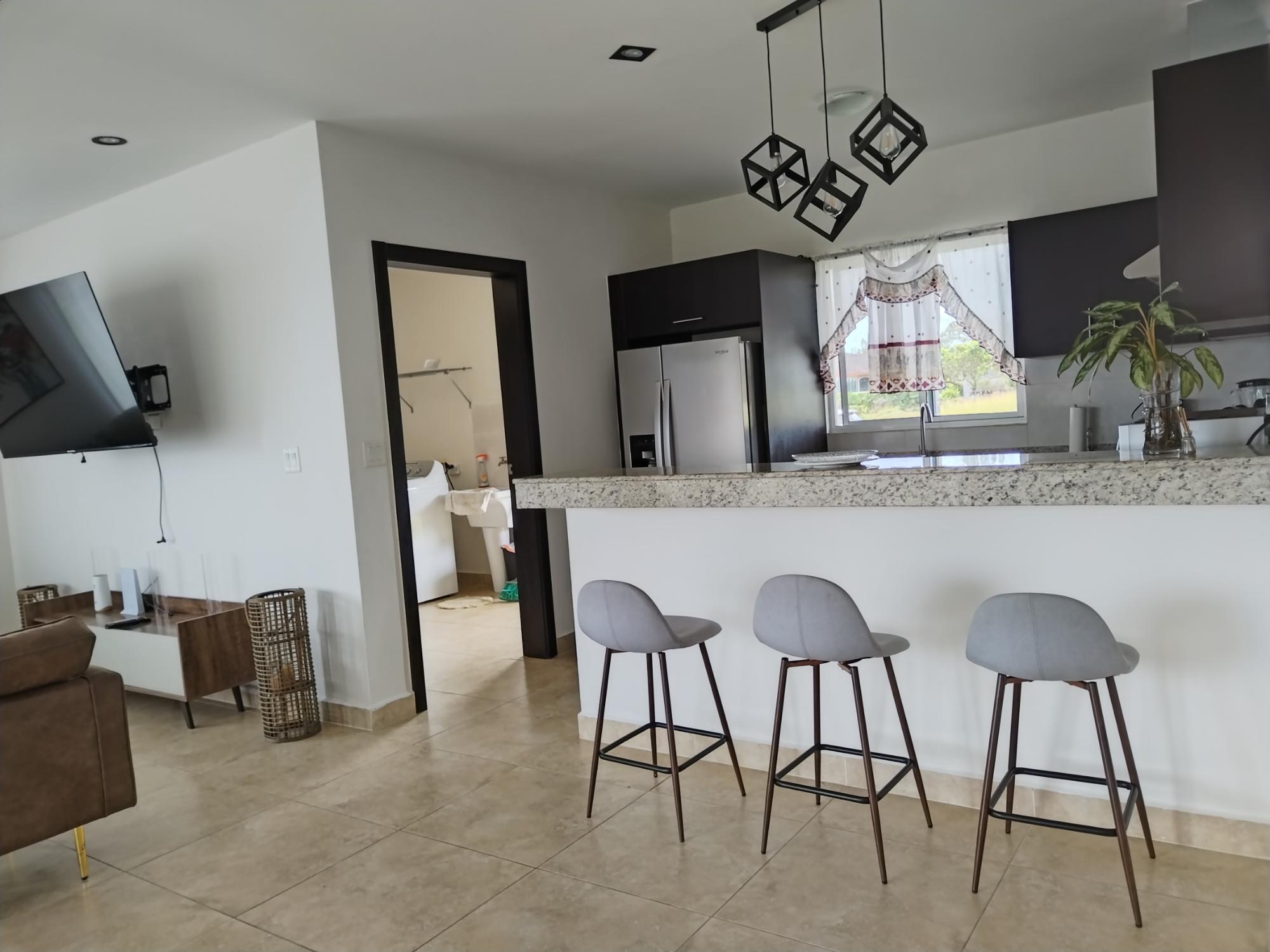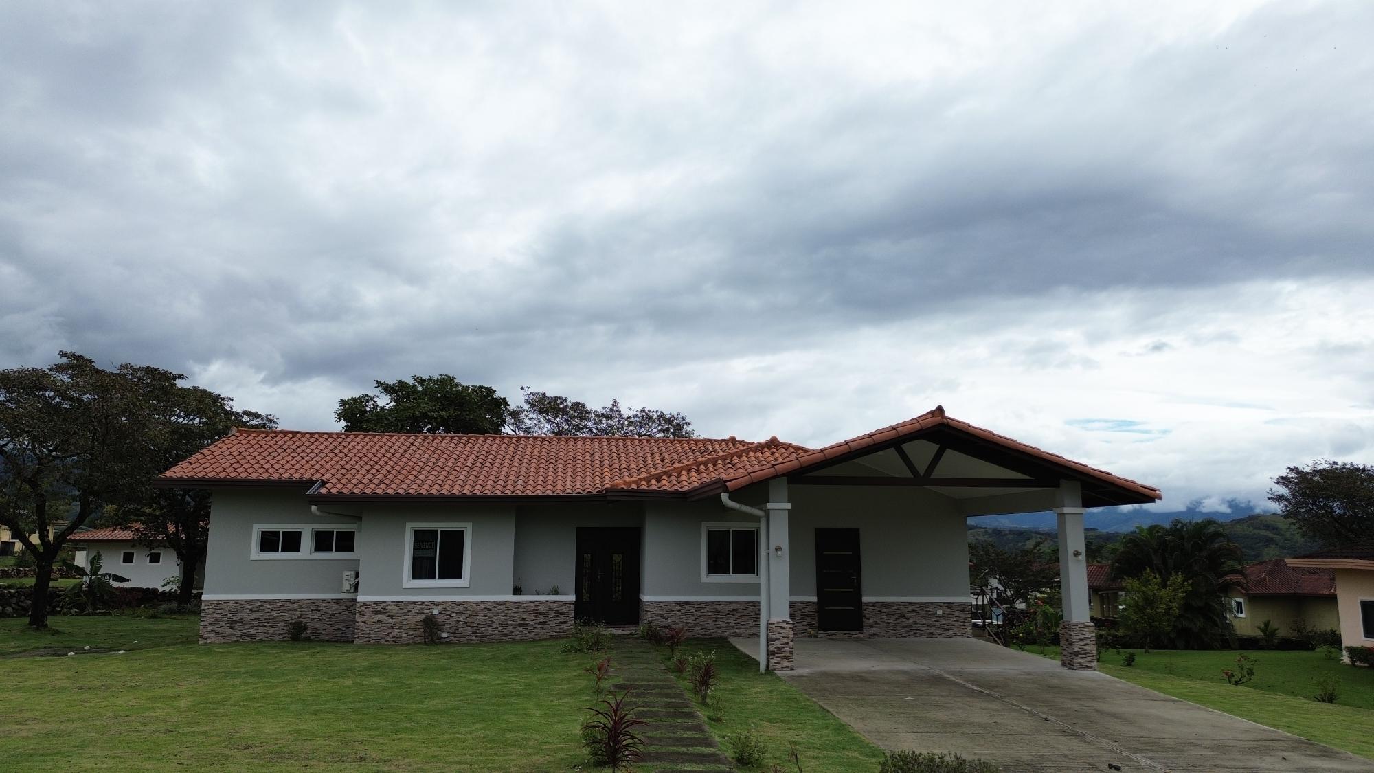 Located in the desirable Boquete Canyon Village, this 3-bedroom, 2.5-bathroom home offers a 1,500-square-meter flat lot with beautifully landscaped trees. Sold fully furnished, this property is ready for you to move in and start enjoying all that Boquete has to offer. The open-concept living and dining area connects seamlessly with the kitchen, making it a perfect space for both relaxation and entertaining. The kitchen is equipped with a breakfast bar and stools, along with a double-door refrigerator, dishwasher, stove, and hood. A glass door from the living area leads to the terrace, where you can unwind while taking in views of the mountains and the lush landscaping that surrounds the home.