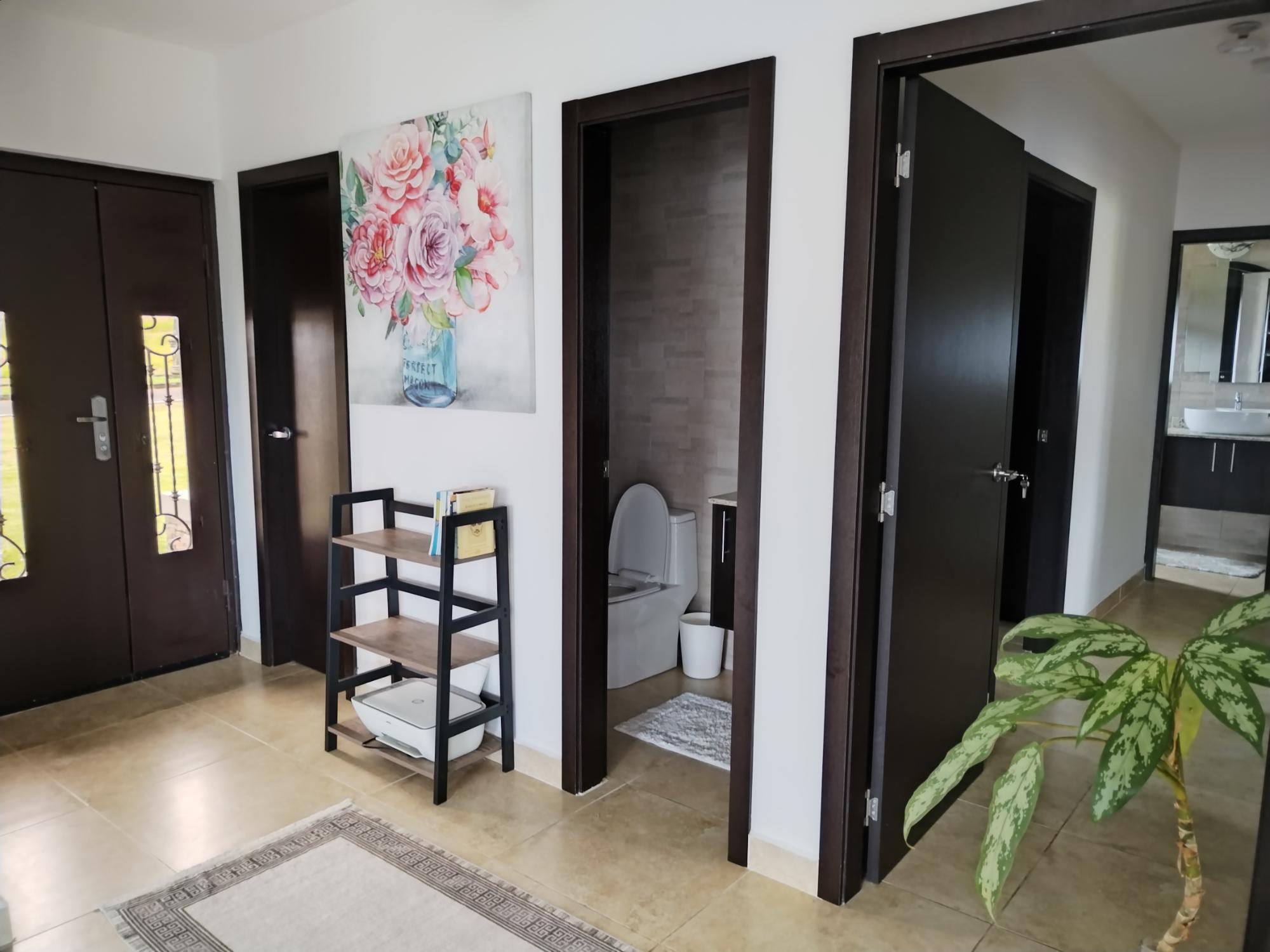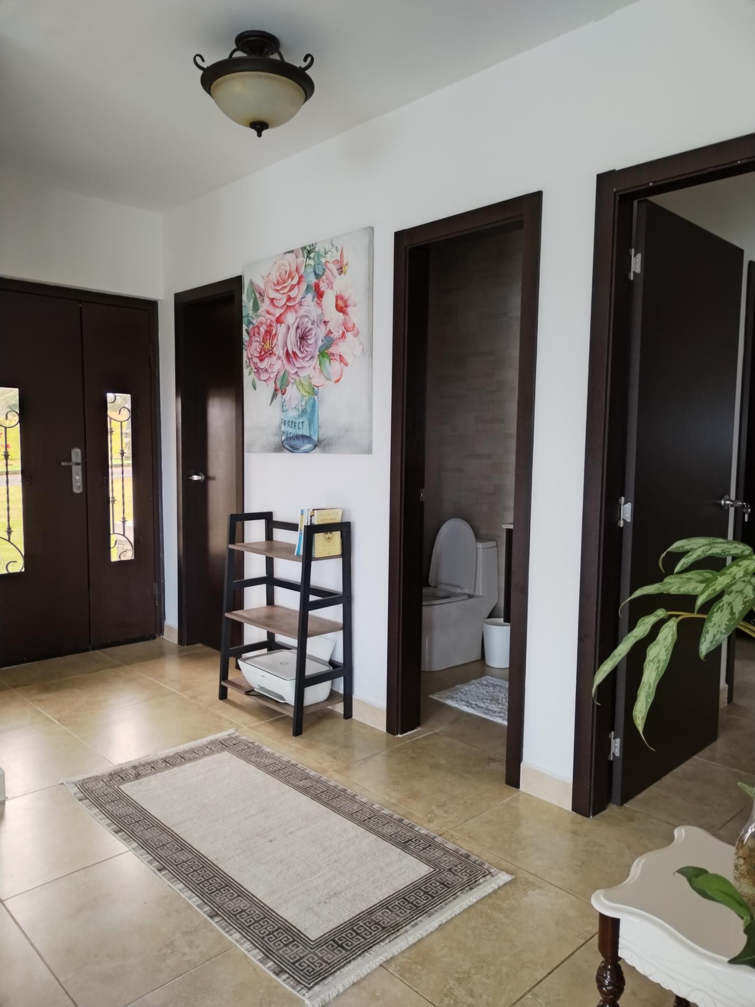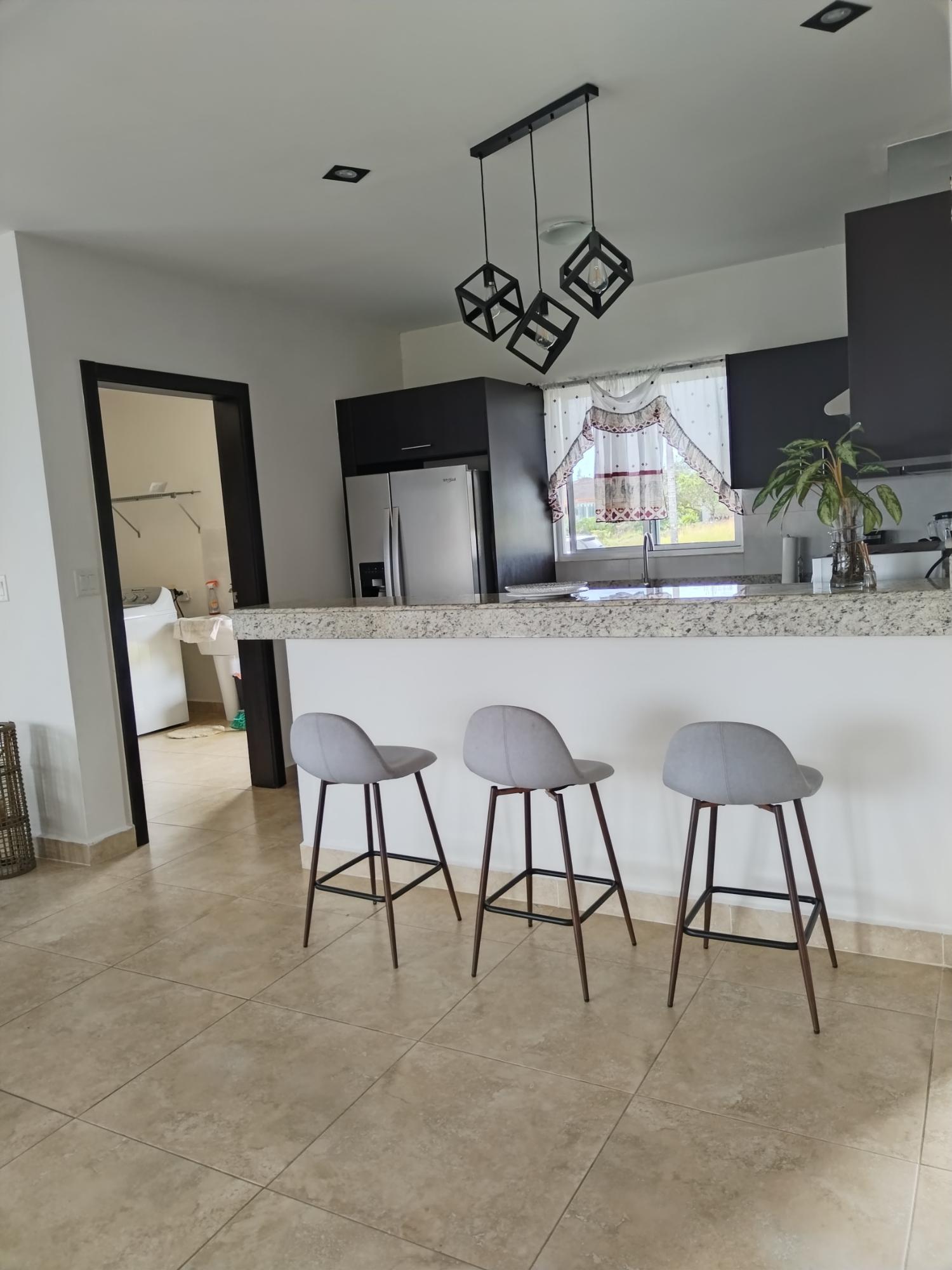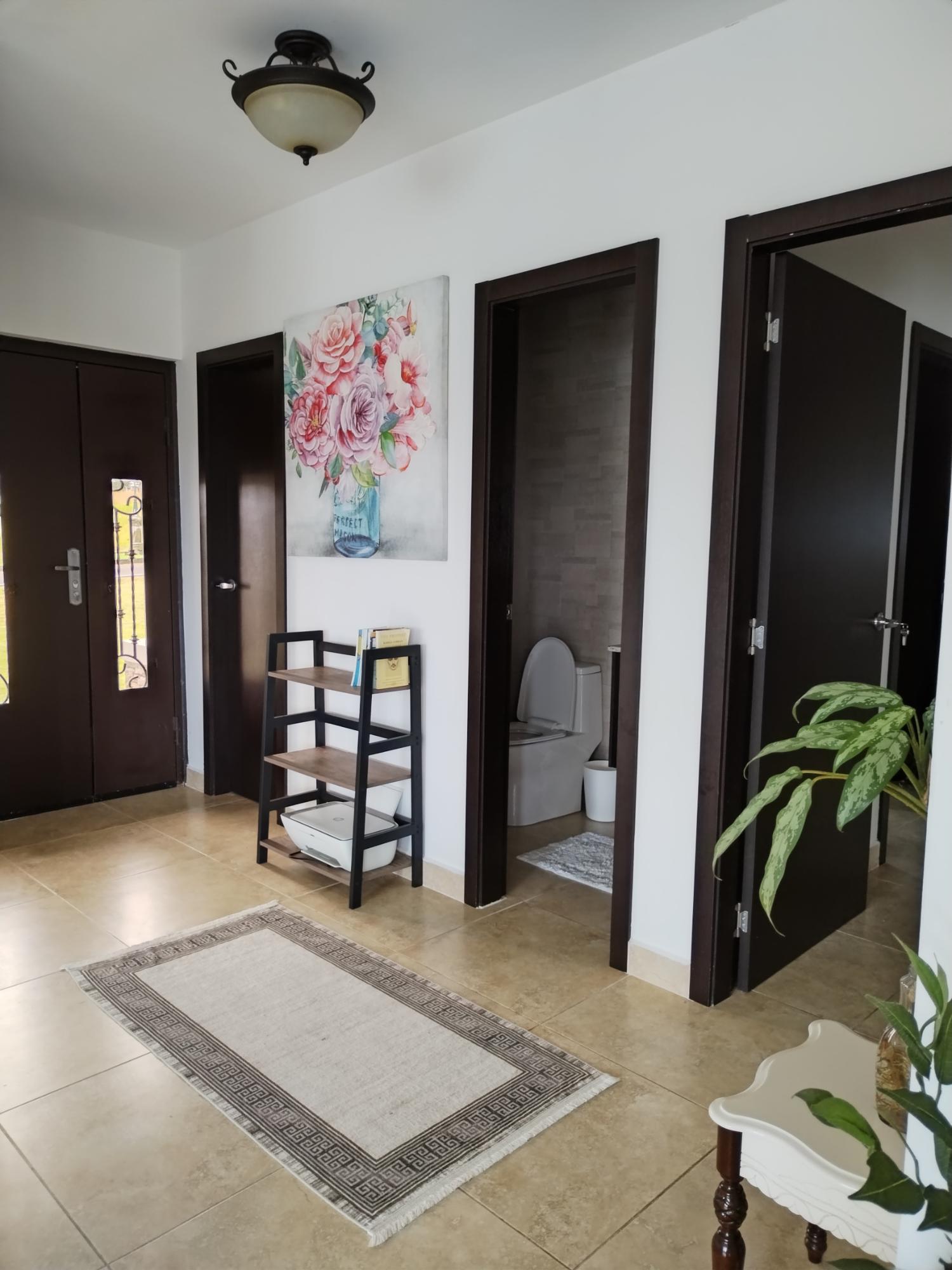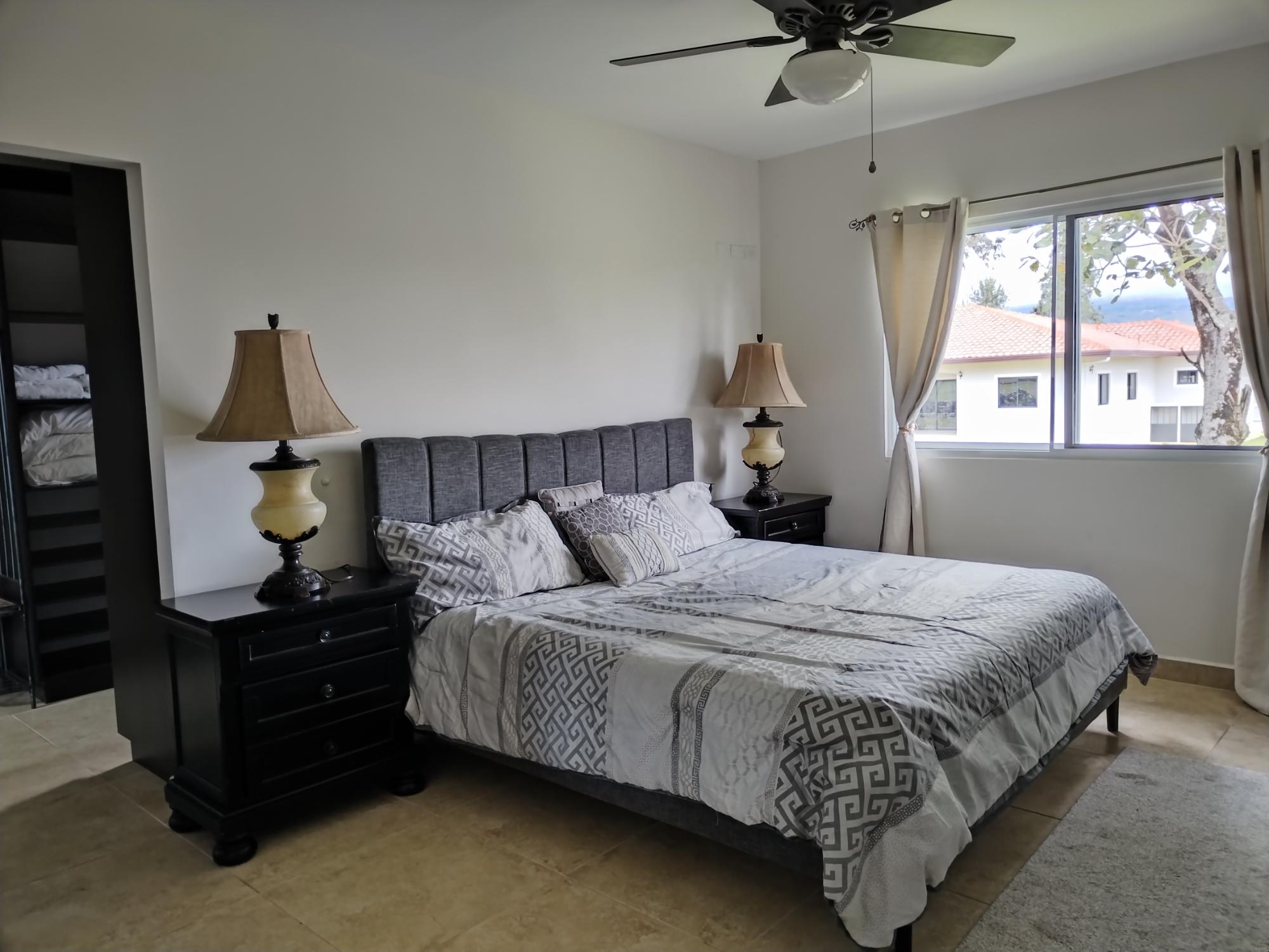 Located in the desirable Boquete Canyon Village, this 3-bedroom, 2.5-bathroom home offers a 1,500-square-meter flat lot with beautifully landscaped trees. Sold fully furnished, this property is ready for you to move in and start enjoying all that Boquete has to offer. The open-concept living and dining area connects seamlessly with the kitchen, making it a perfect space for both relaxation and entertaining. The kitchen is equipped with a breakfast bar and stools, along with a double-door refrigerator, dishwasher, stove, and hood. A glass door from the living area leads to the terrace, where you can unwind while taking in views of the mountains and the lush landscaping that surrounds the home.