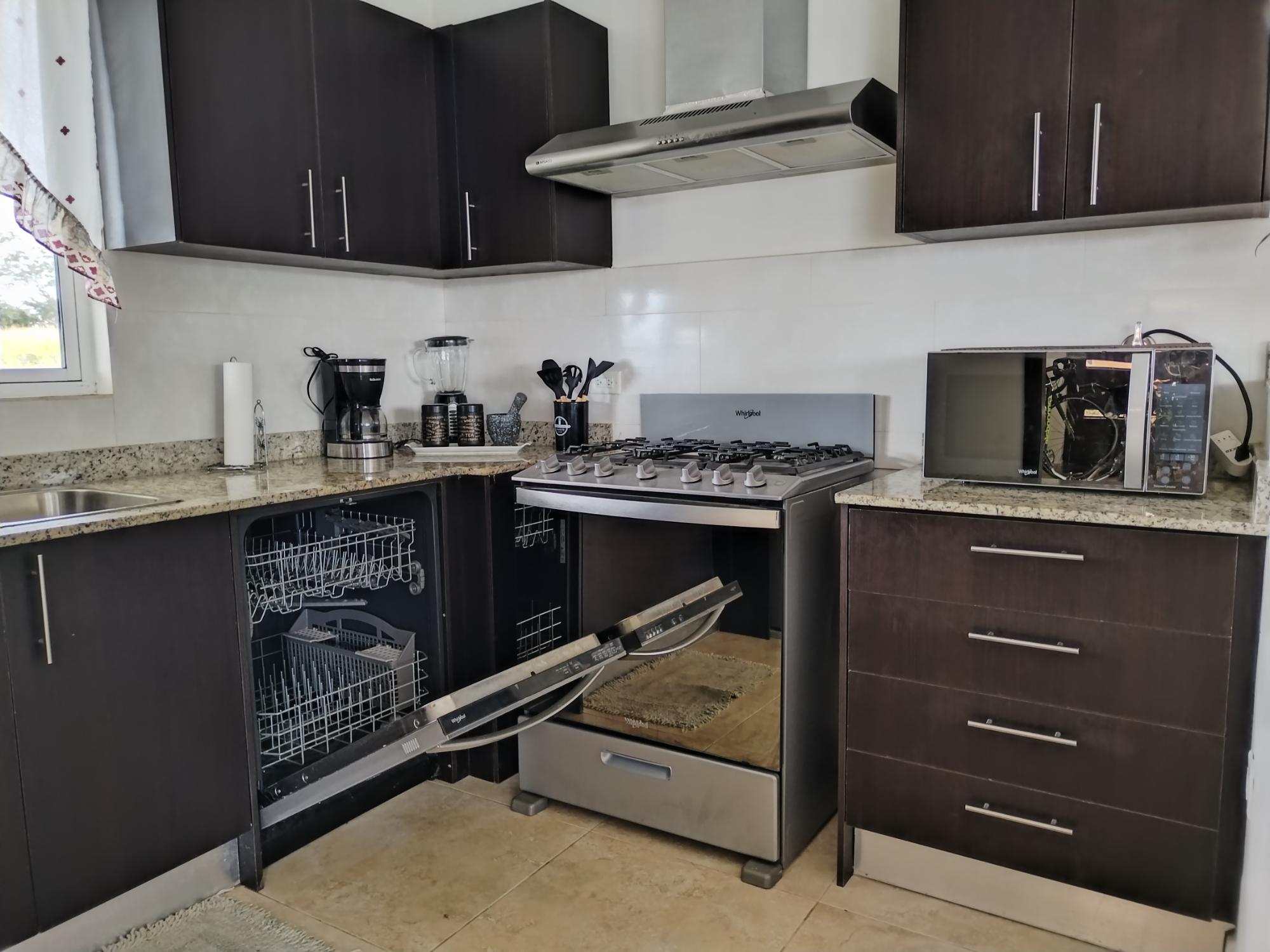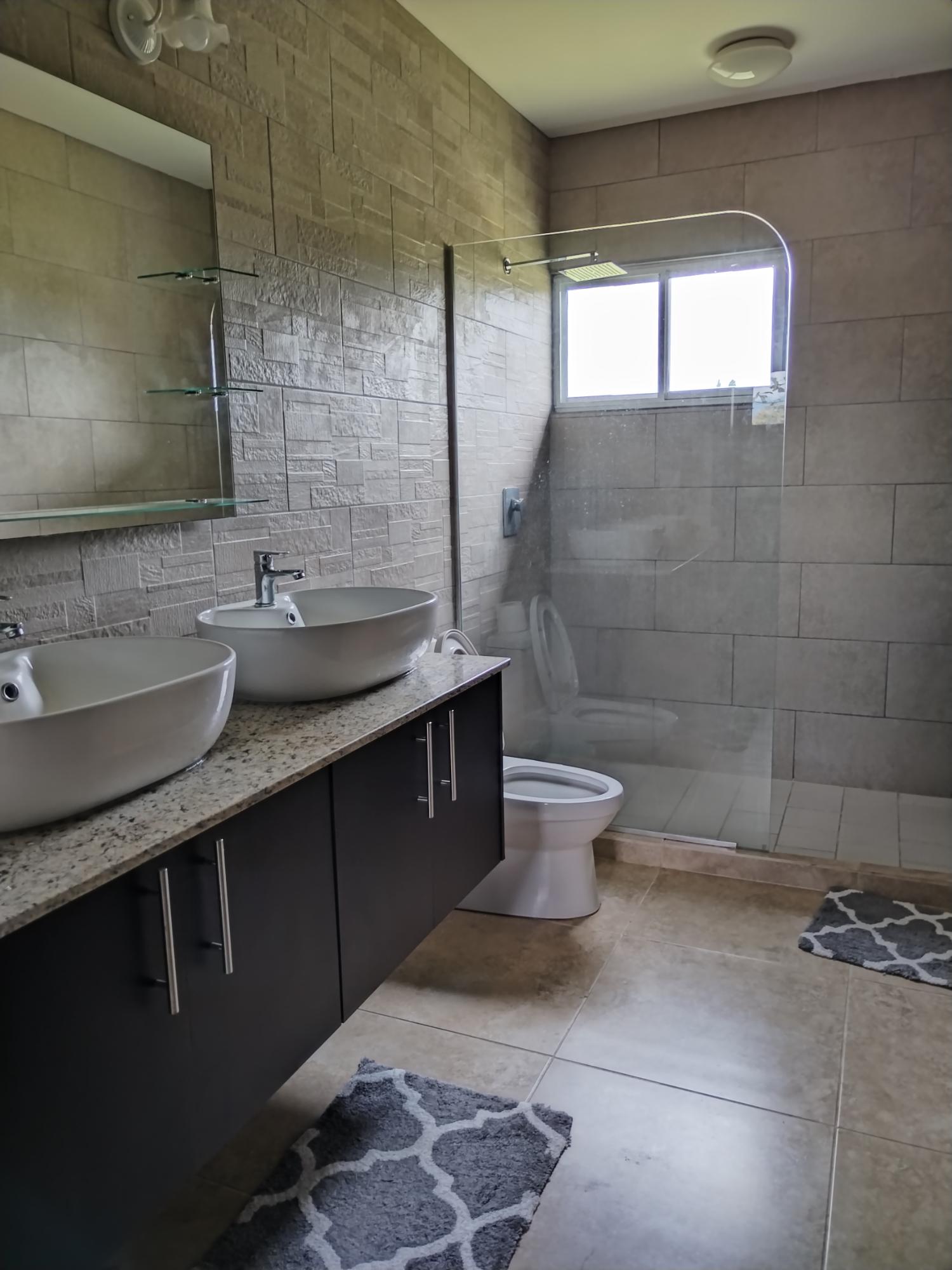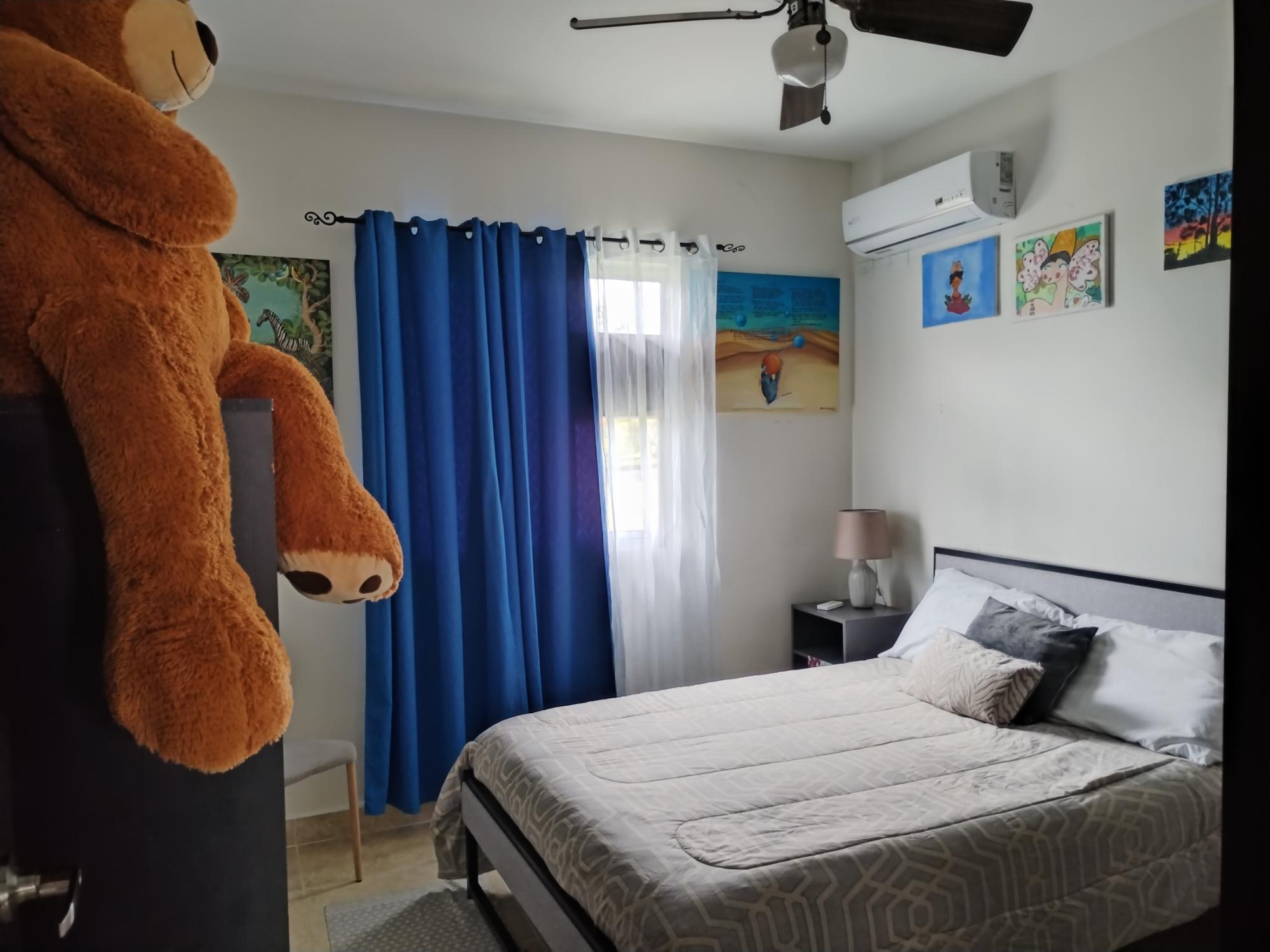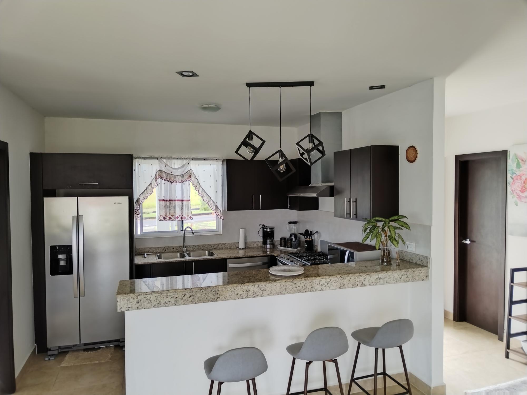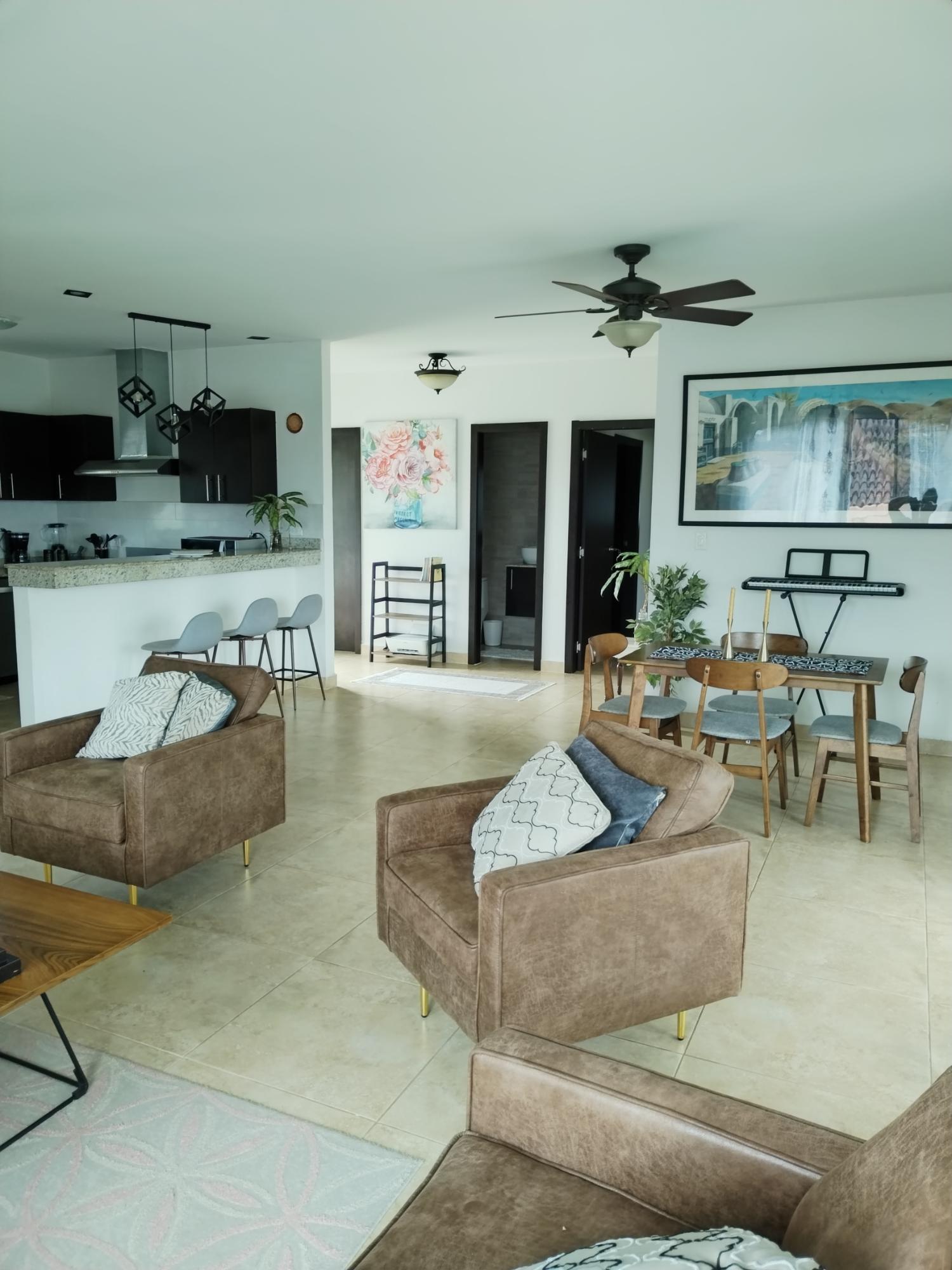 Located in the desirable Boquete Canyon Village, this 3-bedroom, 2.5-bathroom home offers a 1,500-square-meter flat lot with beautifully landscaped trees. Sold fully furnished, this property is ready for you to move in and start enjoying all that Boquete has to offer. The open-concept living and dining area connects seamlessly with the kitchen, making it a perfect space for both relaxation and entertaining. The kitchen is equipped with a breakfast bar and stools, along with a double-door refrigerator, dishwasher, stove, and hood. A glass door from the living area leads to the terrace, where you can unwind while taking in views of the mountains and the lush landscaping that surrounds the home.