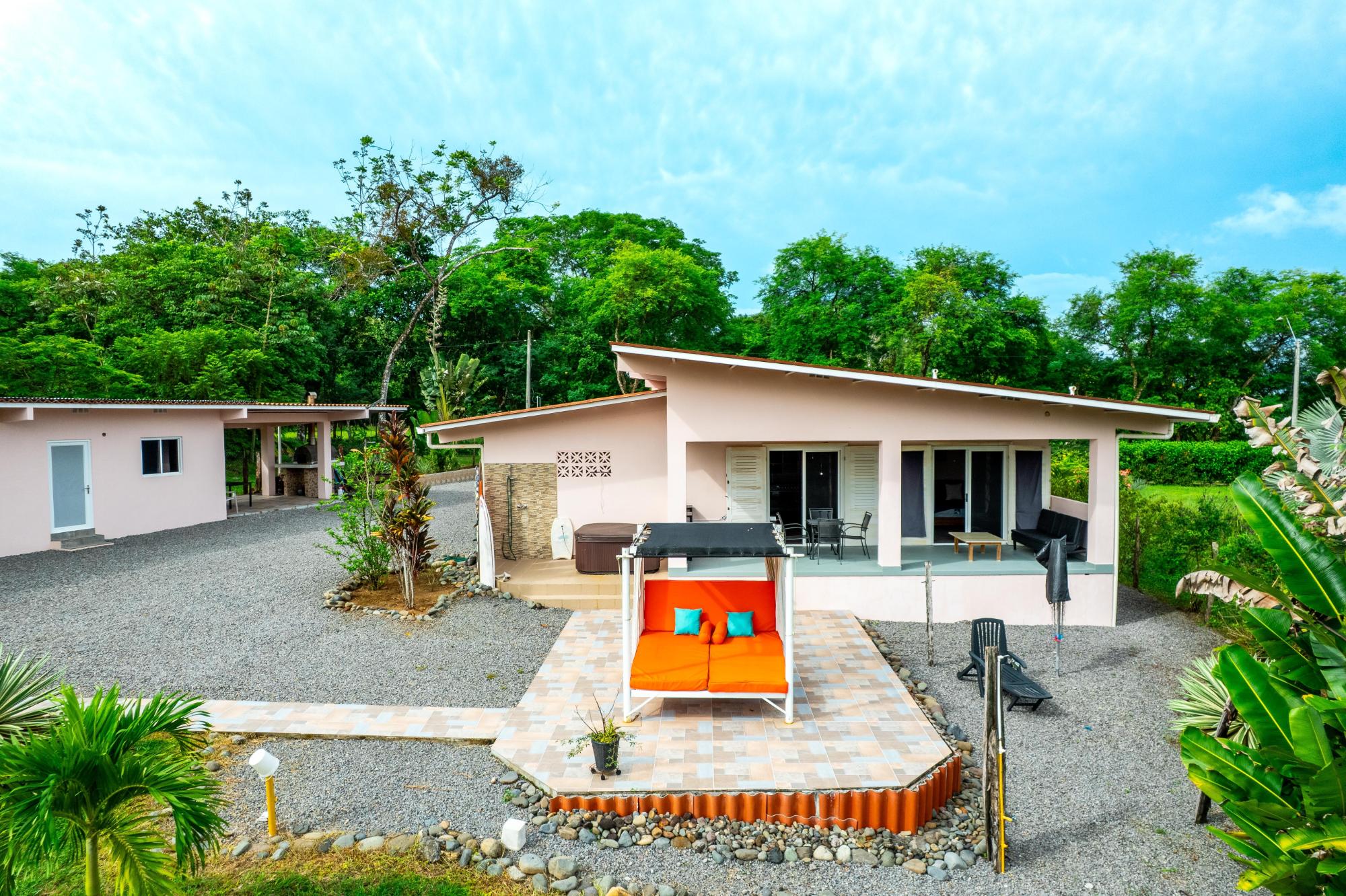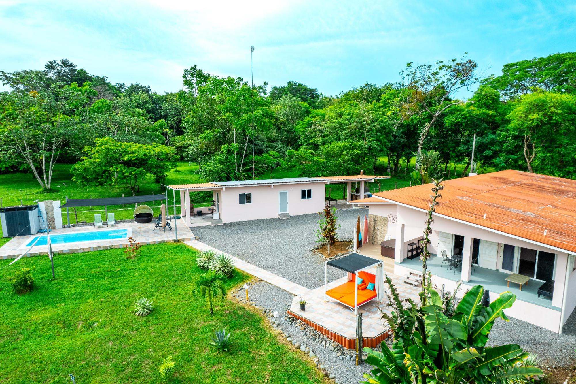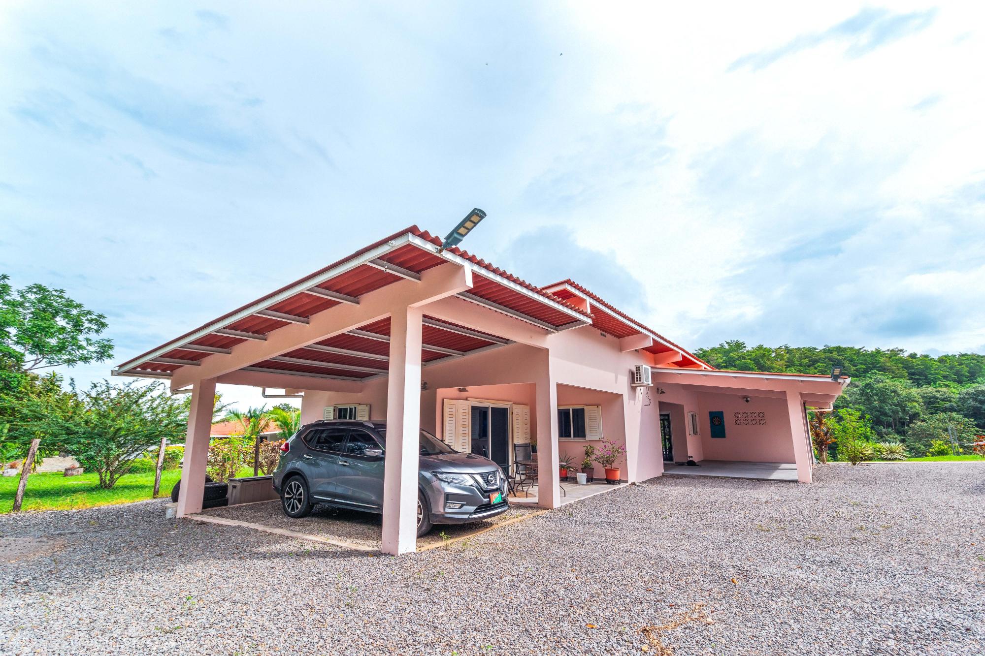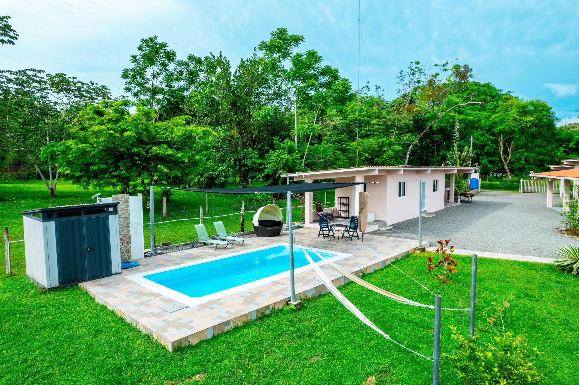 Welcome to this beautiful, fully furnished house that can be used perfectly as a family home or duplex. The property is situated in a peaceful, green landscape just a few minutes from the beach, offering an ideal combination of nature and comfort. Enjoy the amenities in your private restort in the middle of a spacious tropical garden. Relax at your sun-protected pool on the comfort canvas chairs, in the sun-proteced hammock or pavilion. An outdoor shower and a pool equippment shed are also at the pool deck. For social evenings, there is a table tennis table, hammock setups, and a treadmill. Additionally, a Jacuzzi, stone oven, and stainless steel grill provide outdoor culinary highlights. The home features a modern kitchen with refrigerator and drinking water filter, as well as a washer and dryer. Fans and central air conditioning provide comfort year-round. The property is fully fenced and includes its own driveway, two covered parking spaces with an electric gate, and a garden house. Another highlight is the second house with two rooms, which can be used in various ways—such as for rental purposes. The estate is equipped with power, water, and Starlink internet, and has a rainwater tank for watering. A true paradise for nature lovers and families who wish to enjoy life in the green in a peaceful environment! Adjacent to the garden, there is additional land with its own well, a small river, and a small forest area, which can be purchased separately. This property also offers an adjoining plot of land with its own well, a small river, and a small forest.