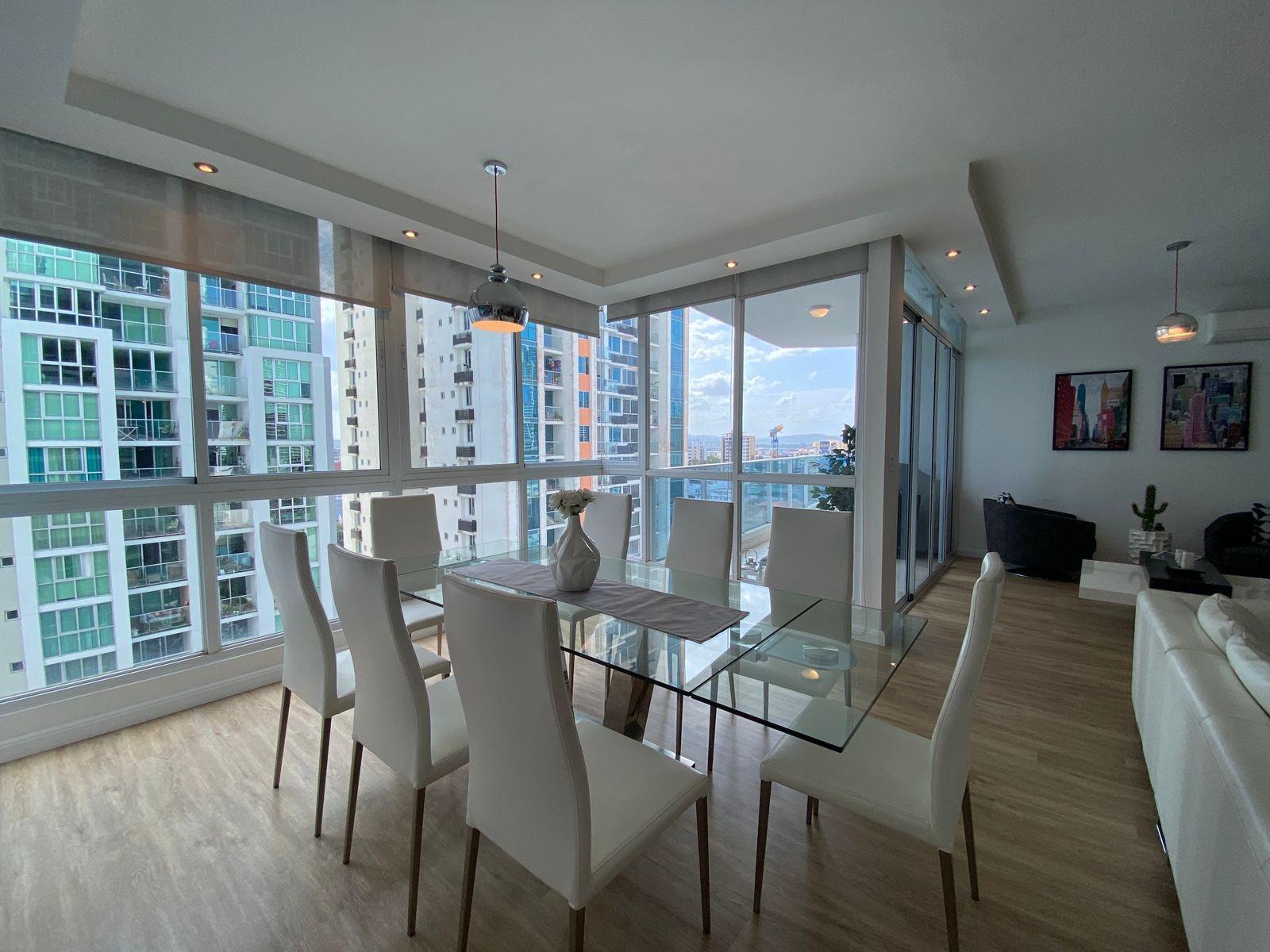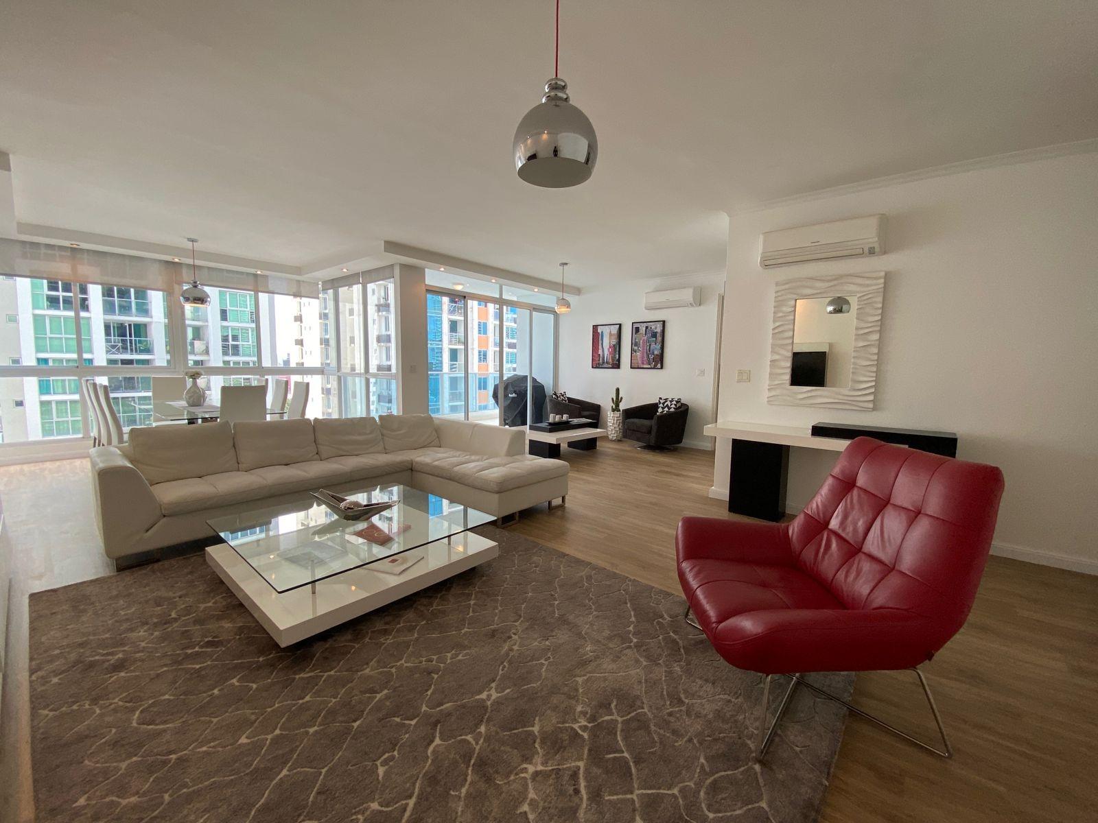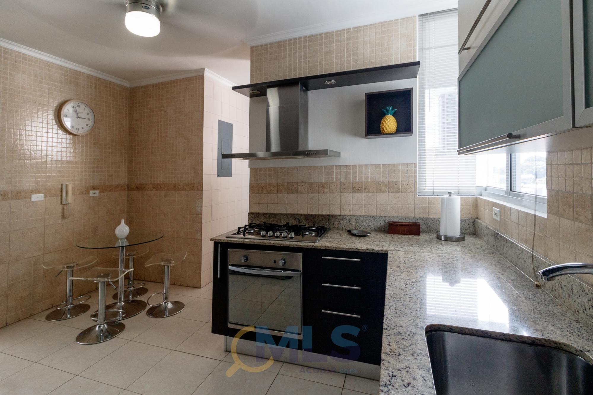 3-bedroom furnished apartment with 2.5 bathrooms on Calle 43 Bella Vista a few steps from Avenida Balboa and Parque Urraca, with renovated kitchen and modern furniture. The apartment has 2 balconies, one accessible from the living-dining room and the other on the main bedroom. Large living-dining room, kitchen with breakfast area, linen closets, spacious laundry room, and maid’s quarters. The street has a supermarket and a pharmacy and a little more than a block away you will find the Cinta Costera, where you can relax, walk or do various sports.