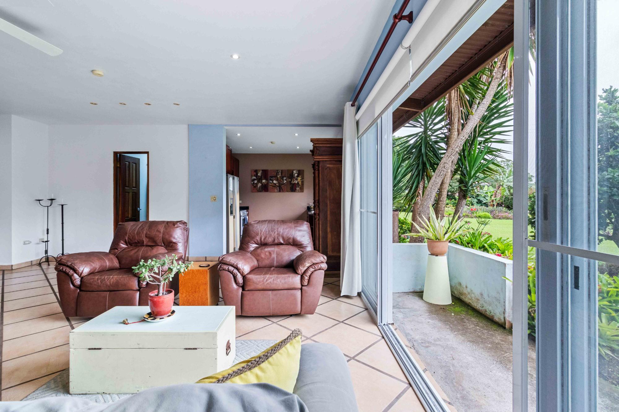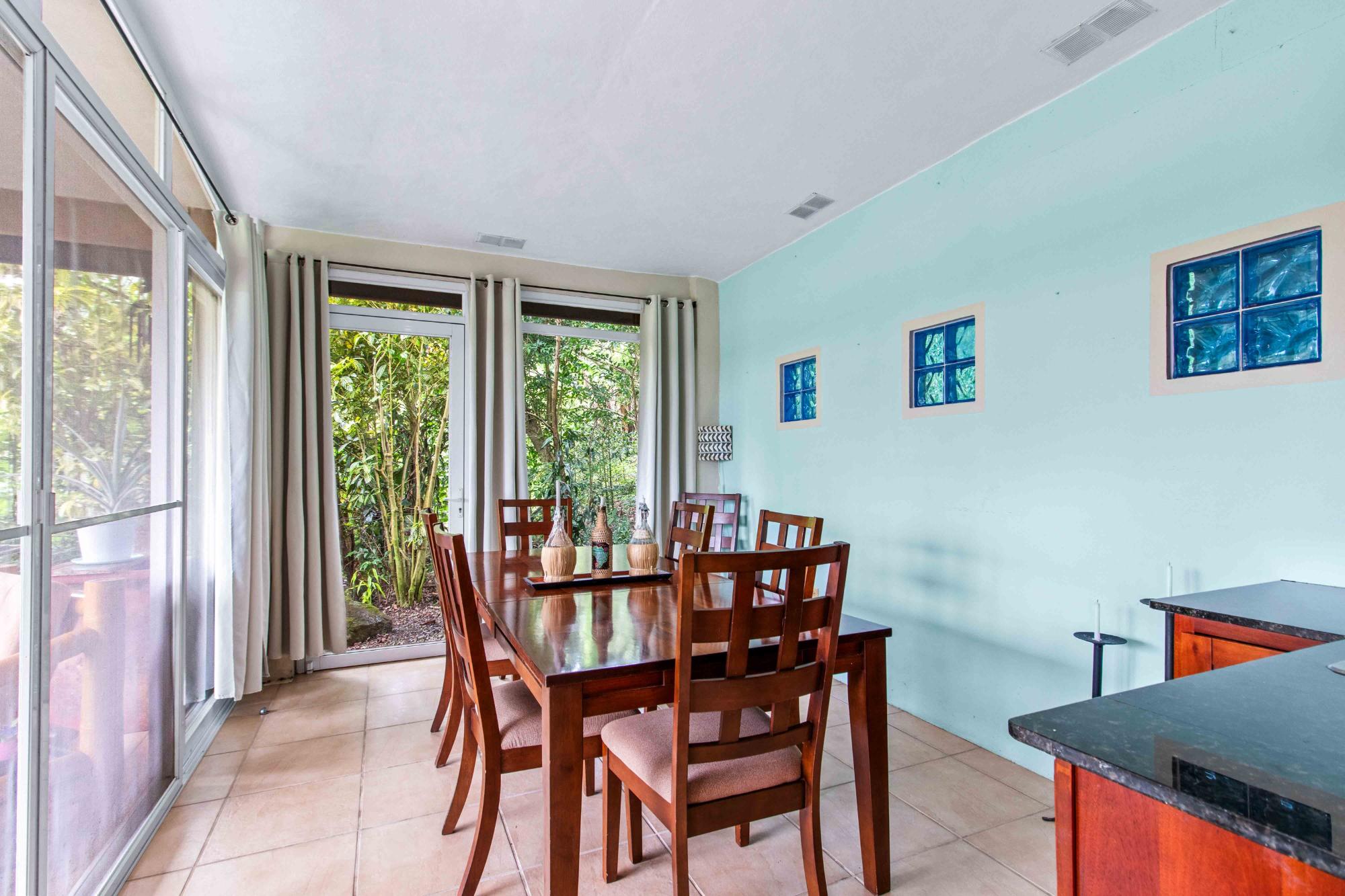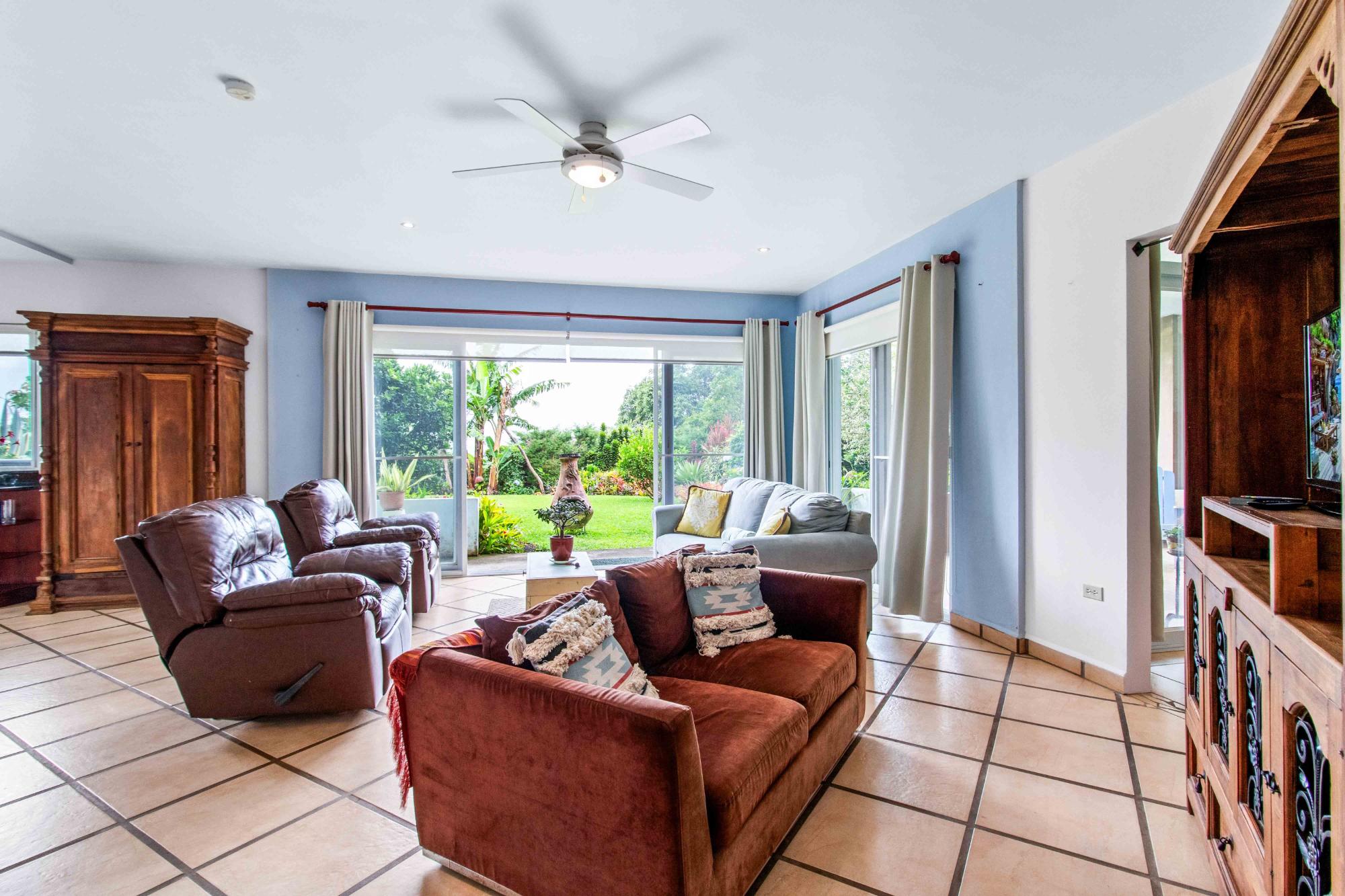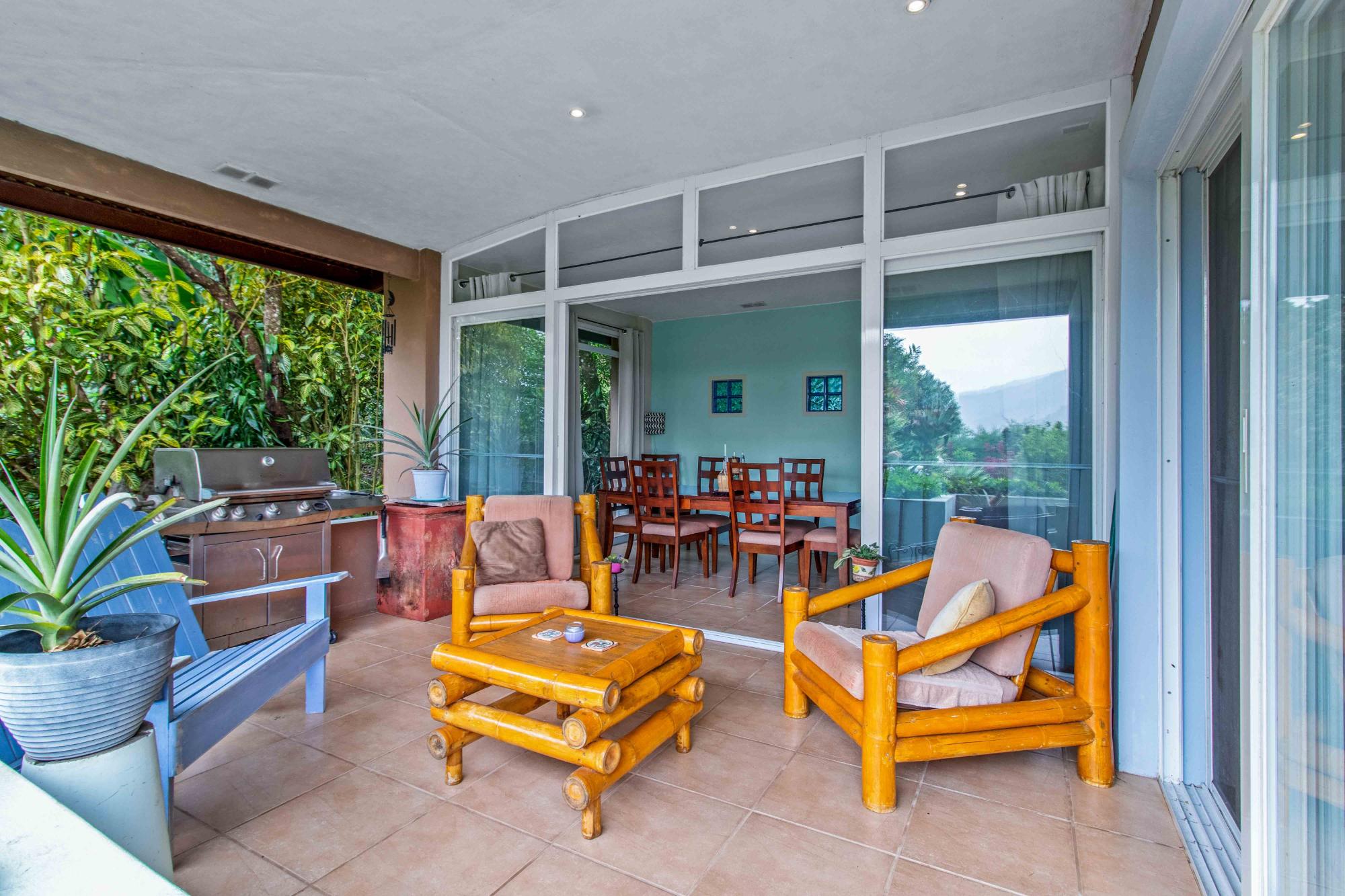 Discover Monte Verde, a hidden gem nestled in the lush greenery of Alto Lino, Boquete. This exclusive, private residence features just six condos, offering a tranquil retreat where comfort, privacy, and natural beauty blend seamlessly. Step into this ground-floor condo, where thoughtful design meets serene living. The spacious lounge leads to the main bedroom, complete with an en-suite bathroom and ample storage. The second bedroom also features an en-suite bathroom, offering generous cabinet space. Both bedrooms are equipped with 100% blackout blinds for restful sleep, while the living room boasts 95% UV-free pull-down blinds, complemented by curtains for complete darkness when needed. The comfortable sofa also doubles as a sofa bed, adding versatility to your living space. The kitchen, overlooking a lush garden, offers a peaceful backdrop for culinary adventures. From the kitchen window, enjoy stunning full double rainbows during the rainbow season, and let the soothing sounds of birdsong accompany your morning coffee on the patio. The separate dining room, with its cozy ambiance, comfortably hosts dinner parties for up to eight guests, featuring lovely views that transition into a warm and intimate setting after dark. For those who work from home, the dining area can easily be transformed into a functional office space, while the sofa bed makes hosting guests a breeze. The condo’s covered terrace offers a private, quiet space perfect for barbecues, morning coffee, or simply unwinding with garden views. Enjoy sunrise and moonrise from the Jaramillo mountains through the front windows, with breathtaking full moons as a highlight.