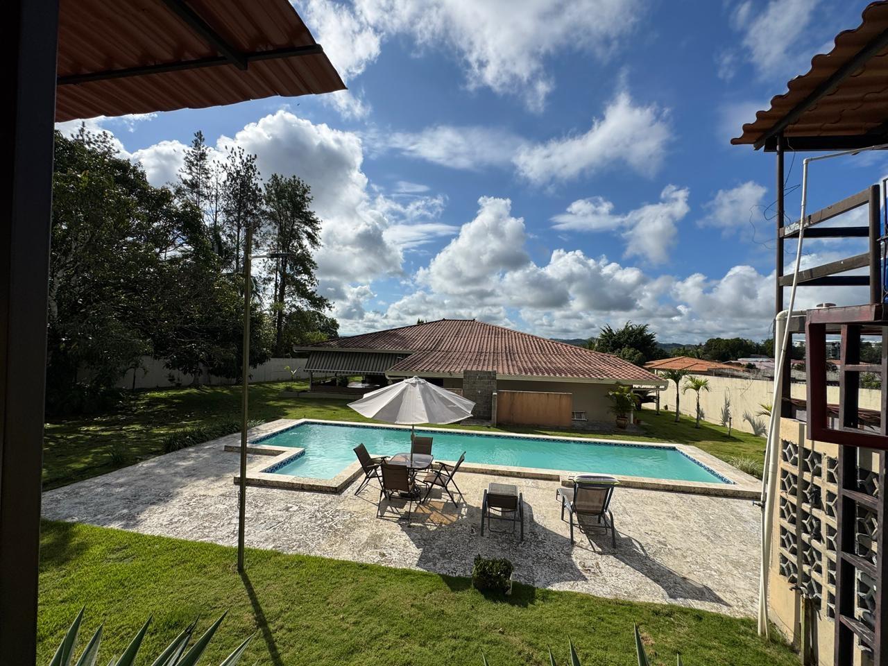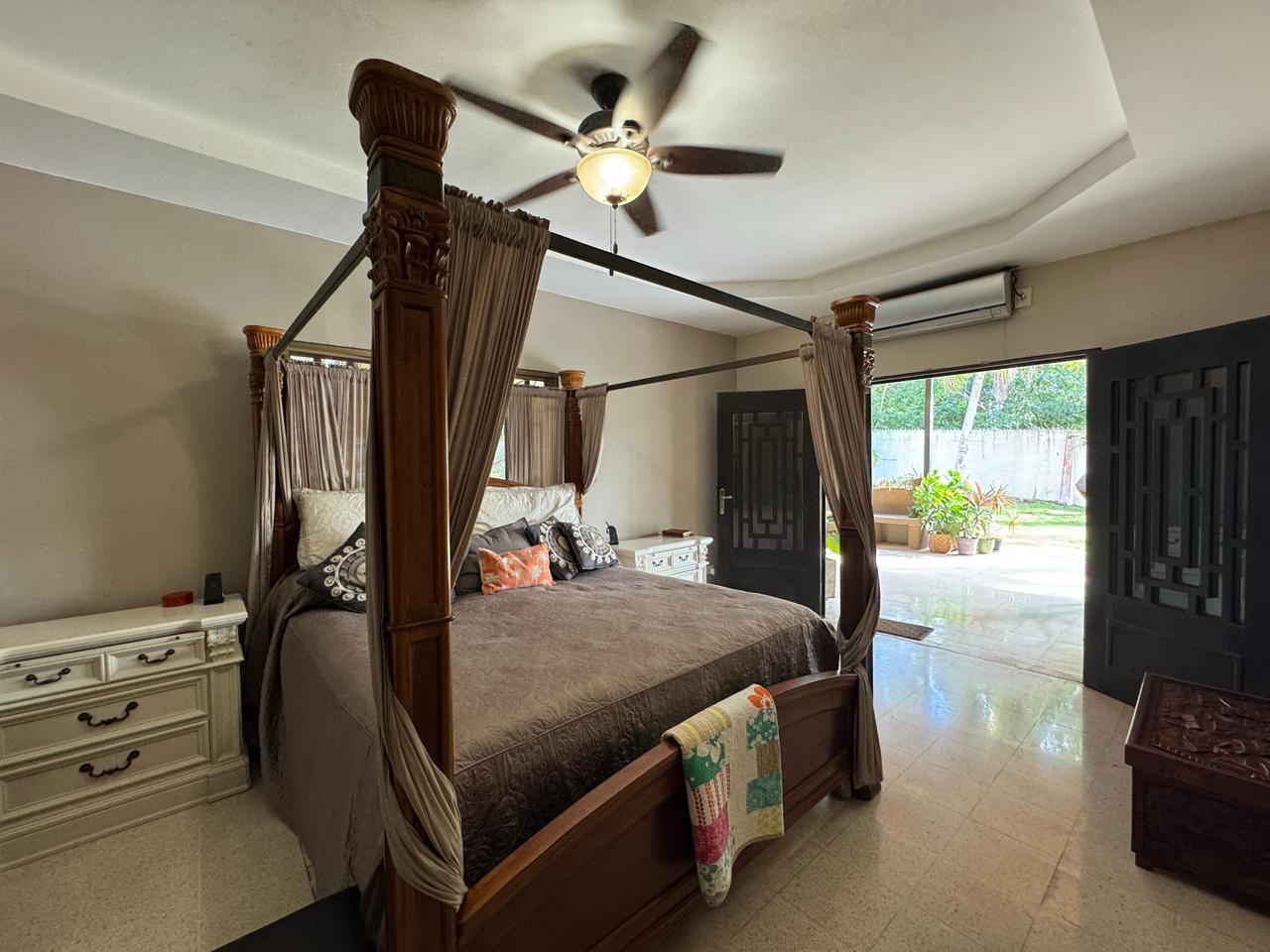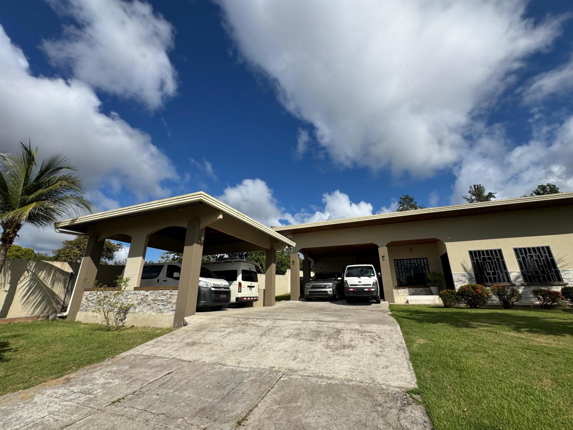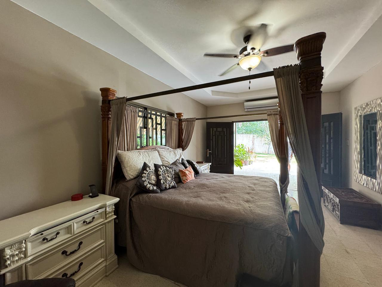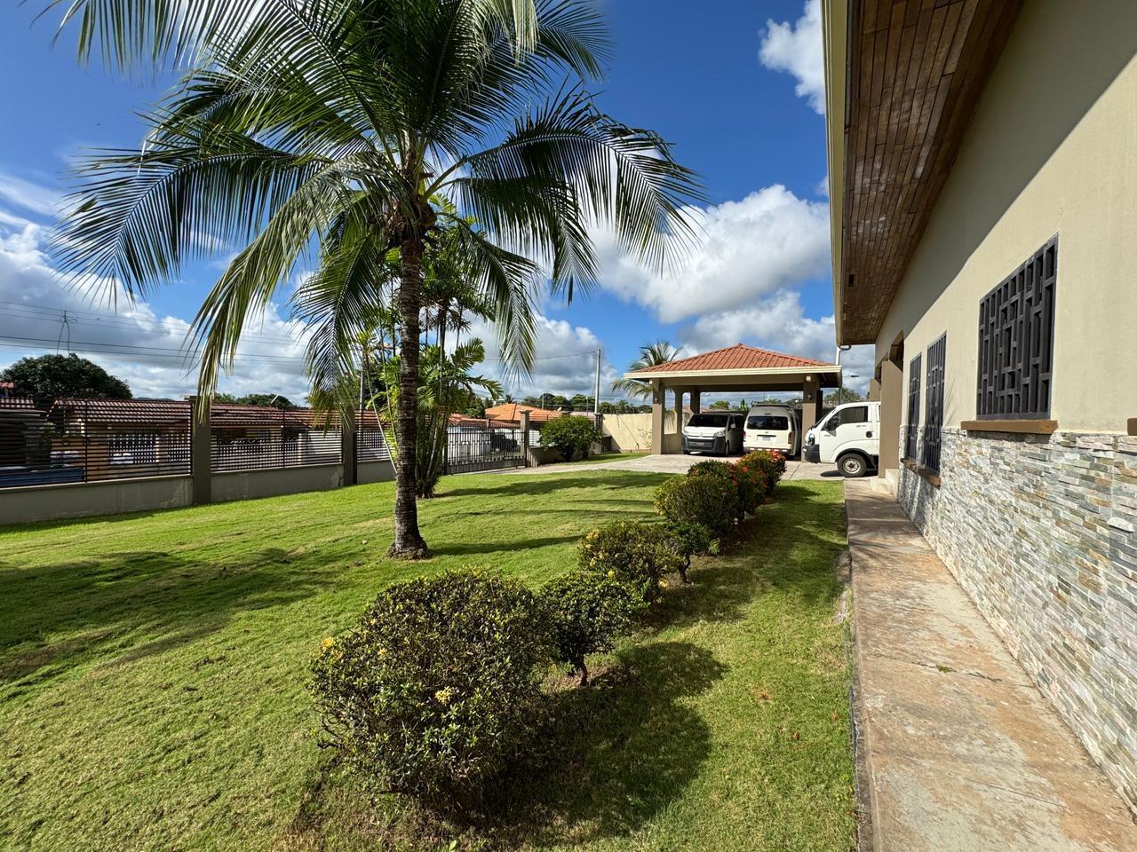 Single-family home with approximately 300 m² of construction on a flat 2,239.52 m² lot in Santiago, Veraguas. Four bedrooms, four bathrooms, swimming pool, defined interior and outdoor areas, perimeter fencing, and gated access. Located about 2 minutes from the Inter-American Highway and approximately 5 minutes from Santiago’s commercial center. The house is not directly adjacent to the highway. The House – Interior Layout The house features a functional layout with granite flooring throughout. The main living area features a wood-paneled ceiling and receives natural light, connecting directly to the dining area and kitchen. These spaces form the central living area of the home. The kitchen features granite countertops, solid wood upper and lower cabinetry, a stainless-steel stove, a range hood, and a large walk-in pantry. It also includes bench seating for four and a secondary dining area that opens toward the living room. Bedrooms and Bathrooms The property includes four bedrooms and four bathrooms. Two bedrooms function as primary suites. The main primary suite measures approximately 20.5 ft by 12.5 ft and includes an inlaid ceiling, double French doors that open directly to an outdoor patio, and separate walk-in closets. The en-suite bathroom includes double sinks, an oversized shower, and a soaking tub. The second primary suite provides space for a king-size bed and includes natural light and a private bathroom with an oversized shower. Two additional bedrooms are located in a separate section of the house. Two bedrooms are served by non-attached three-quarter bathrooms with dedicated shower areas.
