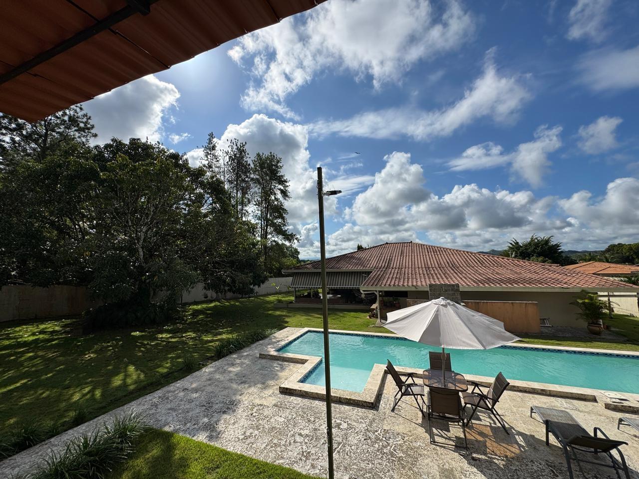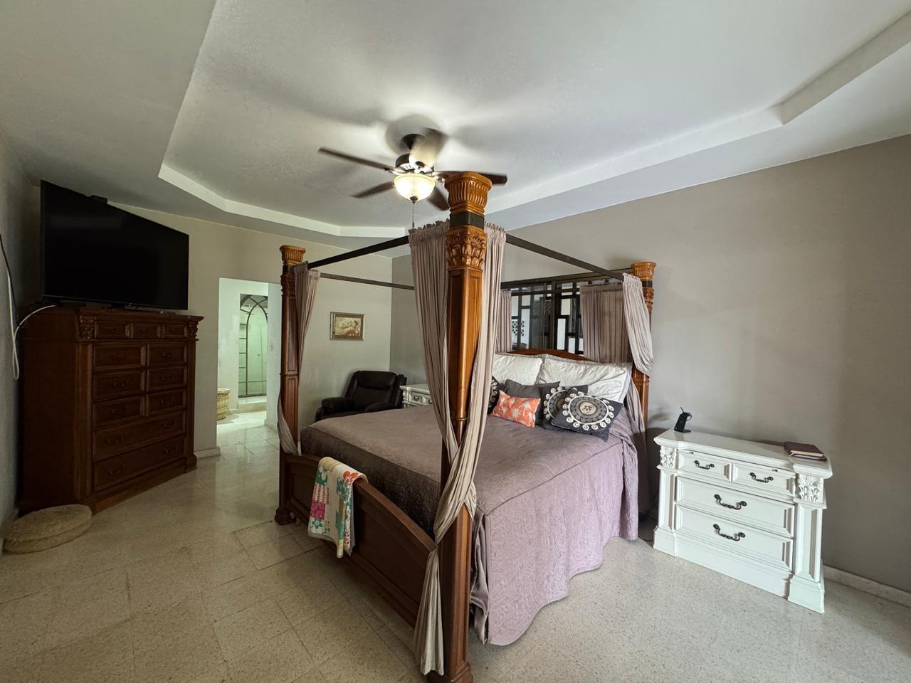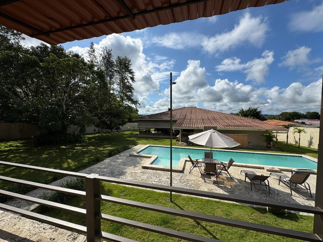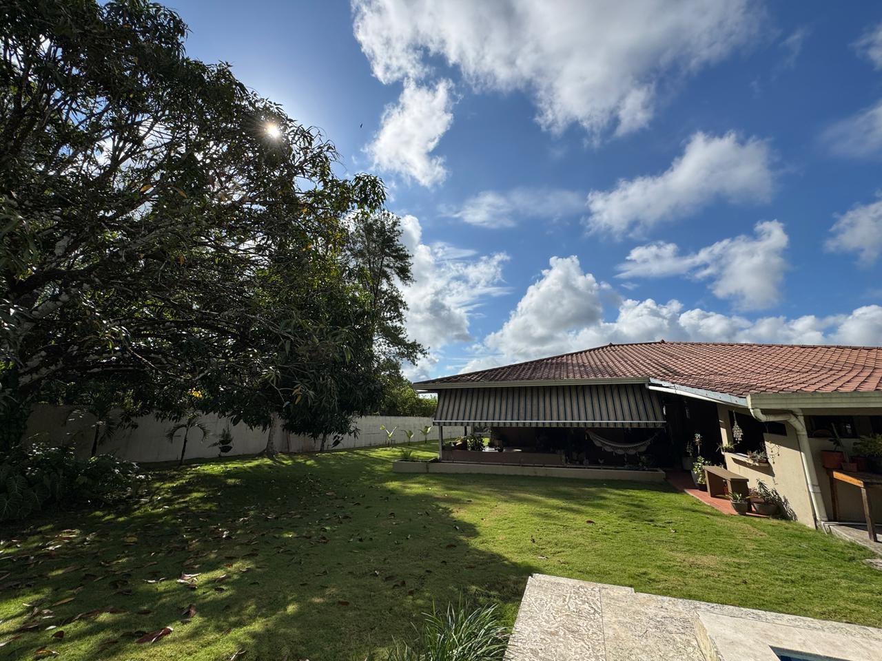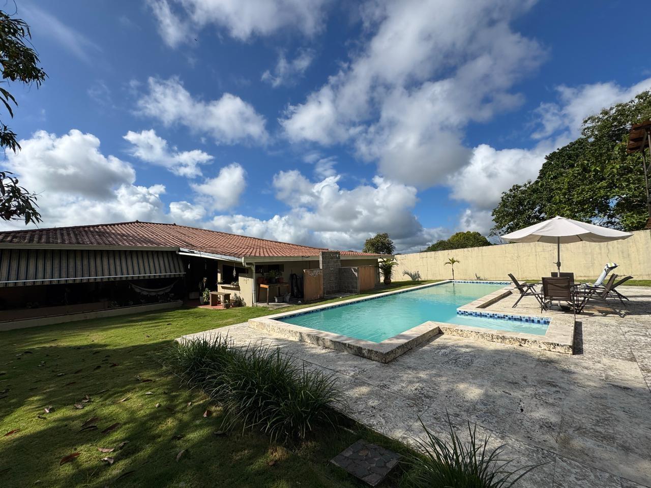 Single-family home with approximately 300 m² of construction on a flat 2,239.52 m² lot in Santiago, Veraguas. Four bedrooms, four bathrooms, swimming pool, defined interior and outdoor areas, perimeter fencing, and gated access. Located about 2 minutes from the Inter-American Highway and approximately 5 minutes from Santiago’s commercial center. The house is not directly adjacent to the highway. The House – Interior Layout The house features a functional layout with granite flooring throughout. The main living area features a wood-paneled ceiling and receives natural light, connecting directly to the dining area and kitchen. These spaces form the central living area of the home. The kitchen features granite countertops, solid wood upper and lower cabinetry, a stainless-steel stove, a range hood, and a large walk-in pantry. It also includes bench seating for four and a secondary dining area that opens toward the living room. Bedrooms and Bathrooms The property includes four bedrooms and four bathrooms. Two bedrooms function as primary suites. The main primary suite measures approximately 20.5 ft by 12.5 ft and includes an inlaid ceiling, double French doors that open directly to an outdoor patio, and separate walk-in closets. The en-suite bathroom includes double sinks, an oversized shower, and a soaking tub. The second primary suite provides space for a king-size bed and includes natural light and a private bathroom with an oversized shower. Two additional bedrooms are located in a separate section of the house. Two bedrooms are served by non-attached three-quarter bathrooms with dedicated shower areas.