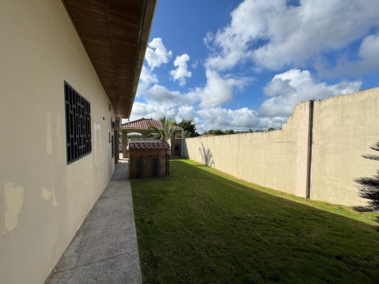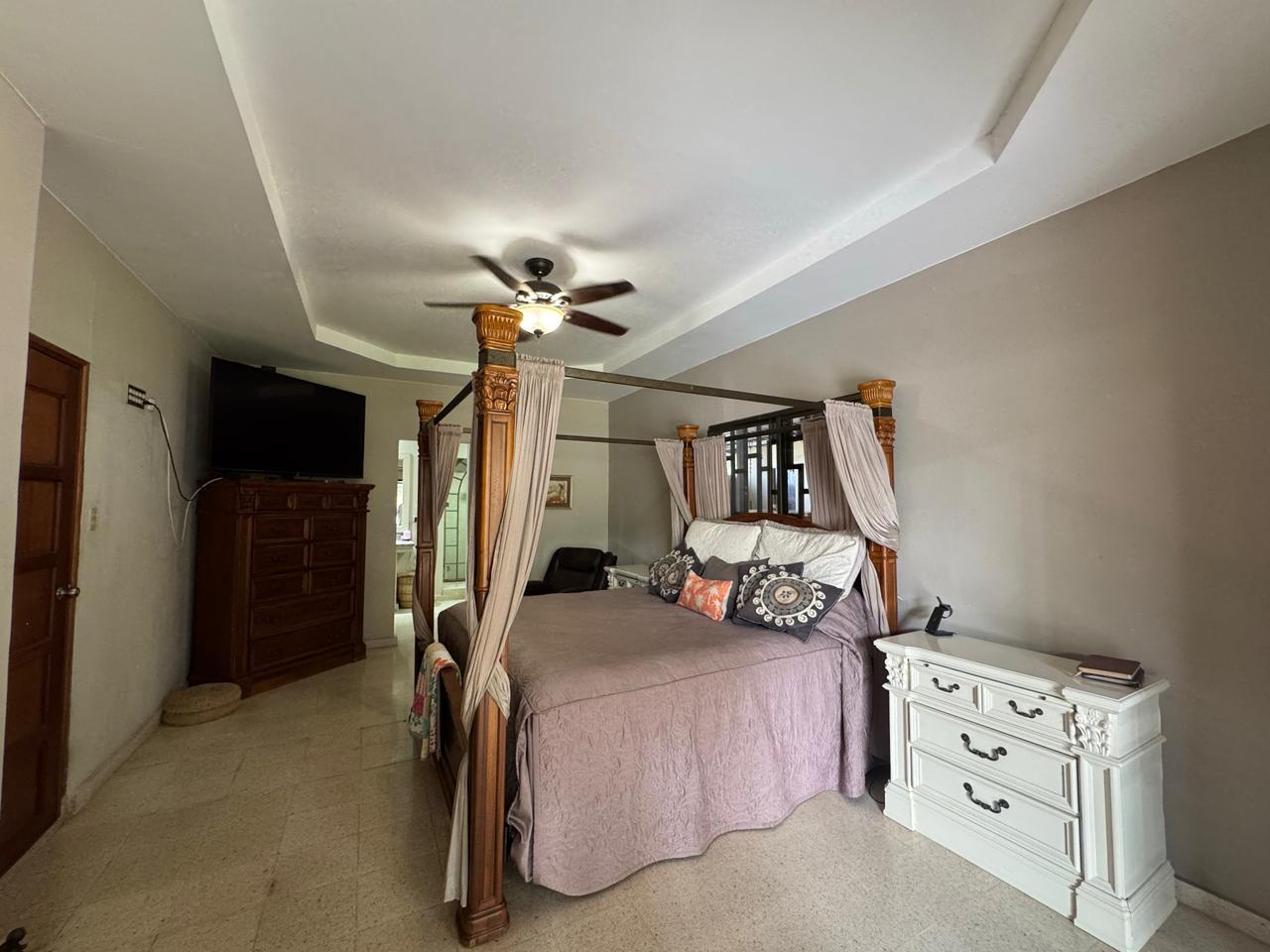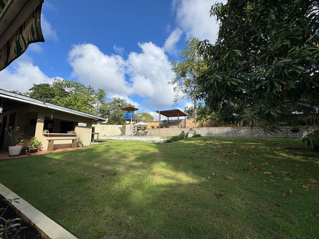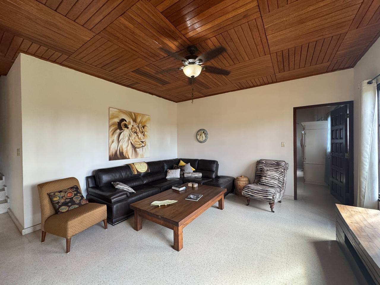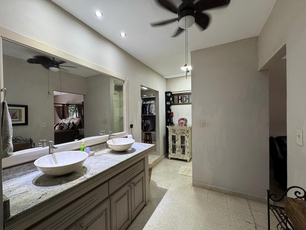 Single-family home with approximately 300 m² of construction on a flat 2,239.52 m² lot in Santiago, Veraguas. Four bedrooms, four bathrooms, swimming pool, defined interior and outdoor areas, perimeter fencing, and gated access. Located about 2 minutes from the Inter-American Highway and approximately 5 minutes from Santiago’s commercial center. The house is not directly adjacent to the highway. The House – Interior Layout The house features a functional layout with granite flooring throughout. The main living area features a wood-paneled ceiling and receives natural light, connecting directly to the dining area and kitchen. These spaces form the central living area of the home. The kitchen features granite countertops, solid wood upper and lower cabinetry, a stainless-steel stove, a range hood, and a large walk-in pantry. It also includes bench seating for four and a secondary dining area that opens toward the living room. Bedrooms and Bathrooms The property includes four bedrooms and four bathrooms. Two bedrooms function as primary suites. The main primary suite measures approximately 20.5 ft by 12.5 ft and includes an inlaid ceiling, double French doors that open directly to an outdoor patio, and separate walk-in closets. The en-suite bathroom includes double sinks, an oversized shower, and a soaking tub. The second primary suite provides space for a king-size bed and includes natural light and a private bathroom with an oversized shower. Two additional bedrooms are located in a separate section of the house. Two bedrooms are served by non-attached three-quarter bathrooms with dedicated shower areas.