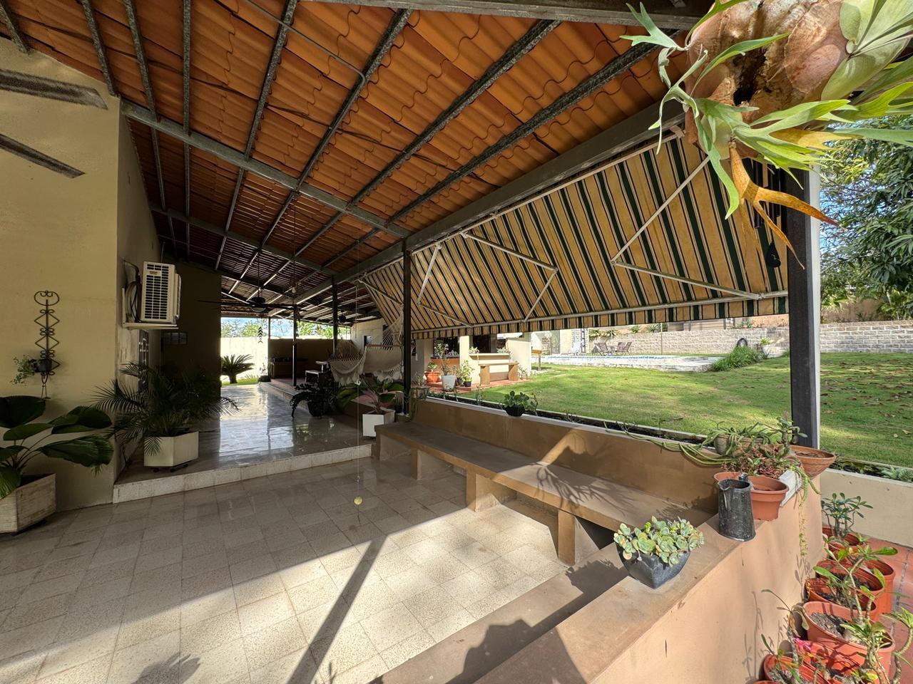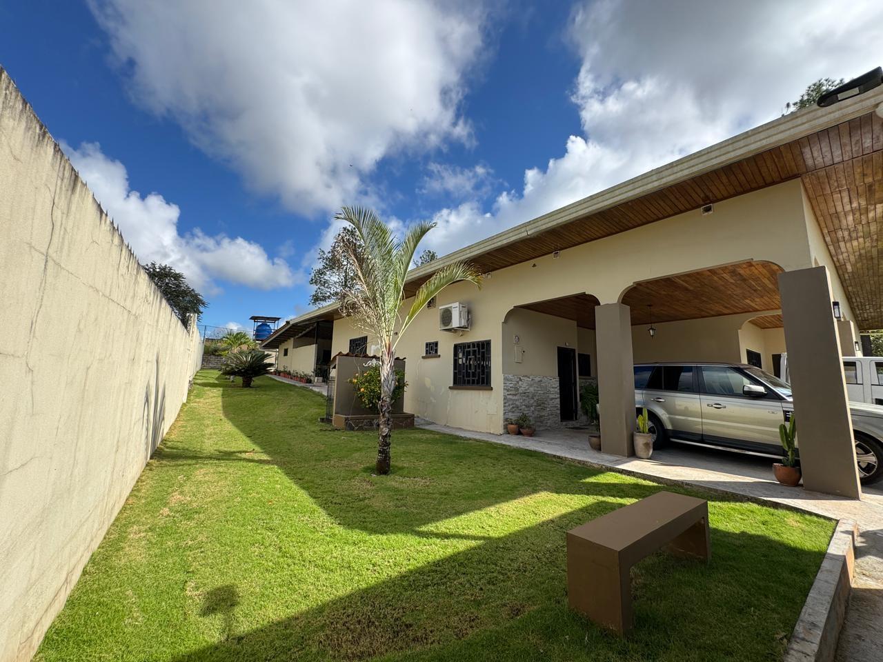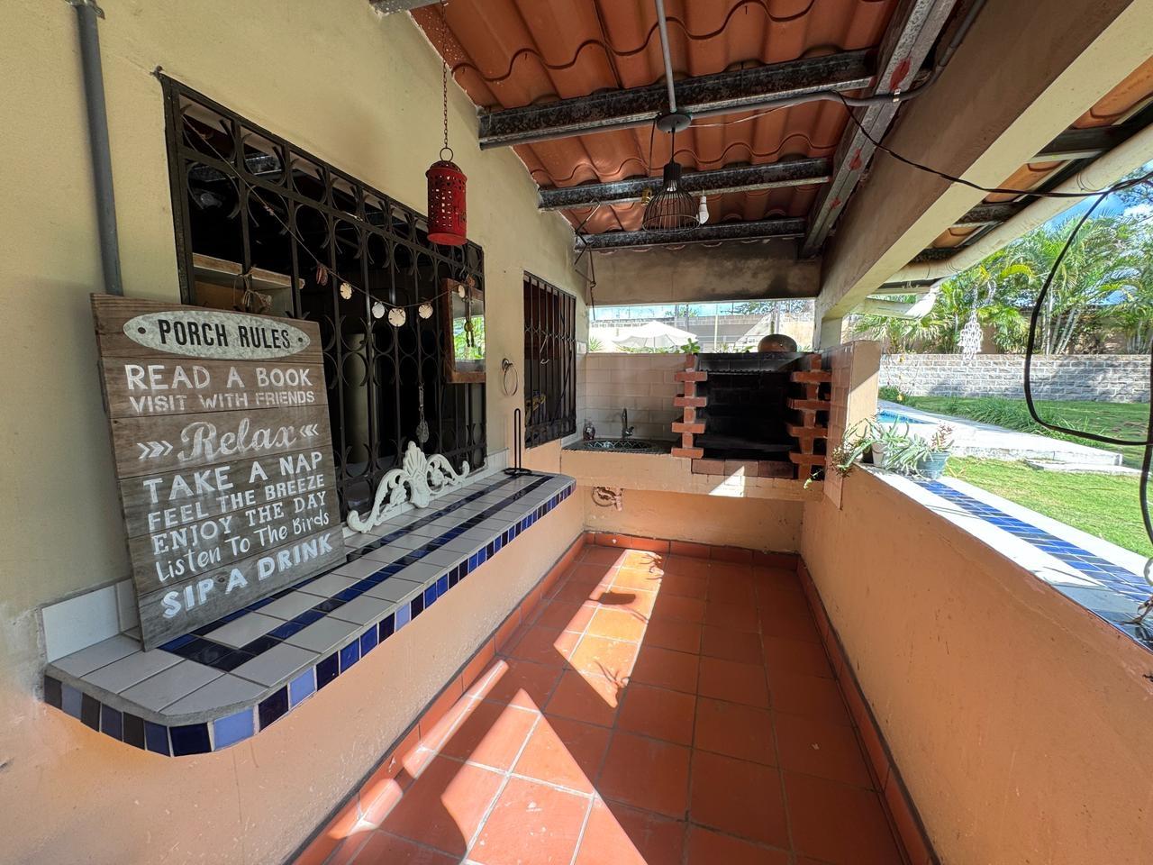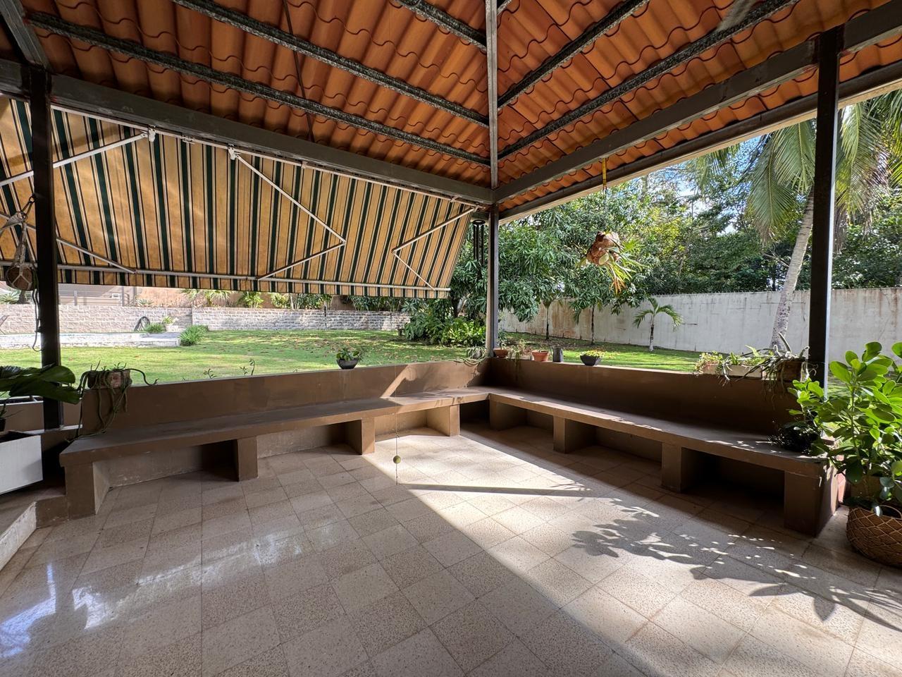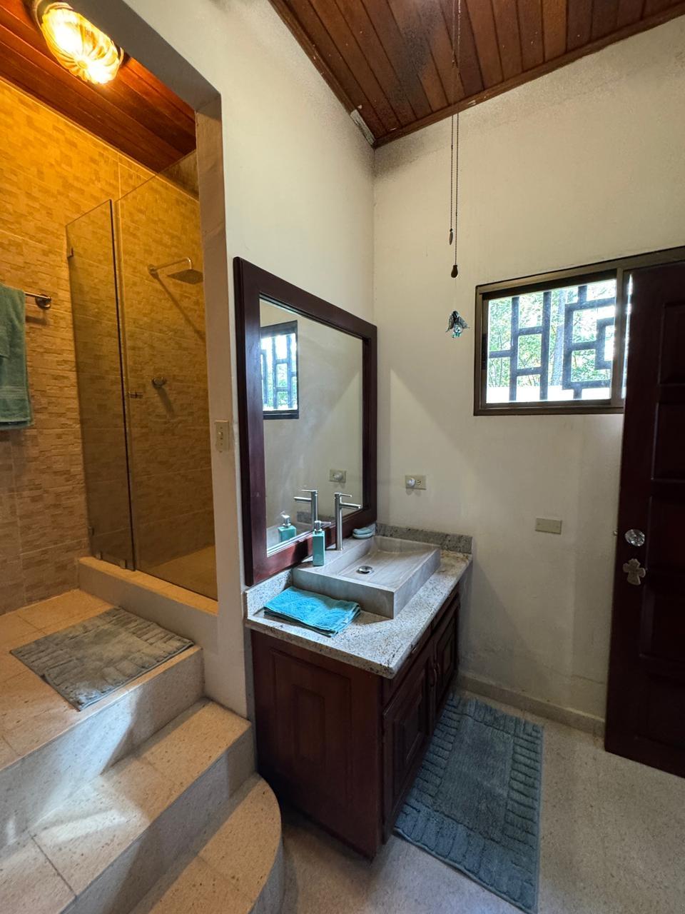 Single-family home with approximately 300 m² of construction on a flat 2,239.52 m² lot in Santiago, Veraguas. Four bedrooms, four bathrooms, swimming pool, defined interior and outdoor areas, perimeter fencing, and gated access. Located about 2 minutes from the Inter-American Highway and approximately 5 minutes from Santiago’s commercial center. The house is not directly adjacent to the highway. The House – Interior Layout The house features a functional layout with granite flooring throughout. The main living area features a wood-paneled ceiling and receives natural light, connecting directly to the dining area and kitchen. These spaces form the central living area of the home. The kitchen features granite countertops, solid wood upper and lower cabinetry, a stainless-steel stove, a range hood, and a large walk-in pantry. It also includes bench seating for four and a secondary dining area that opens toward the living room. Bedrooms and Bathrooms The property includes four bedrooms and four bathrooms. Two bedrooms function as primary suites. The main primary suite measures approximately 20.5 ft by 12.5 ft and includes an inlaid ceiling, double French doors that open directly to an outdoor patio, and separate walk-in closets. The en-suite bathroom includes double sinks, an oversized shower, and a soaking tub. The second primary suite provides space for a king-size bed and includes natural light and a private bathroom with an oversized shower. Two additional bedrooms are located in a separate section of the house. Two bedrooms are served by non-attached three-quarter bathrooms with dedicated shower areas.