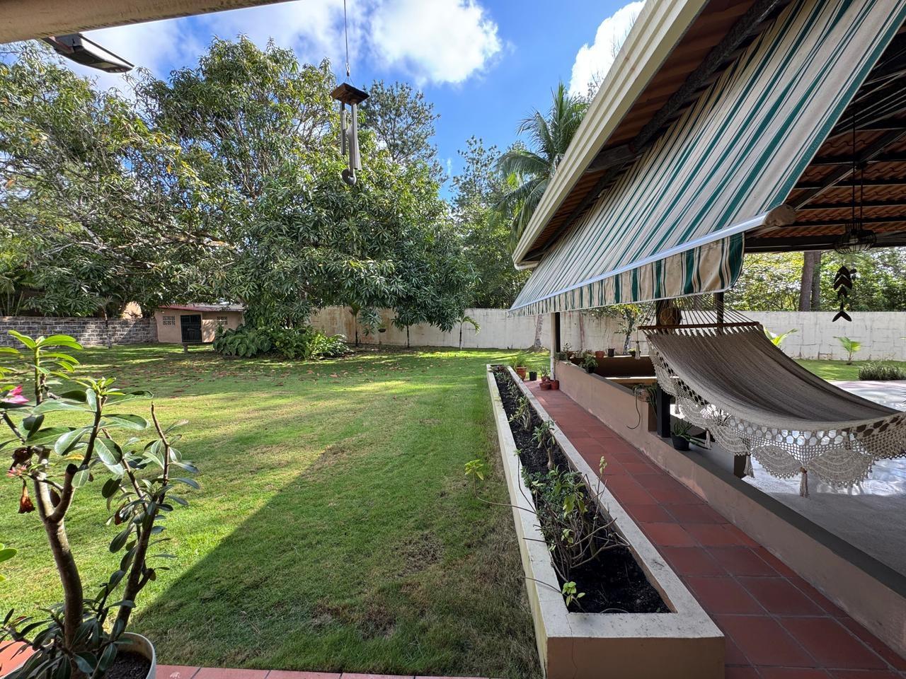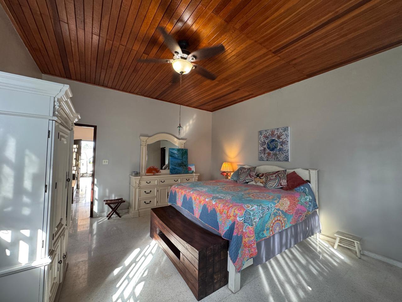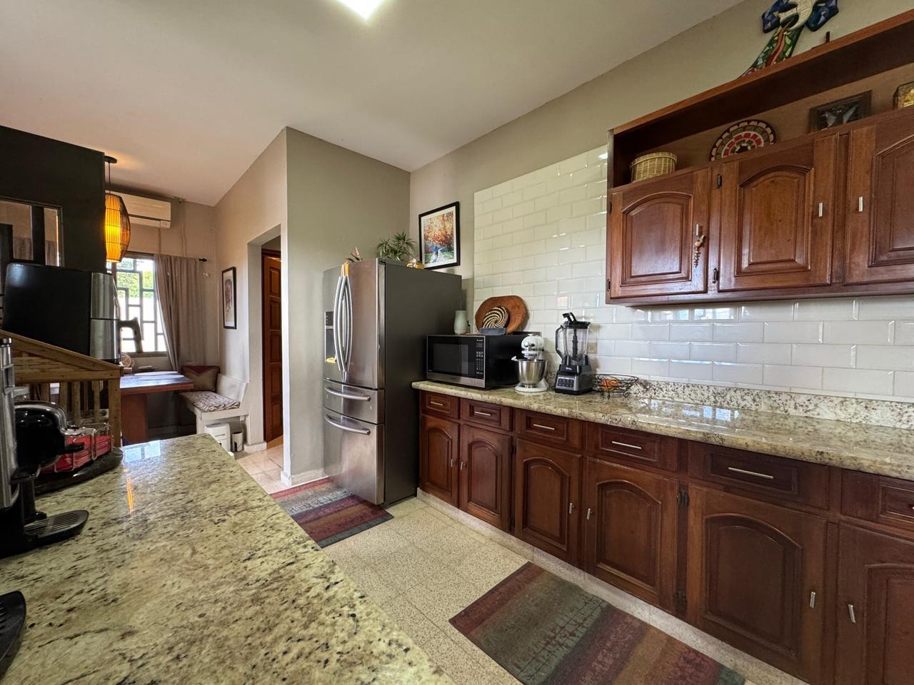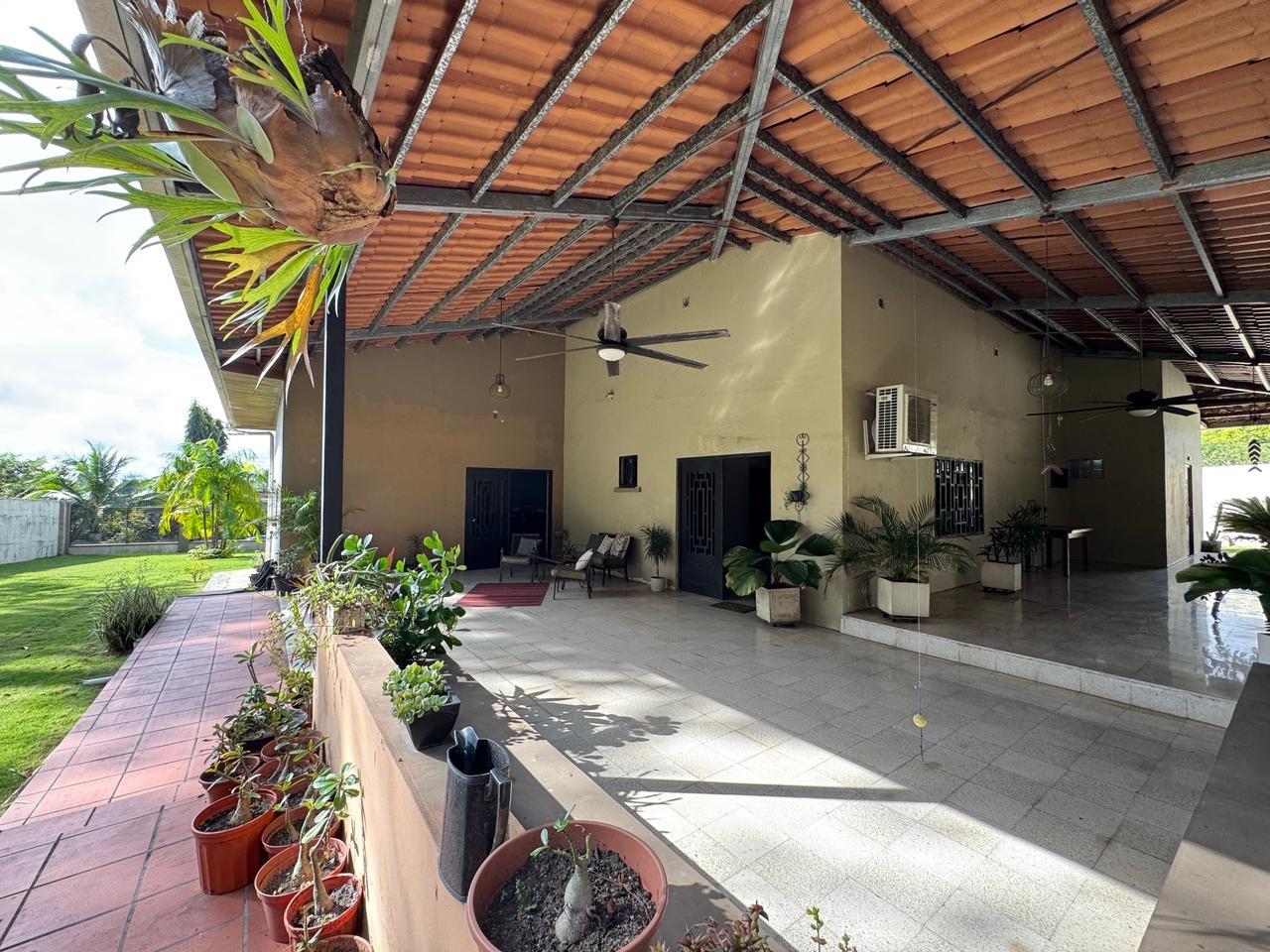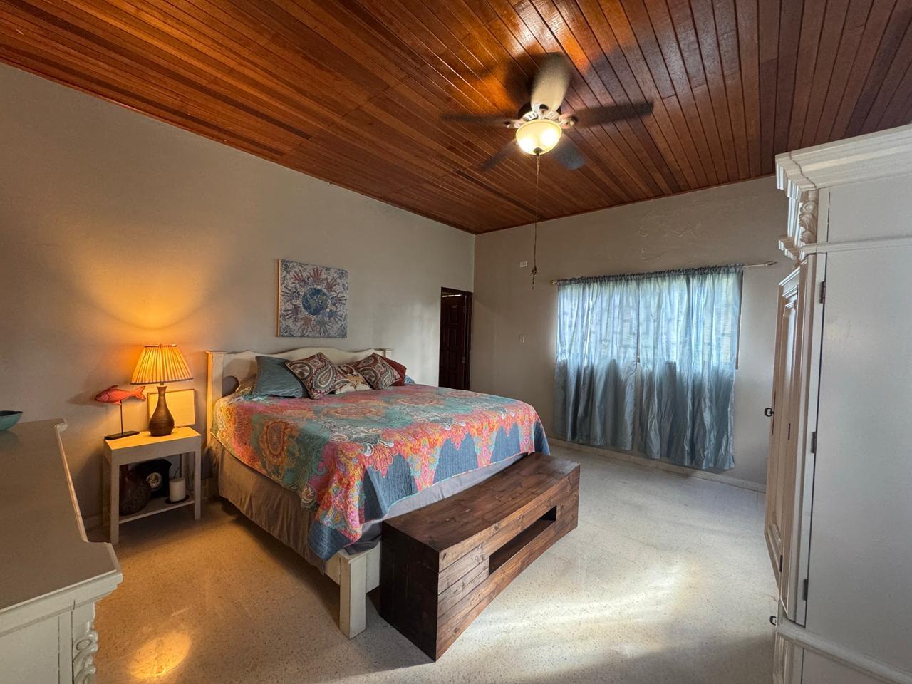 Single-family home with approximately 300 m² of construction on a flat 2,239.52 m² lot in Santiago, Veraguas. Four bedrooms, four bathrooms, swimming pool, defined interior and outdoor areas, perimeter fencing, and gated access. Located about 2 minutes from the Inter-American Highway and approximately 5 minutes from Santiago’s commercial center. The house is not directly adjacent to the highway. The House – Interior Layout The house features a functional layout with granite flooring throughout. The main living area features a wood-paneled ceiling and receives natural light, connecting directly to the dining area and kitchen. These spaces form the central living area of the home. The kitchen features granite countertops, solid wood upper and lower cabinetry, a stainless-steel stove, a range hood, and a large walk-in pantry. It also includes bench seating for four and a secondary dining area that opens toward the living room. Bedrooms and Bathrooms The property includes four bedrooms and four bathrooms. Two bedrooms function as primary suites. The main primary suite measures approximately 20.5 ft by 12.5 ft and includes an inlaid ceiling, double French doors that open directly to an outdoor patio, and separate walk-in closets. The en-suite bathroom includes double sinks, an oversized shower, and a soaking tub. The second primary suite provides space for a king-size bed and includes natural light and a private bathroom with an oversized shower. Two additional bedrooms are located in a separate section of the house. Two bedrooms are served by non-attached three-quarter bathrooms with dedicated shower areas.