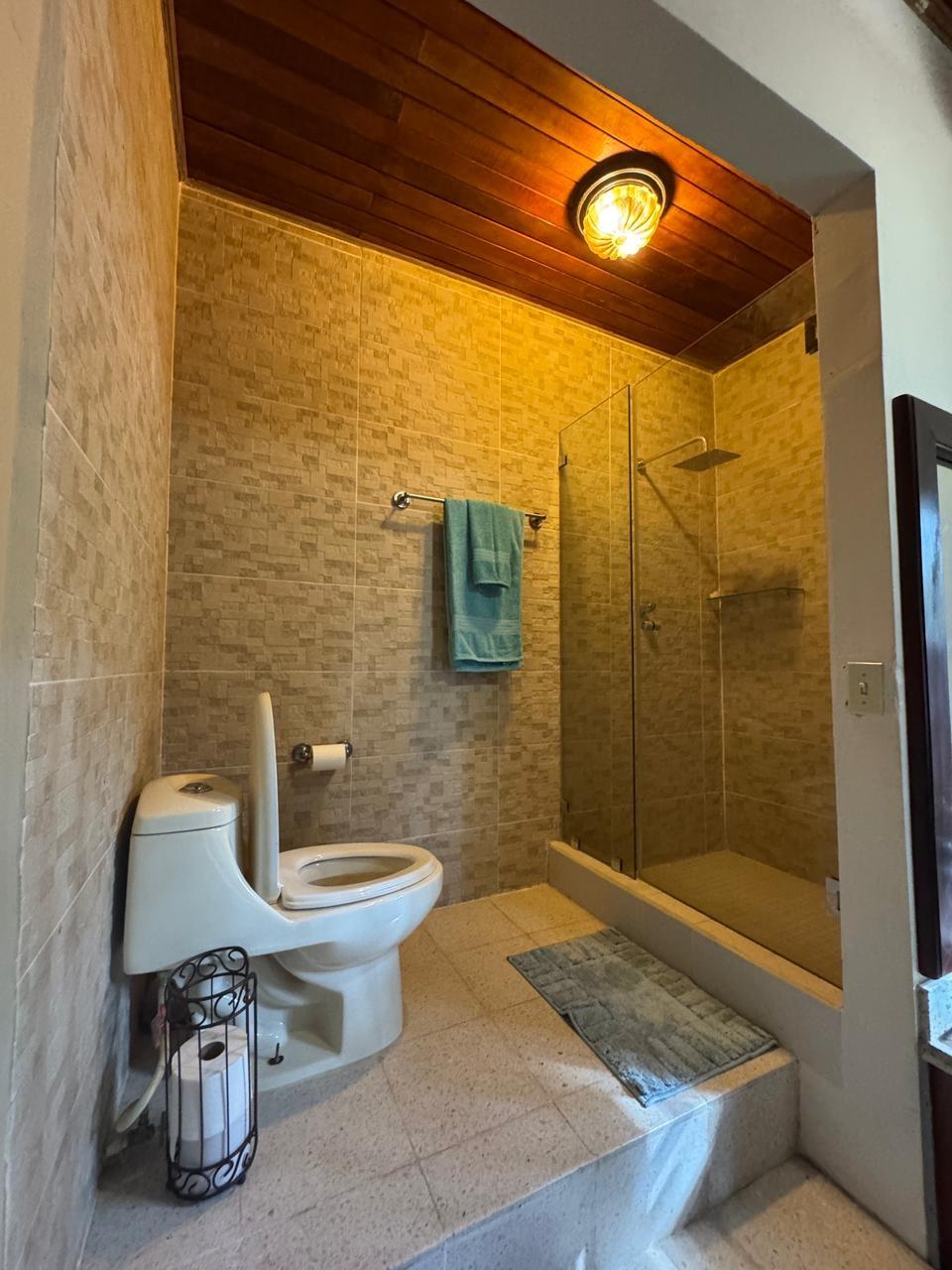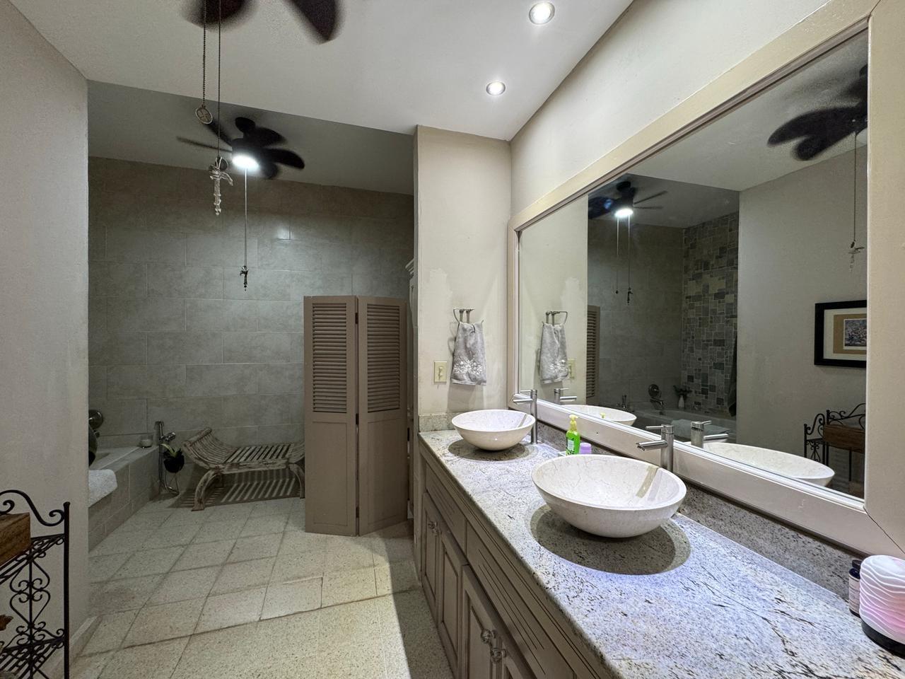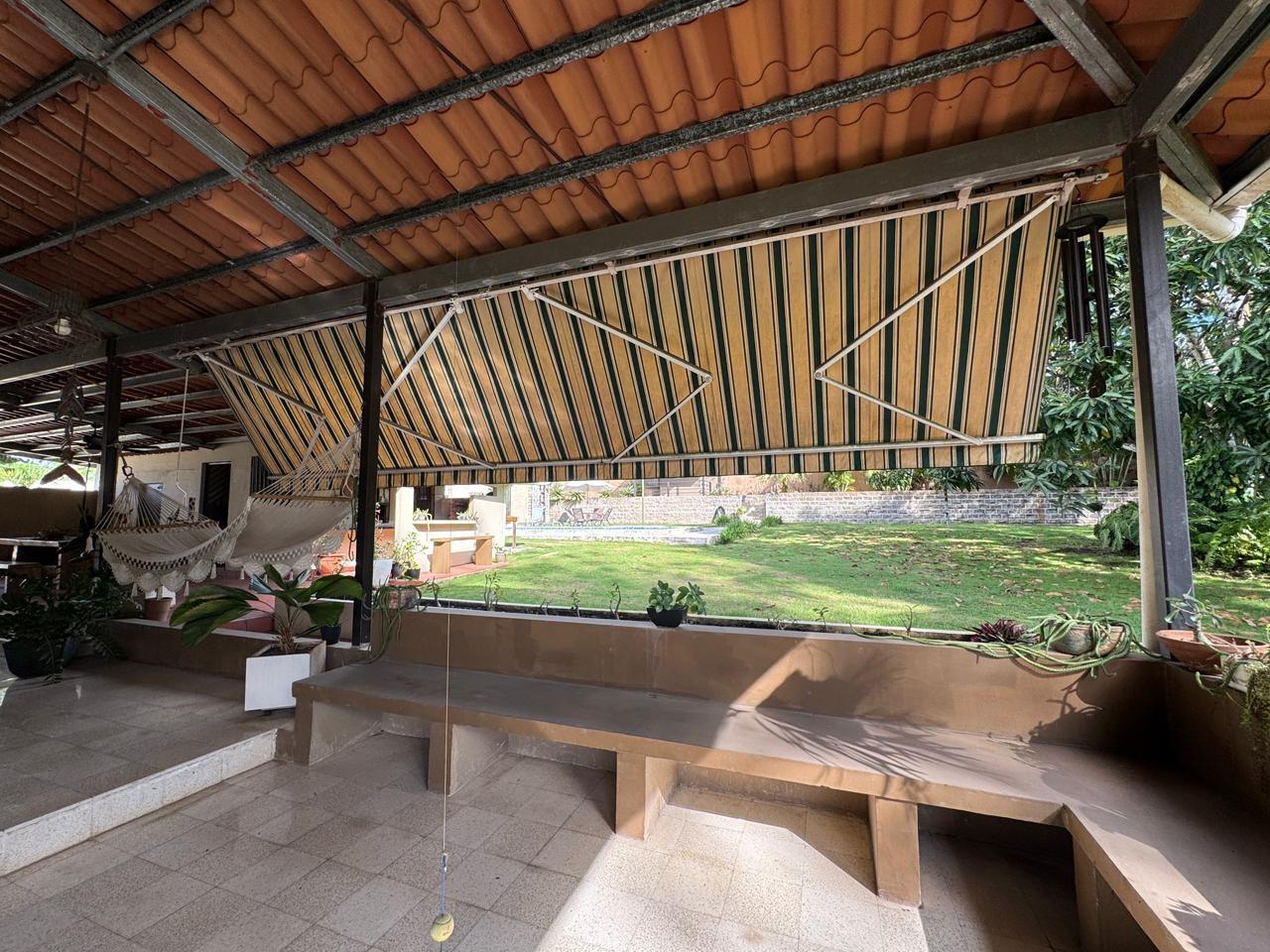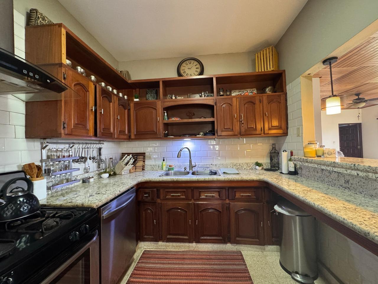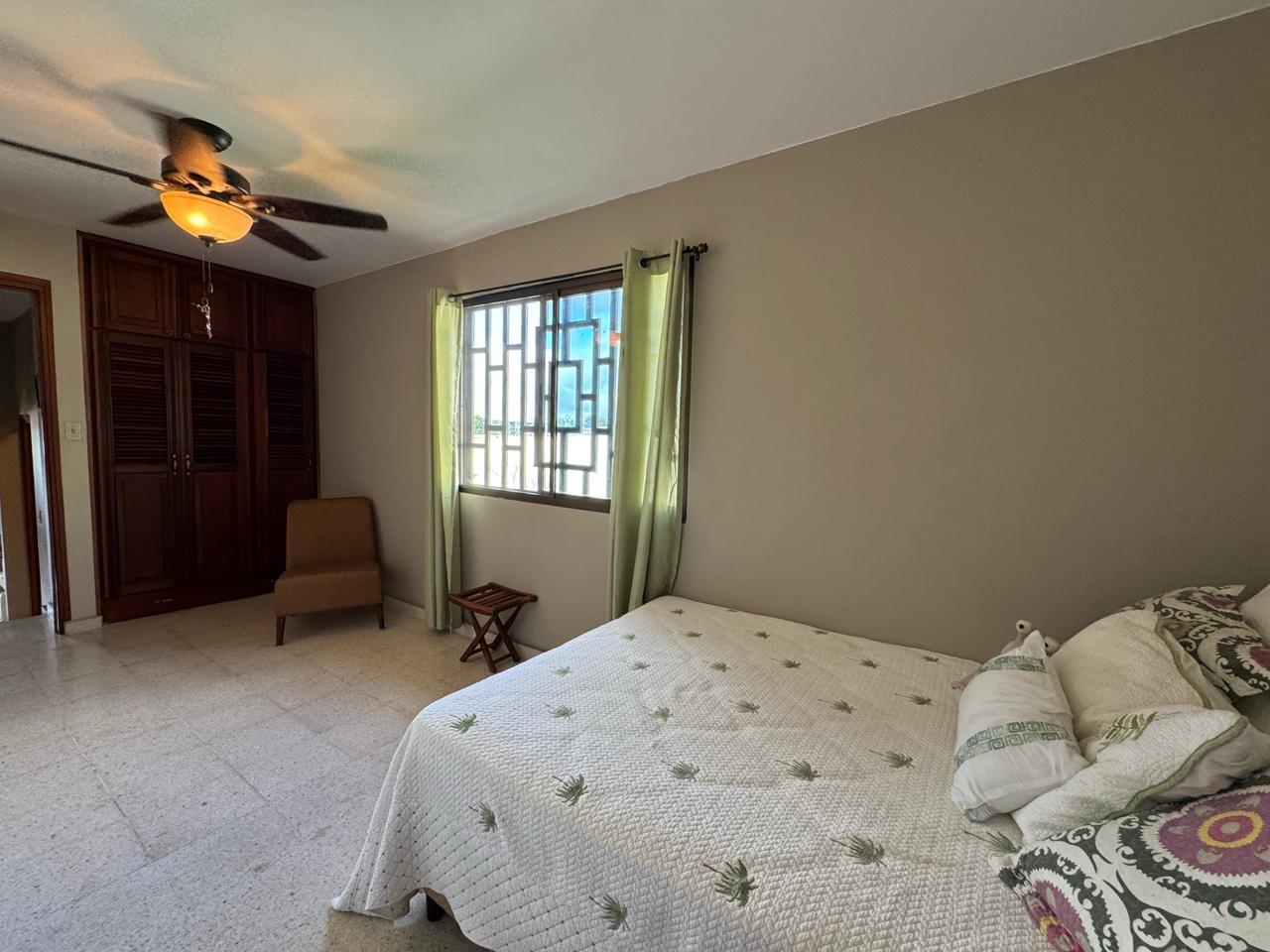 Single-family home with approximately 300 m² of construction on a flat 2,239.52 m² lot in Santiago, Veraguas. Four bedrooms, four bathrooms, swimming pool, defined interior and outdoor areas, perimeter fencing, and gated access. Located about 2 minutes from the Inter-American Highway and approximately 5 minutes from Santiago’s commercial center. The house is not directly adjacent to the highway. The House – Interior Layout The house features a functional layout with granite flooring throughout. The main living area features a wood-paneled ceiling and receives natural light, connecting directly to the dining area and kitchen. These spaces form the central living area of the home. The kitchen features granite countertops, solid wood upper and lower cabinetry, a stainless-steel stove, a range hood, and a large walk-in pantry. It also includes bench seating for four and a secondary dining area that opens toward the living room. Bedrooms and Bathrooms The property includes four bedrooms and four bathrooms. Two bedrooms function as primary suites. The main primary suite measures approximately 20.5 ft by 12.5 ft and includes an inlaid ceiling, double French doors that open directly to an outdoor patio, and separate walk-in closets. The en-suite bathroom includes double sinks, an oversized shower, and a soaking tub. The second primary suite provides space for a king-size bed and includes natural light and a private bathroom with an oversized shower. Two additional bedrooms are located in a separate section of the house. Two bedrooms are served by non-attached three-quarter bathrooms with dedicated shower areas.
