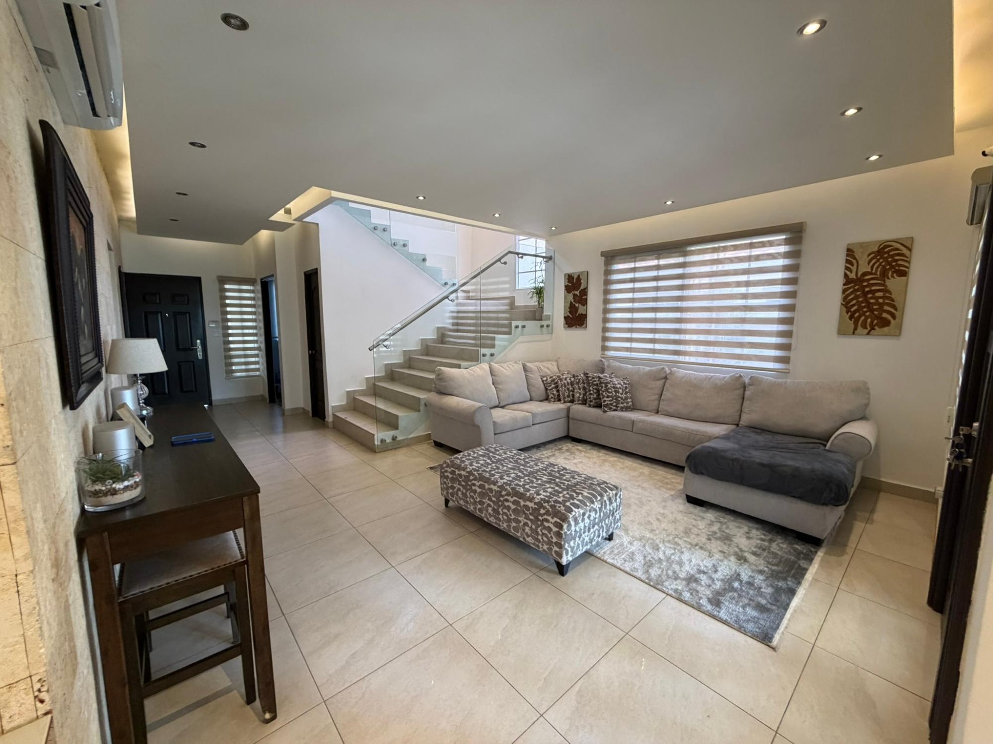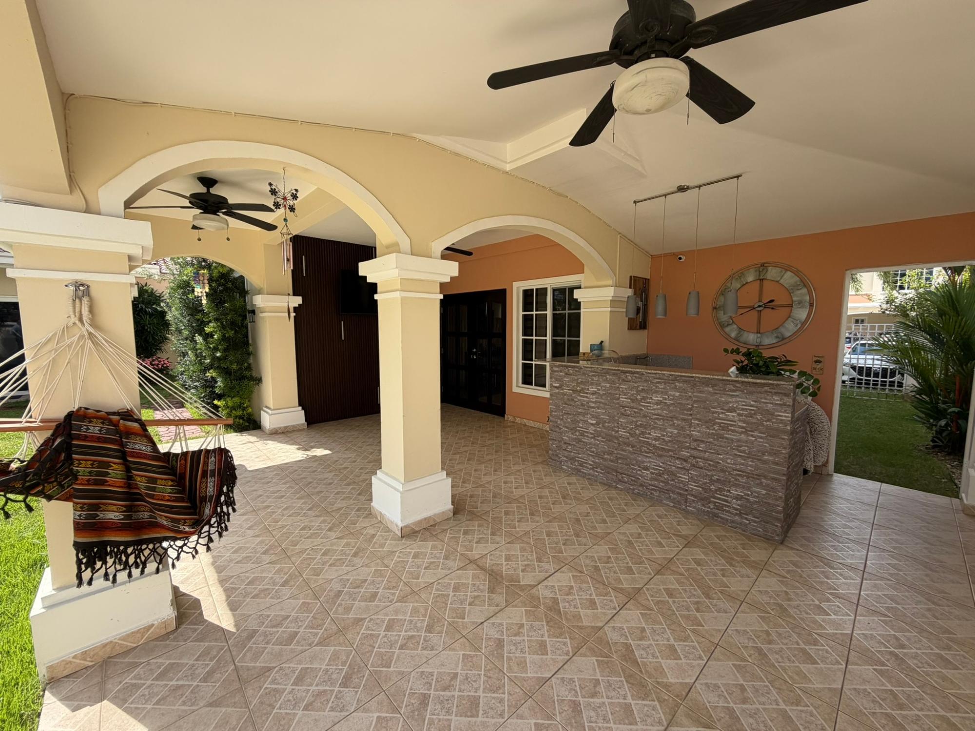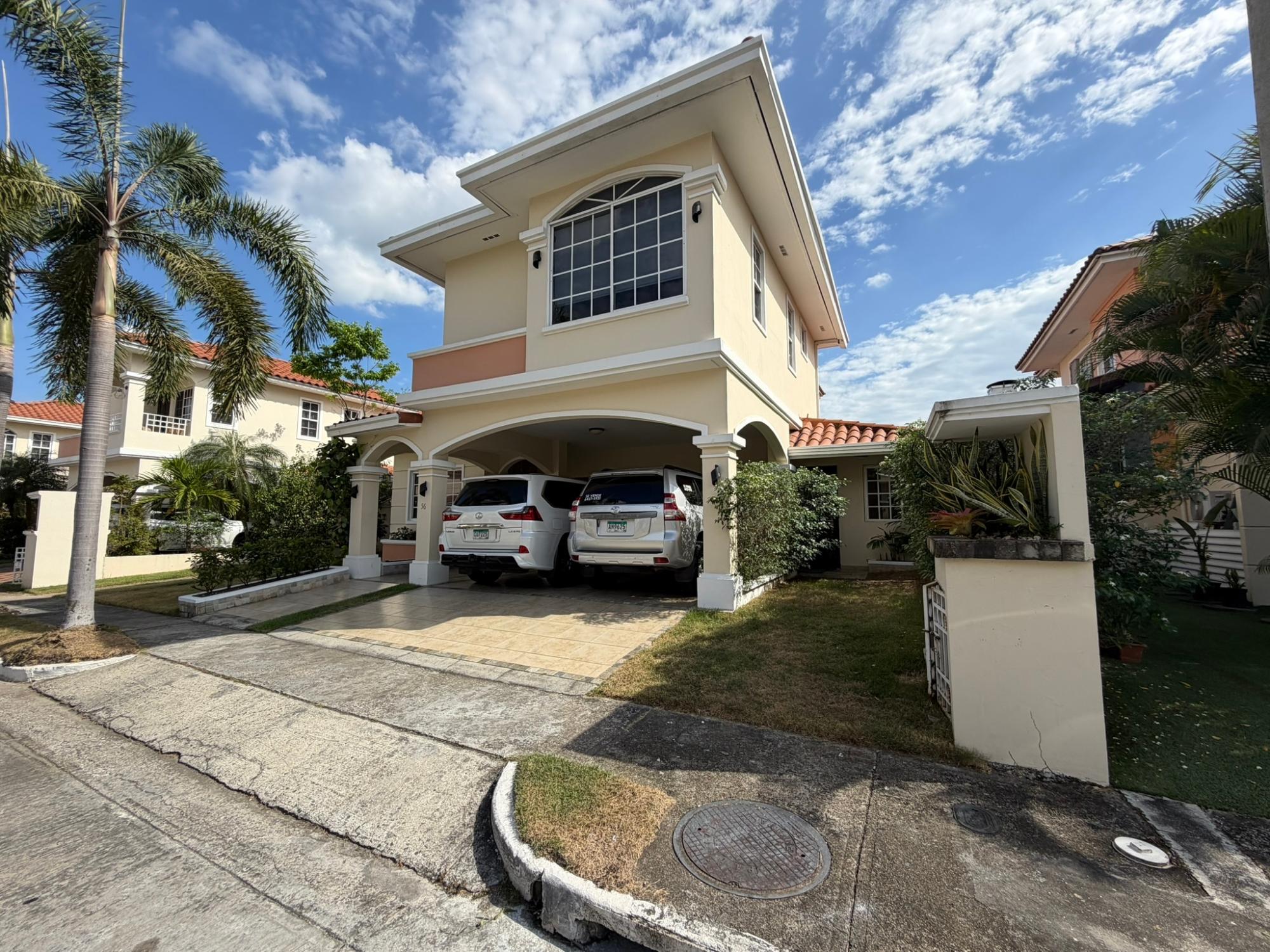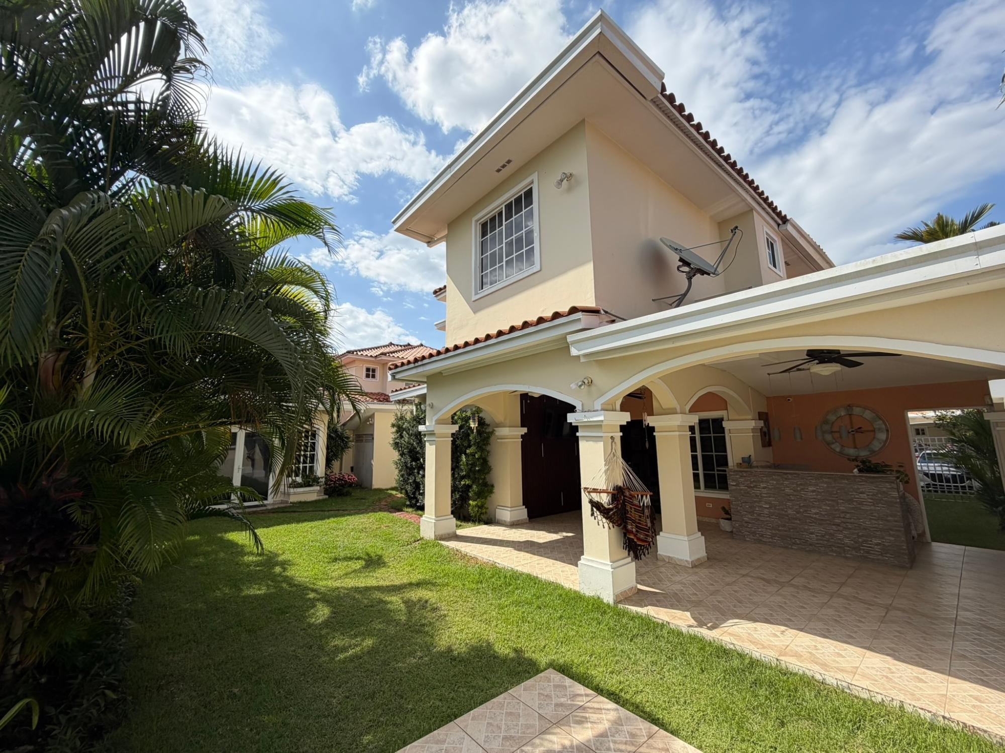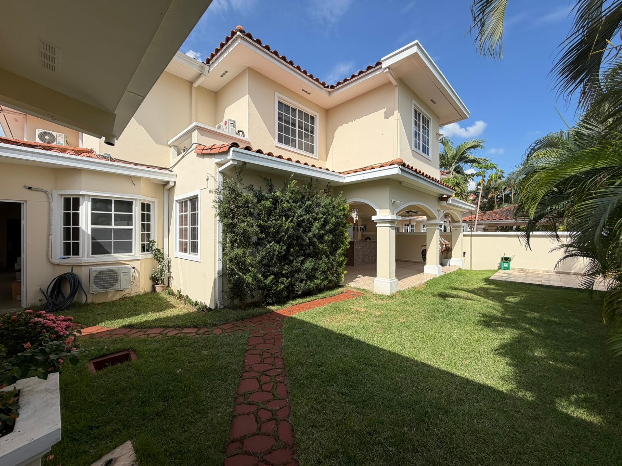 468.72 m² of land, 401.17 m² of construction, 2 parking spaces, 4 bedrooms, 4.5 bathrooms, maid’s quarters with bathroom, laundry area, den, TV room, breakfast nook, water tank room, attached house in the garden currently housing a private gym, BBQ area, and interior garden. Amenities include a social area with a pool, gym, BBQ, and 24/7 security. Maintenance fee: $200 (covers security, maintenance of common areas, gardening, and pest control). Located 5 minutes from the South Corridor, 10 minutes from the city’s financial center, and 10 minutes from Tocumen International Airport. Also within 5 minutes of shopping centers, pharmacies, schools, supermarkets, and much more.