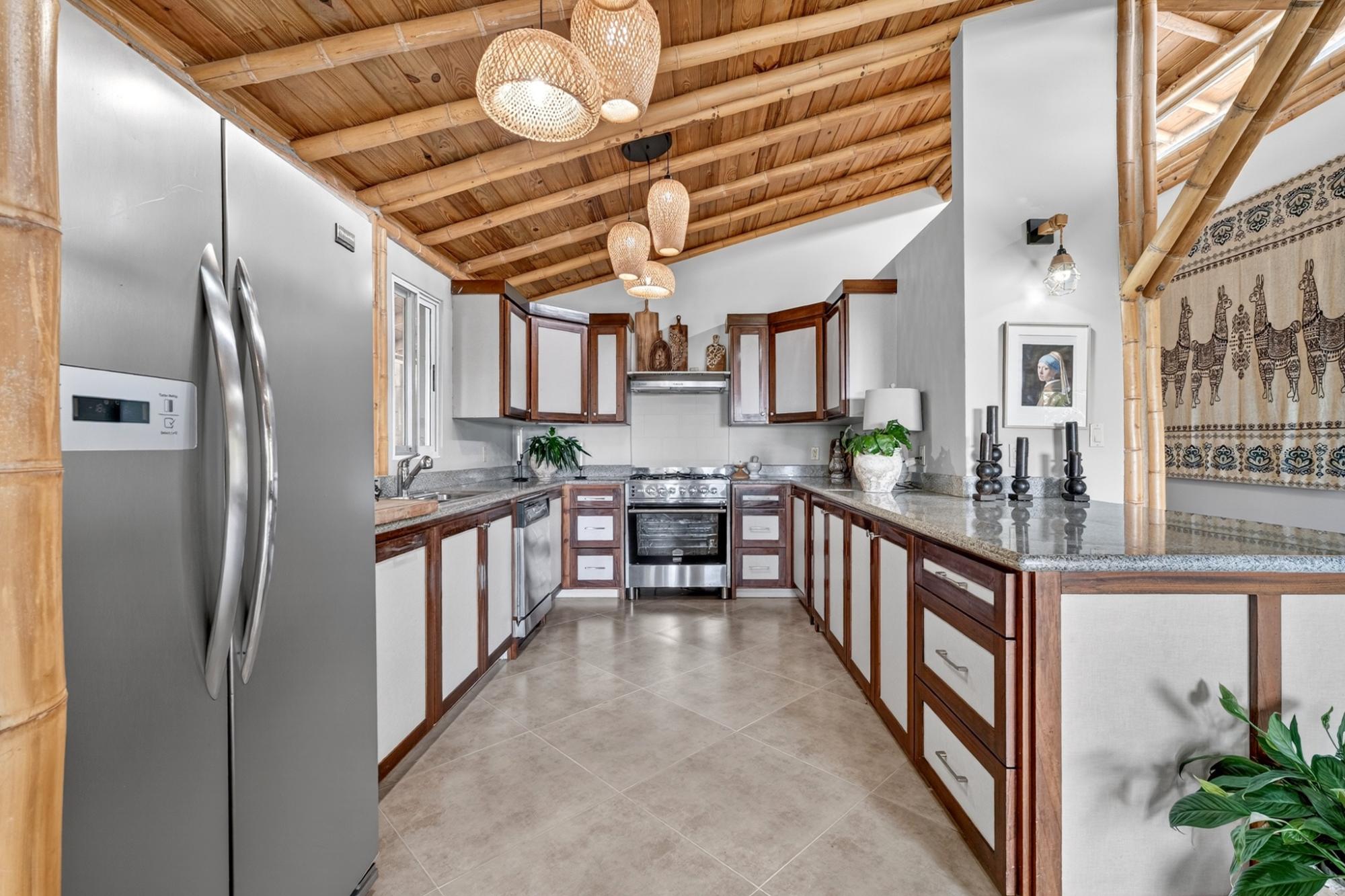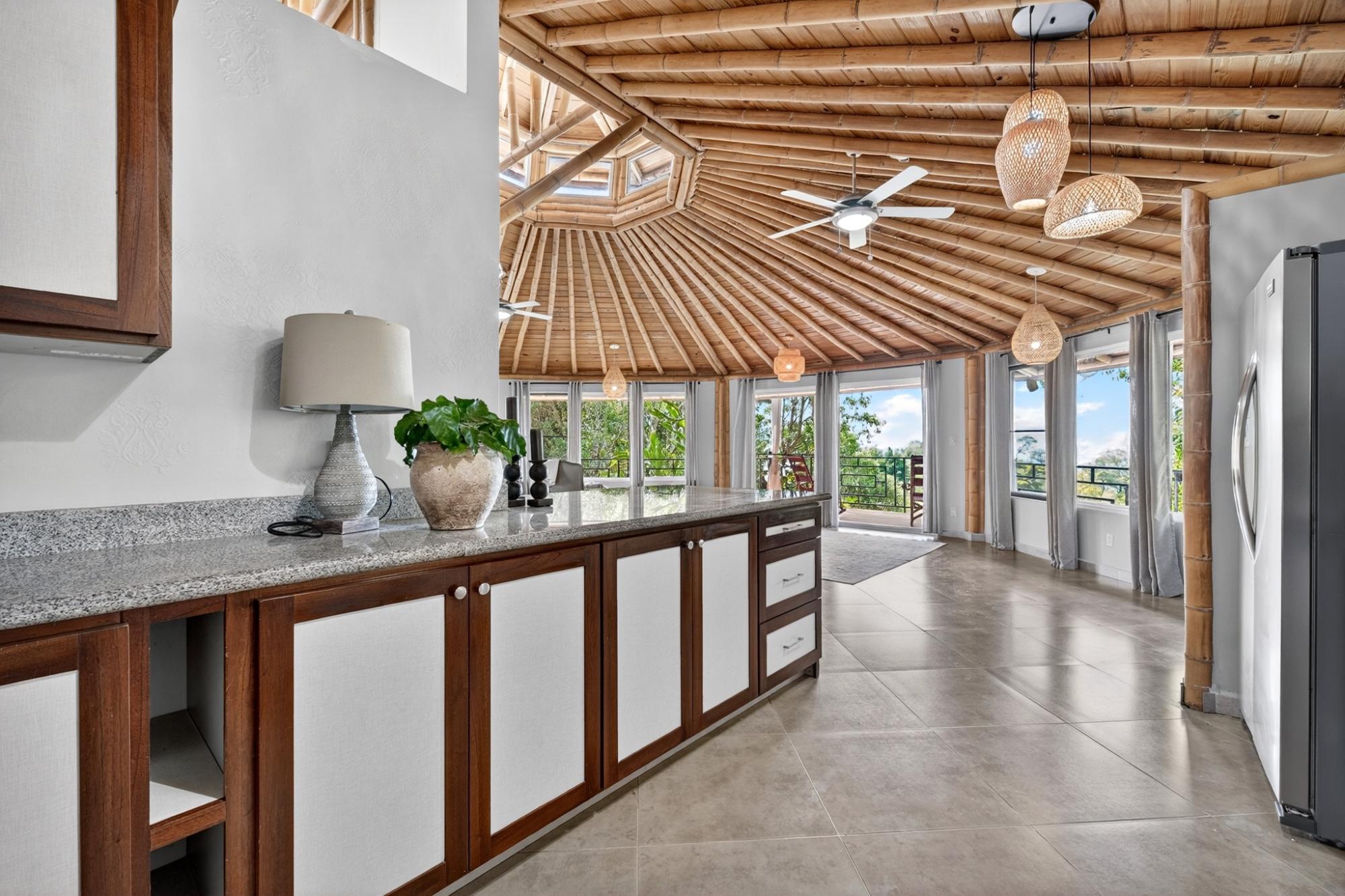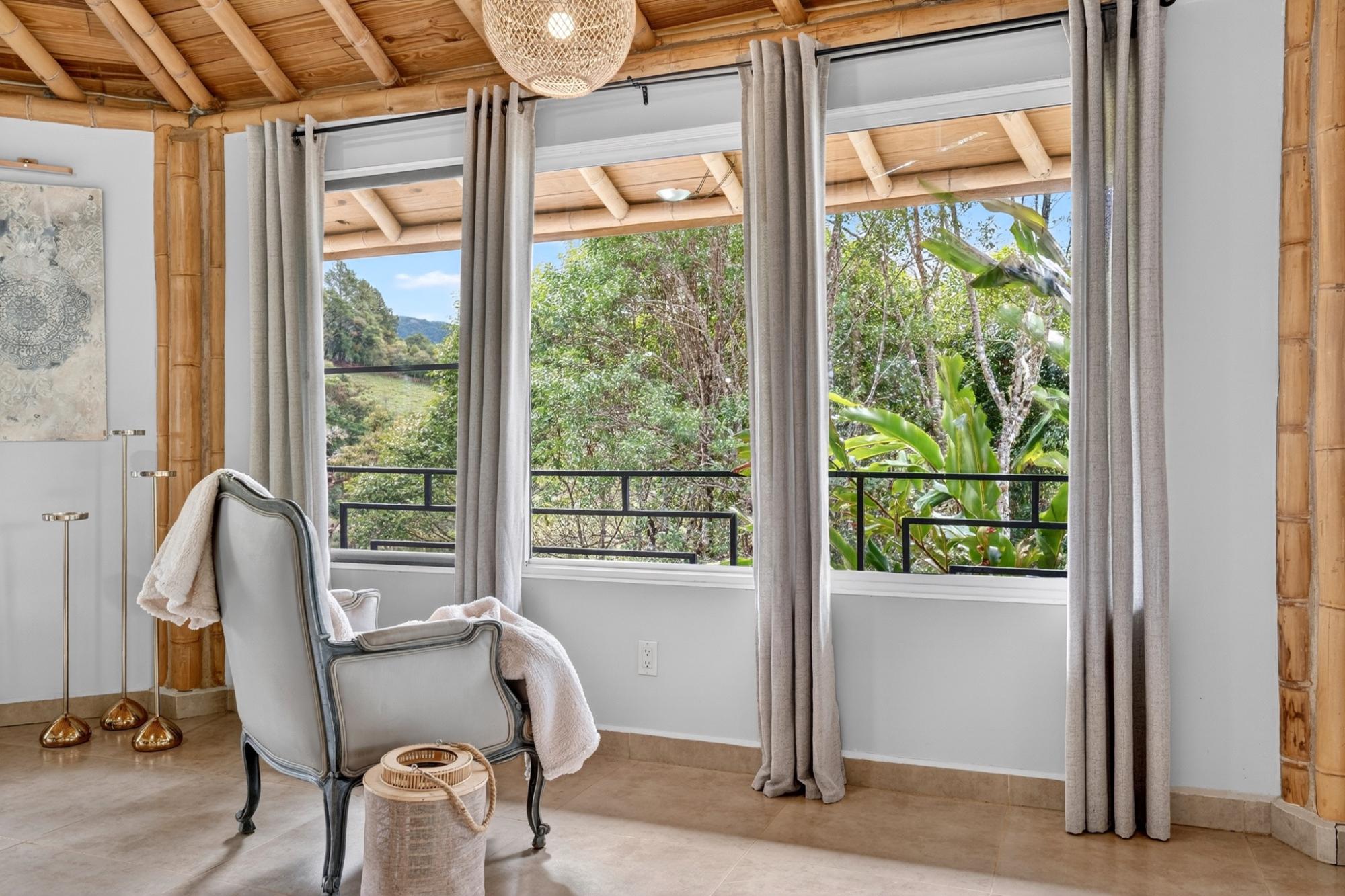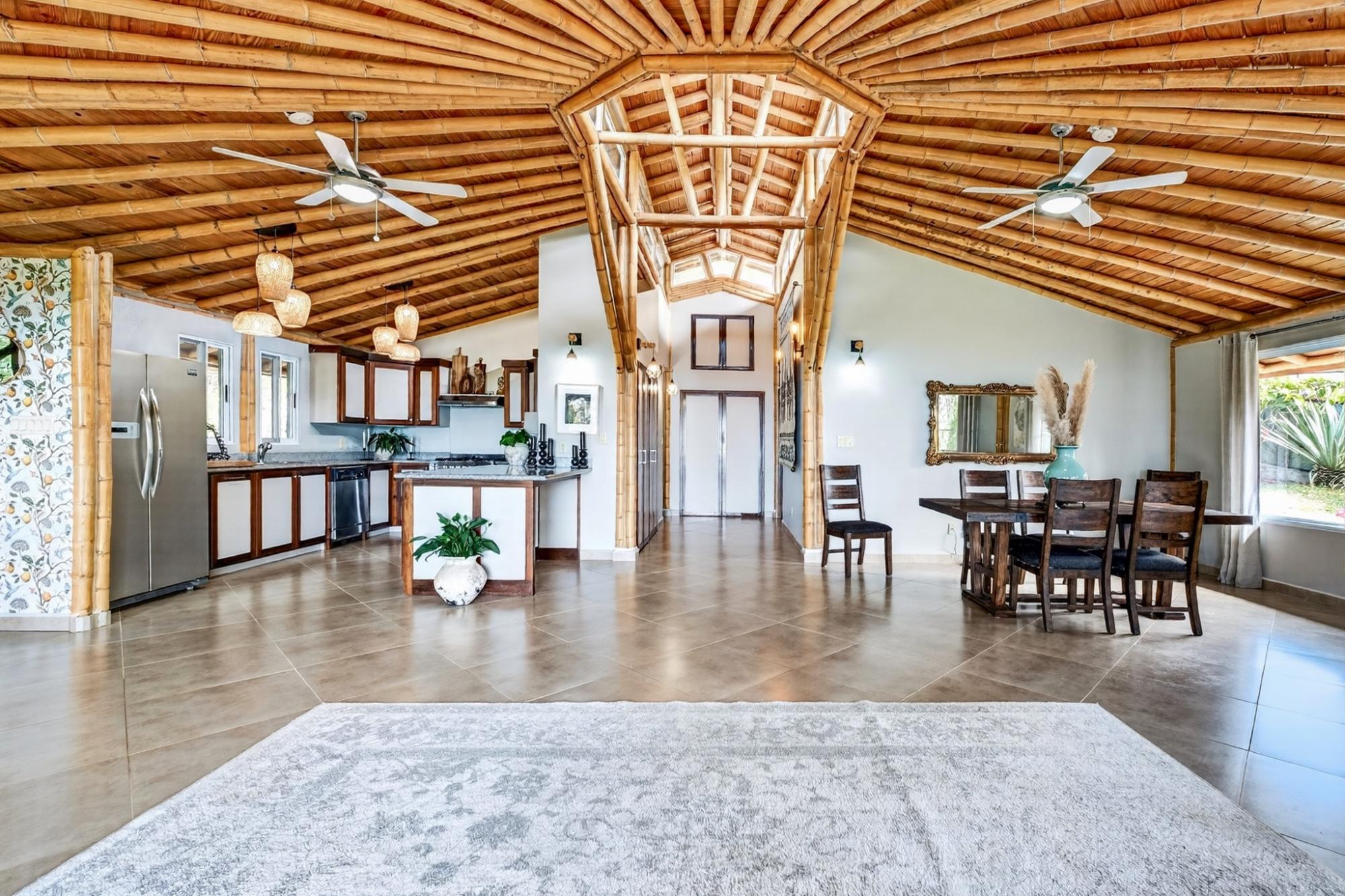 Tucked into the peaceful hills of Alto Jaramillo in the sought after Lemon Grove area, this charming two bedroom, two bath home blends warmth, character, and breathtaking natural beauty just 10 minutes from downtown Boquete. Inside, soaring bamboo ceilings create a striking architectural feature, while freshly painted interiors and modern decor offer a clean, updated feel. Natural light fills the open concept living, dining, and kitchen area, complete with quality appliances, ample counter space, and a central island for easy entertaining. The living space flows to a covered terrace with sensational mountain and greenery views, perfect for morning coffee or evening sunsets. Both bedrooms are generously sized, with a private primary suite. A beautifully designed home ideal for full time living or a peaceful retreat.