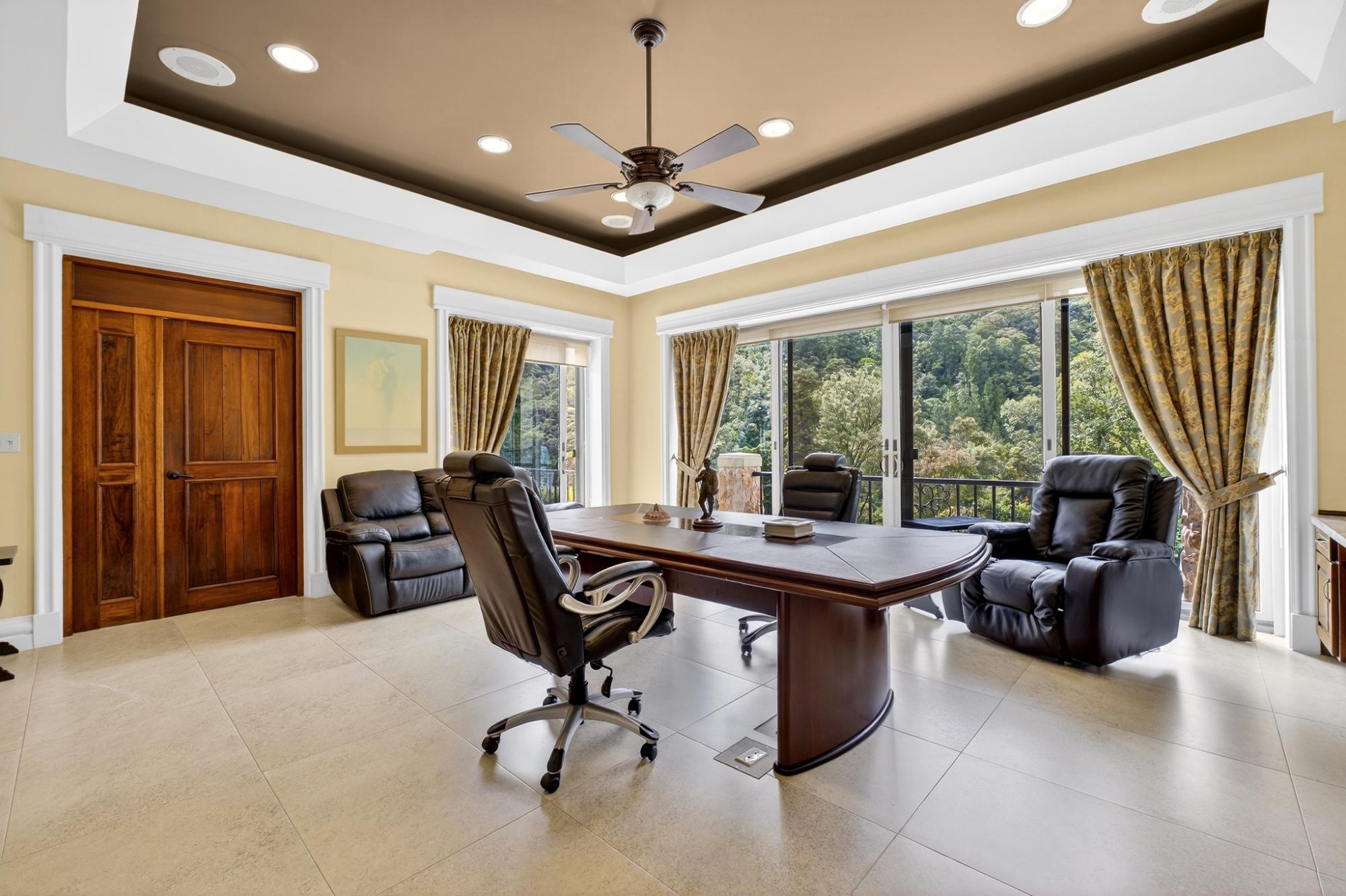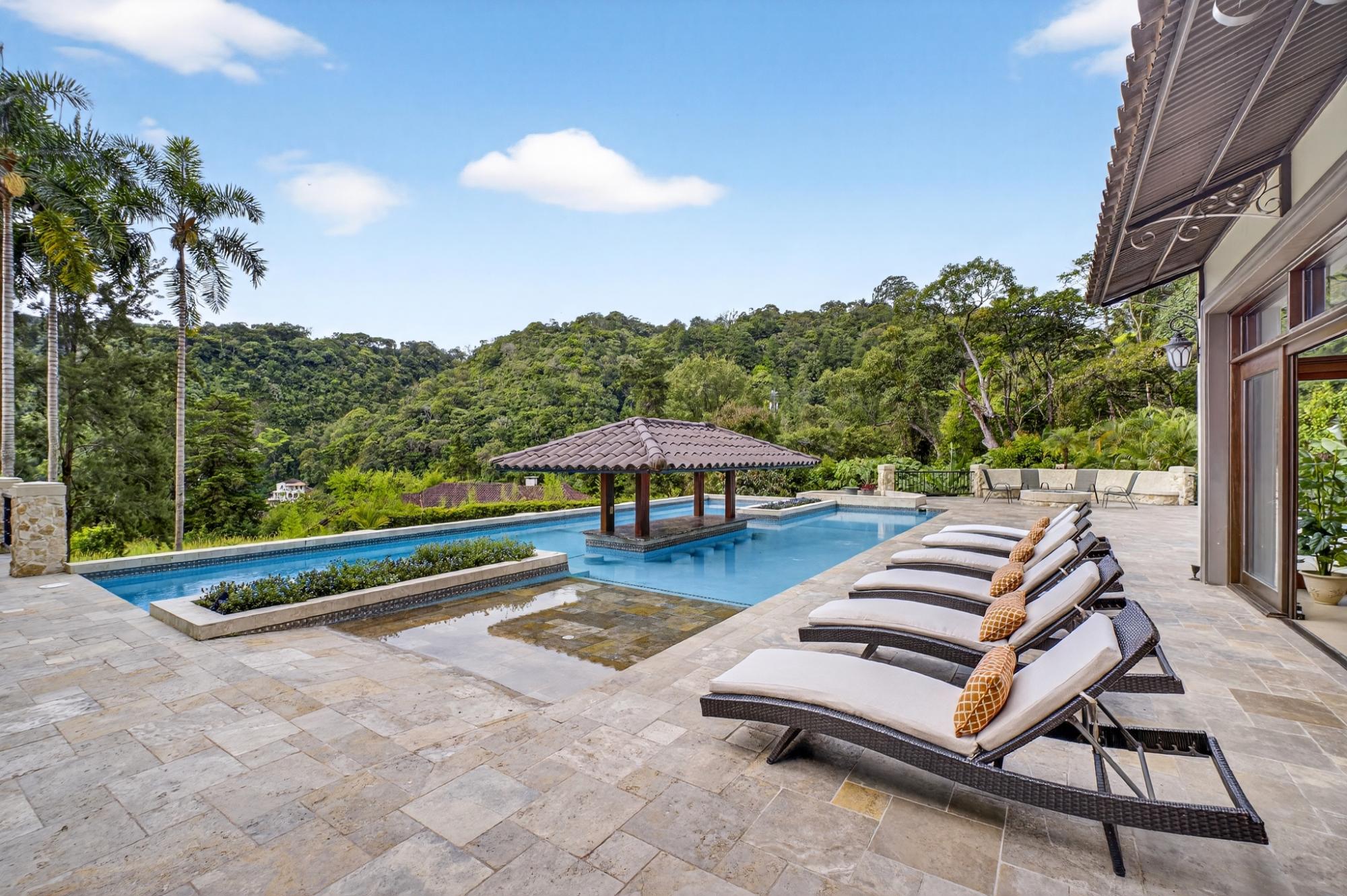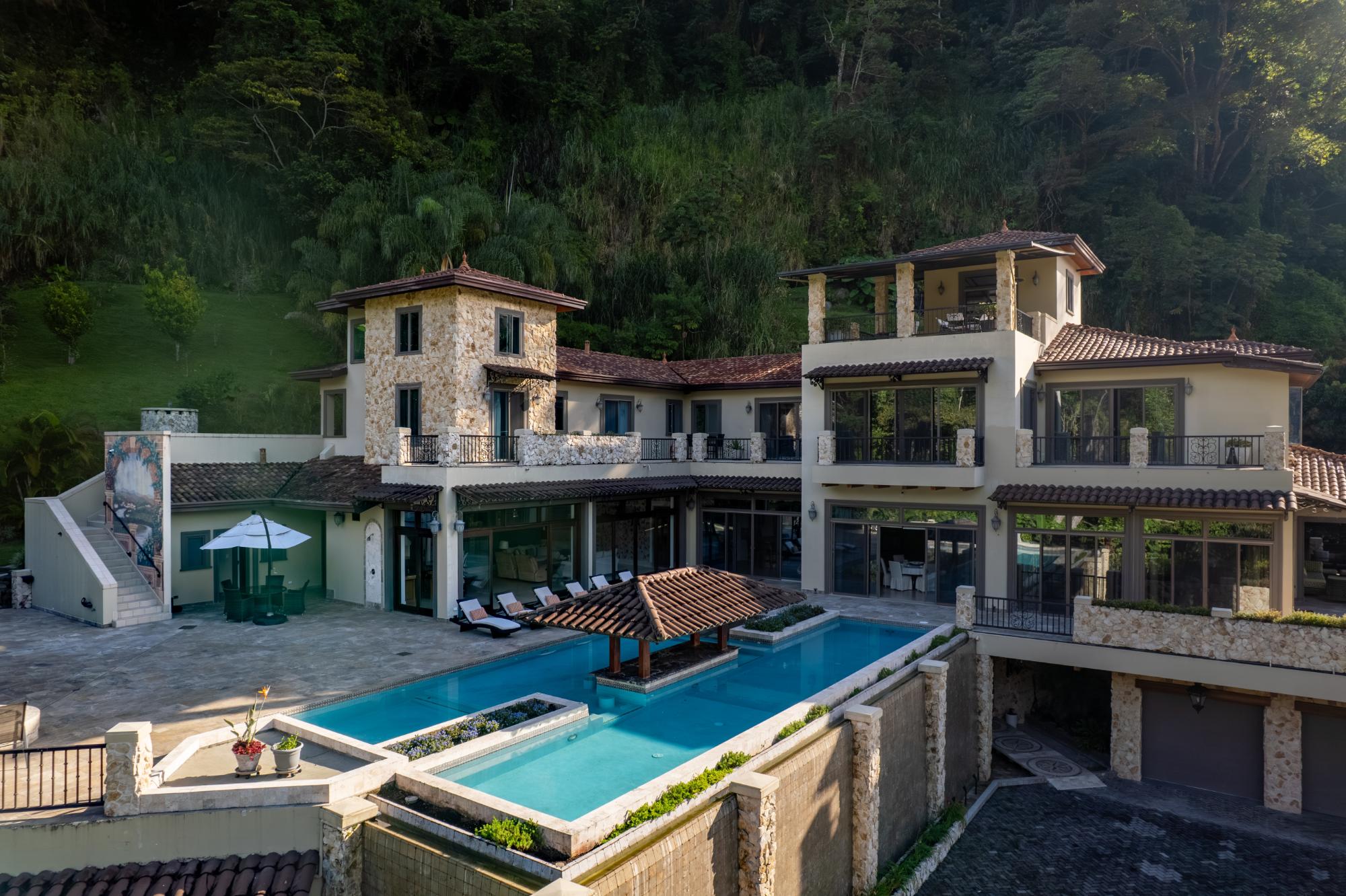 One of a kind luxurious mansion in Valle Escondido Boquete is positioned at the highest point of the valley set against mountainside. This private Estate home offers the perfect luxury and comfortable single family or corporate retreat experience with plenty of space for privacy. Enjoy comfortable year round temperatures in this unique mansion while viewing the sunset from a private balcony of the 4th level terrace and during summer time feel free to swim in it’s amazing private infinity swimming pool. This unique Estate comes fully furnished with 7 bedrooms, of which 3 are Master Suites accompanied by 9 full bathrooms & 2 half-baths. A built in elevator provides easy access to all 4 stories. Host your guests in any of the 3 on site guest houses.The estate is equipped with full time, triple gate security and camera system that will provide high end security. Step out onto one of the many endless balconies and view the lush forest and enjoy the tranquility with your friends and family while admiring its luxurious architecture design and enjoy one of the 2 outdoor fireplaces while taking in the panoramic mountain scenery. Within Valle Escondido, you can experience all there is to offer including amenities such as a golf course, tennis courts and mini golf, a hair salon, spa & wellness center, country