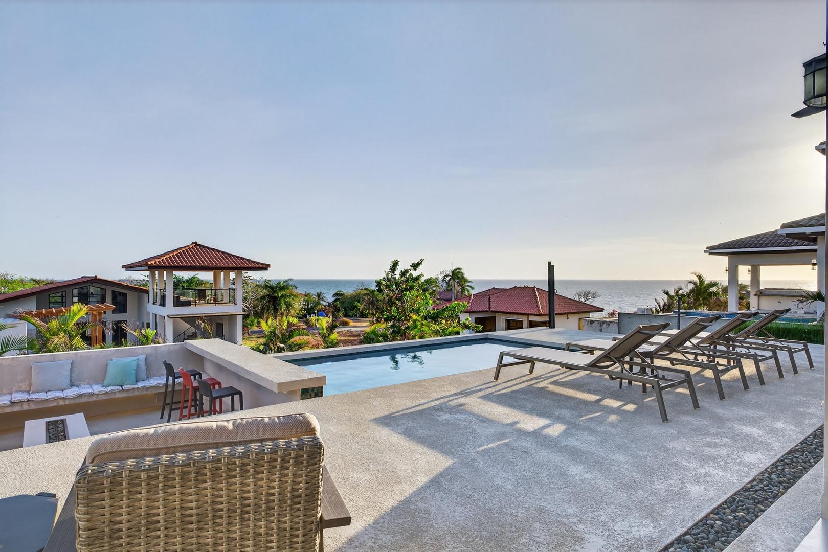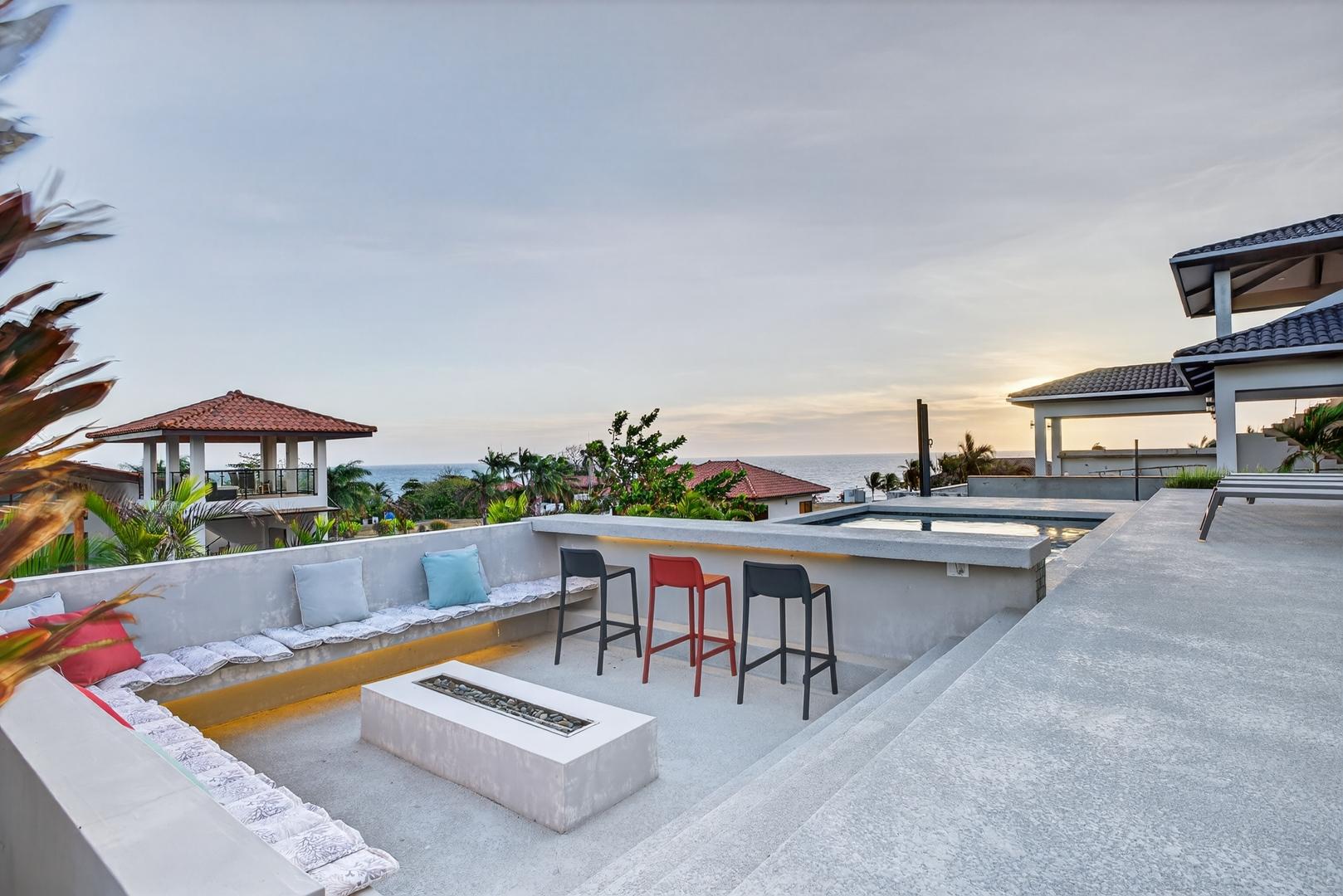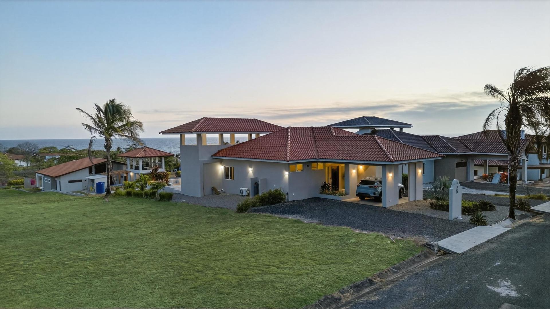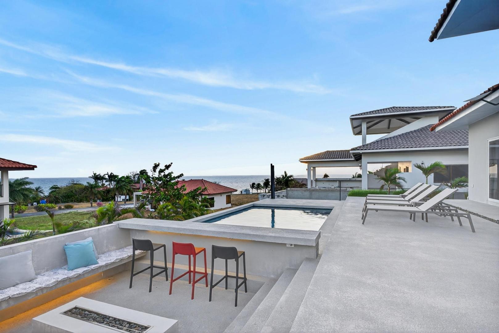 Completed in 2024–2025, this professionally designed ocean view home is located in Andromeda Ocean Estates, minutes from the beach and positioned to capture wide Pacific views, steady breezes, and direct sightlines toward Iguana Island. Set on an 841.76 m2 lot with approximately 230 m2 of construction, the home was designed for entertaining and comfortable everyday living. The layout blends indoor and outdoor areas, creating gathering spaces while maintaining privacy. The main terrace opens to a private elevated pool deck overlooking the ocean with unobstructed views and steady airflow. Integrated lighting enhances evening ambiance. A sunken lounge with built-in seating and a central fire feature overlooks both the pool and ocean horizon. The community beach club is nearby and visible from the property. Inside, high ceilings and sliding glass doors frame pool and ocean views. The kitchen integrates with the living and dining areas, and large sliding doors create seamless indoor-outdoor flow. The home includes 3 bedrooms and 2.5 bathrooms. The primary bedroom features ocean views and direct outdoor access. Secondary bedrooms are well sized and private. Concrete block construction with clay shingle roof. Electricity through Naturgy, community water, backup tank, central propane, filtration and irrigation systems. Carport for 2 vehicles. Monthly maintenance approximately $195.