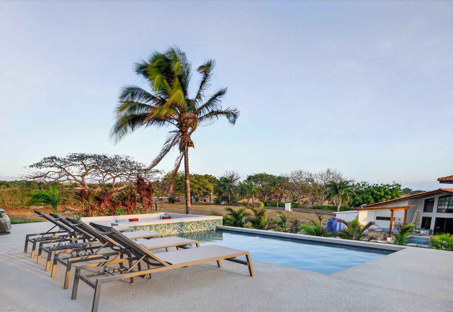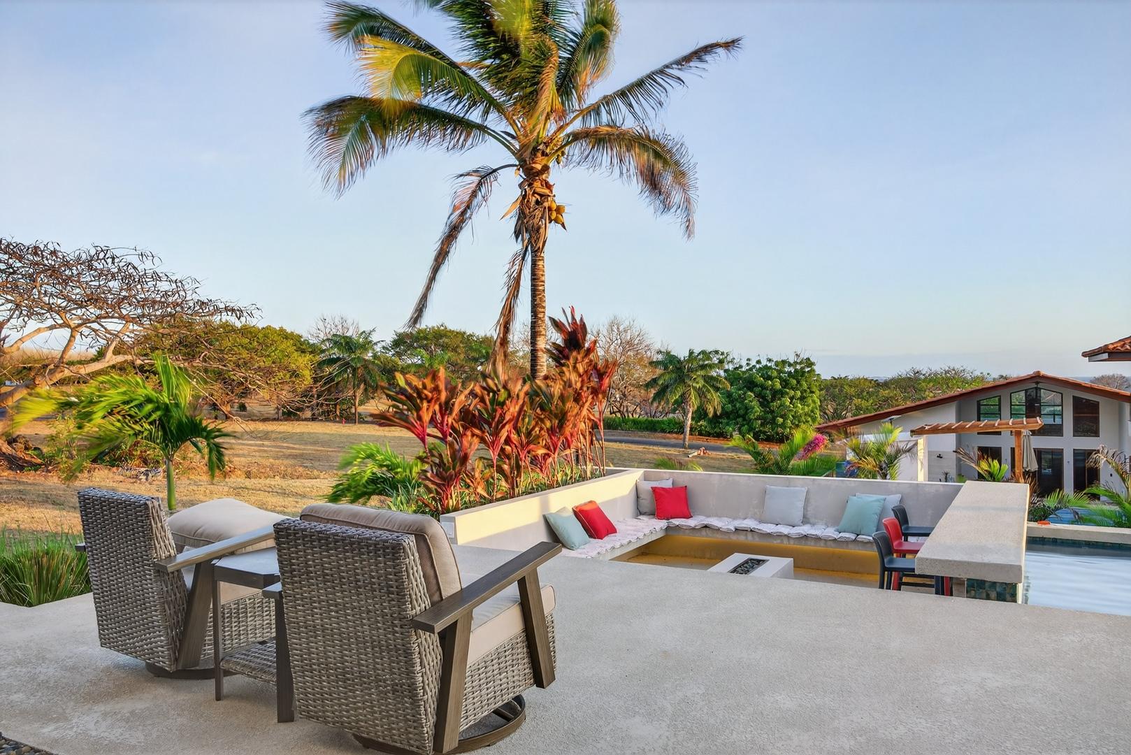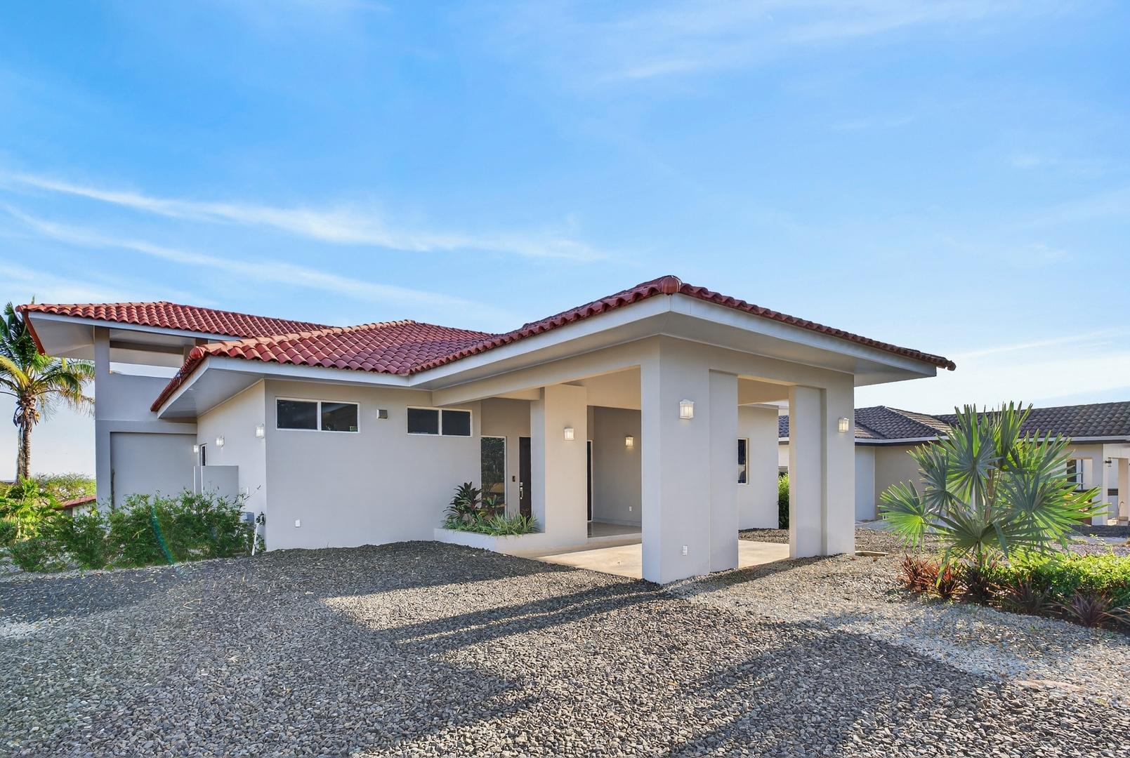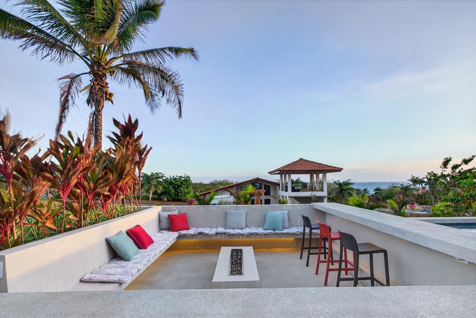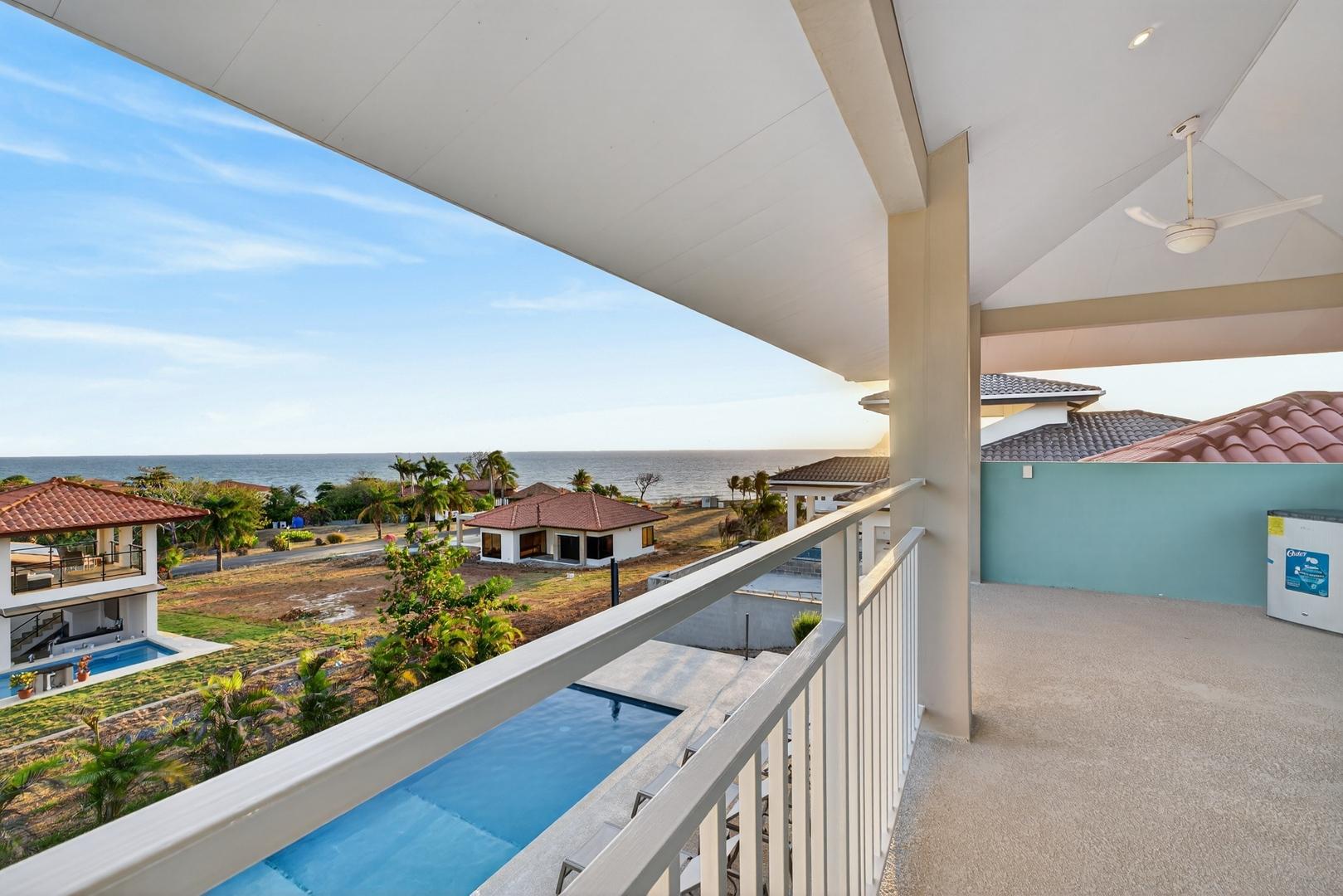 Completed in 2024–2025, this professionally designed ocean view home is located in Andromeda Ocean Estates, minutes from the beach and positioned to capture wide Pacific views, steady breezes, and direct sightlines toward Iguana Island. Set on an 841.76 m2 lot with approximately 230 m2 of construction, the home was designed for entertaining and comfortable everyday living. The layout blends indoor and outdoor areas, creating gathering spaces while maintaining privacy. The main terrace opens to a private elevated pool deck overlooking the ocean with unobstructed views and steady airflow. Integrated lighting enhances evening ambiance. A sunken lounge with built-in seating and a central fire feature overlooks both the pool and ocean horizon. The community beach club is nearby and visible from the property. Inside, high ceilings and sliding glass doors frame pool and ocean views. The kitchen integrates with the living and dining areas, and large sliding doors create seamless indoor-outdoor flow. The home includes 3 bedrooms and 2.5 bathrooms. The primary bedroom features ocean views and direct outdoor access. Secondary bedrooms are well sized and private. Concrete block construction with clay shingle roof. Electricity through Naturgy, community water, backup tank, central propane, filtration and irrigation systems. Carport for 2 vehicles. Monthly maintenance approximately $195.