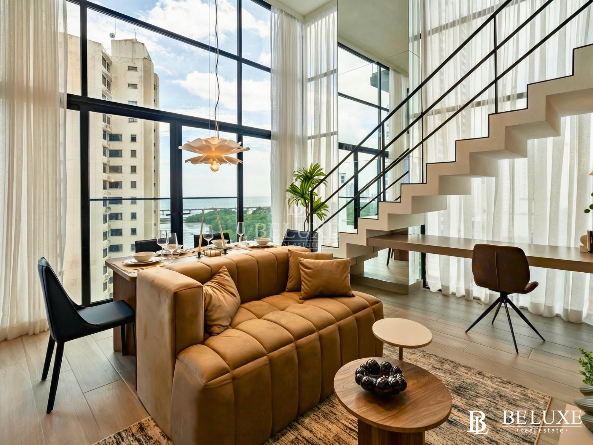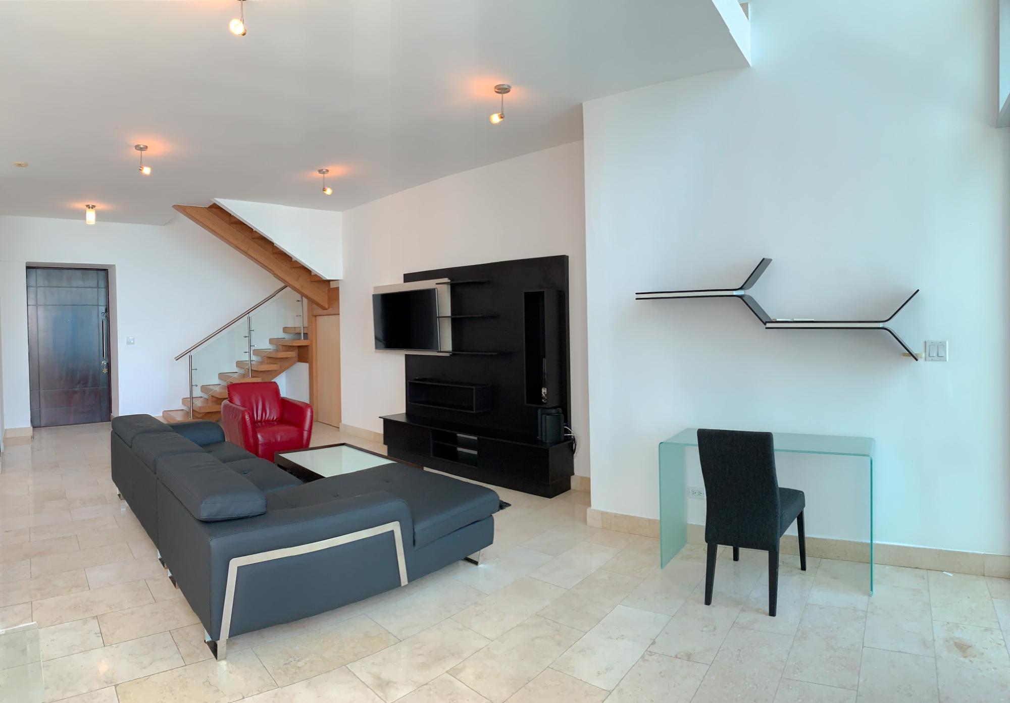 For sale or rent: a spectacular loft-style apartment in PH Pacific Village, located in Punta Pacifica. The apartment is distributed over two levels and offers a spacious, double-height living and dining area with excellent natural light, ocean views, and access to a balcony. It also features a spacious master bedroom with an integrated sitting area, a full bathroom, and a walk-in closet, providing a comfortable, private, and sophisticated ambiance. Additionally, it includes a guest half-bathroom, laundry room, two parking spaces, and a storage unit. Pacific Village boasts a complete social area that includes a swimming pool for adults and children, a fully equipped gym, a spa with a jacuzzi, sauna, and Turkish bath, a game room, a soccer field, green areas, a luxurious double-height lobby, a security gate, and 24/7 surveillance. An excellent option for those seeking a prime location, modern design, and high-end amenities in one of the city’s most exclusive areas.