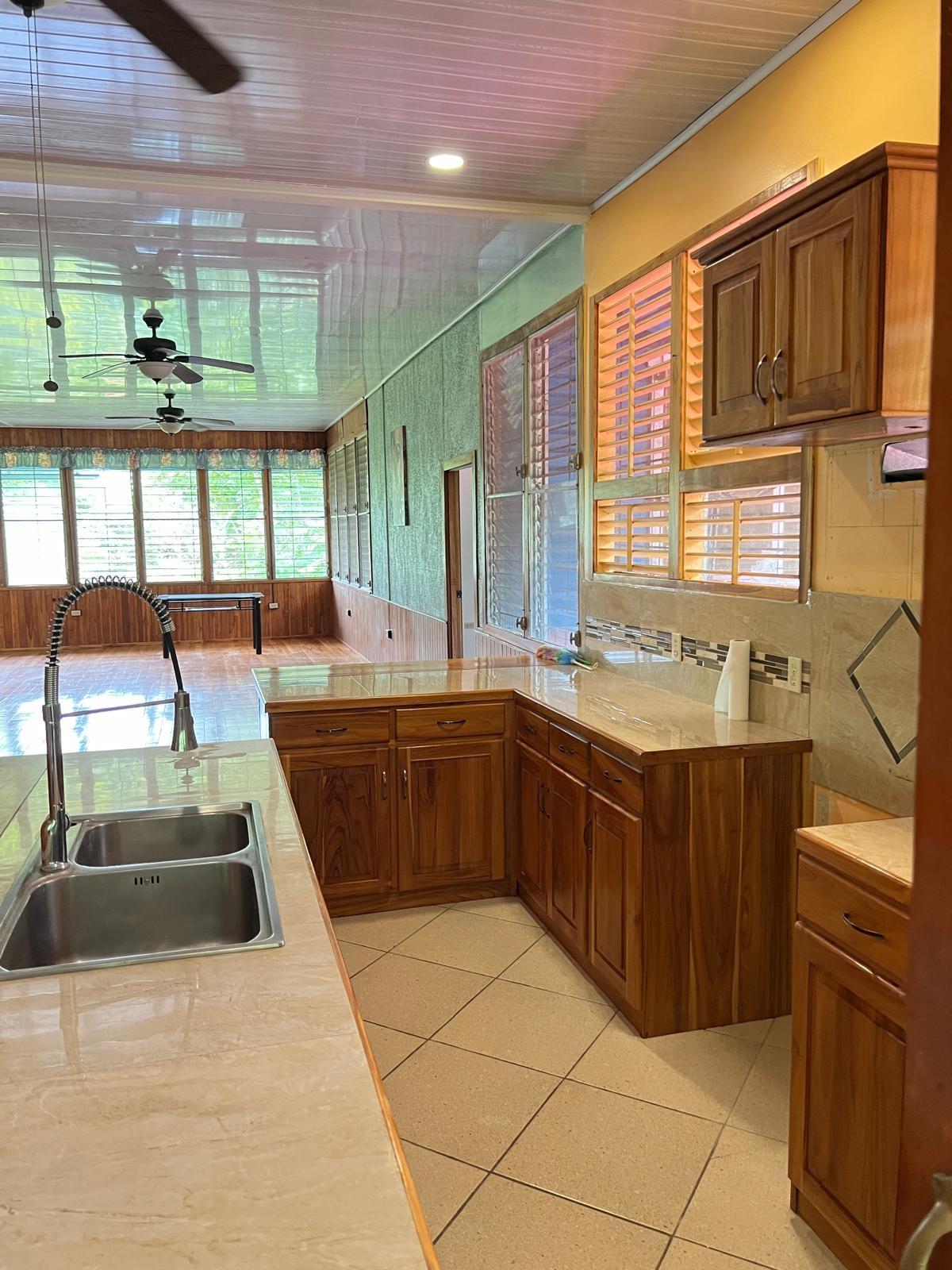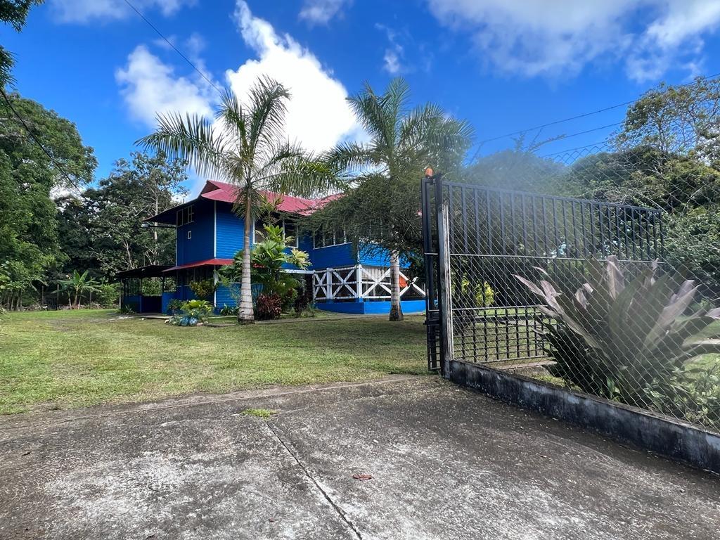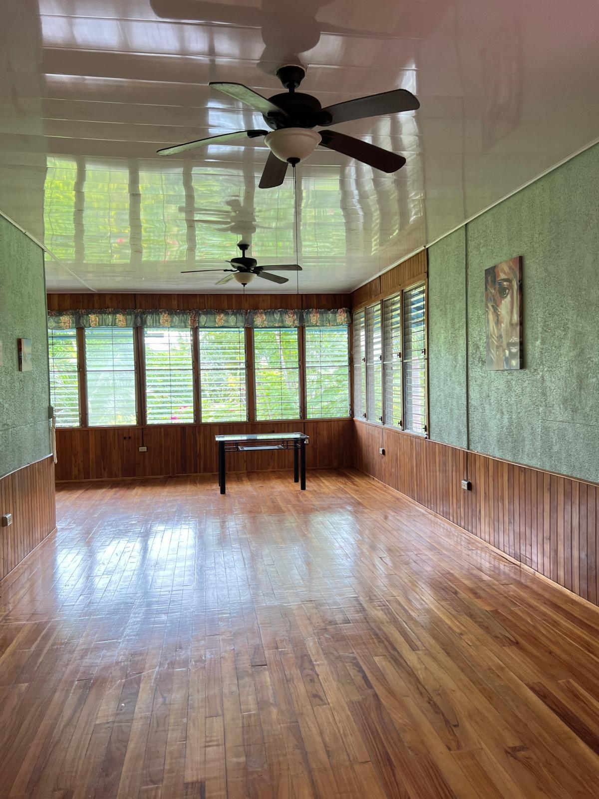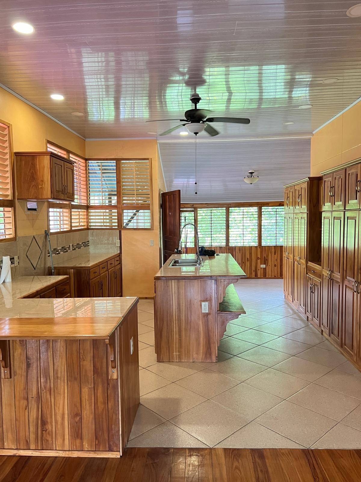 Beautifully Restored Classic Plantation Home in Puerto Armuelles Painstakingly updated to modern standards while maintaining the elegance and charm of the original 1940’s post and beam construction. The 2118 square foot main floor has three bedrooms and two full baths, with a fully equipped one bedroom and one bathroom apartment downstairs. The large kitchen has a central island, breakfast bar, tile floors and expansive storage cabinets of native teak. The upper living areas of the house are graced with beautiful new hardwood floors. The house is designed to take advantage of the Pacific breeze–you can even hear the whisper of the waves from the house. Windows cover most of the external walls, with ceiling fans in every room. The three bedrooms are spacious and the ceilings are 9 feet throughout the house, giving even more of an open feeling. The home comes partly furnished. The lower level features a one bedroom, 1 bath air-conditioned guest quarters with a large indoor laundry room and new teak closets. The apartment has been rented for $500 per month, so it can be used for income or as a guest quarters. The apartment comes partly furnished. Modern amenities such as phone, satellite TV, and DSL hook-up are available. A reserve water tank with a pressurized pump system ensures you will always have plenty of water. The property is landscaped and there is an automatic electric gate at the driveway entrance.