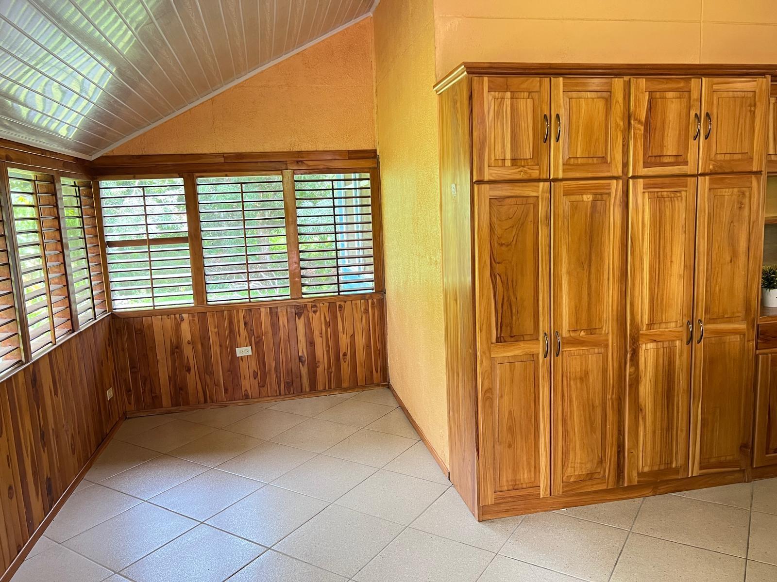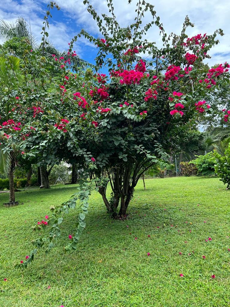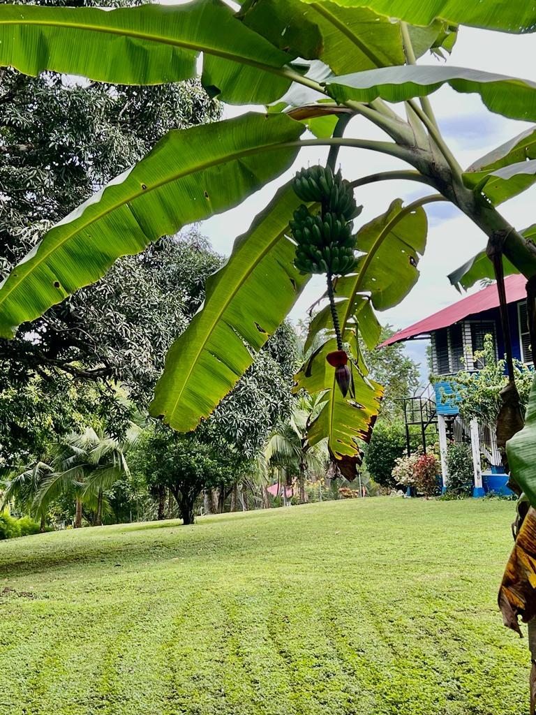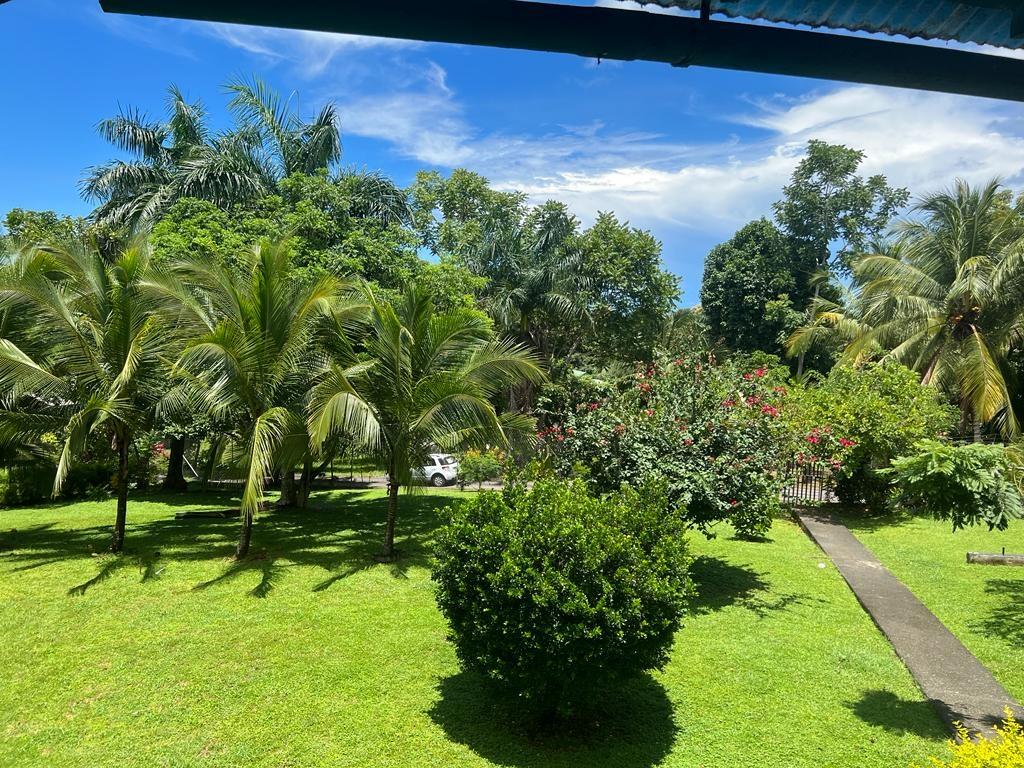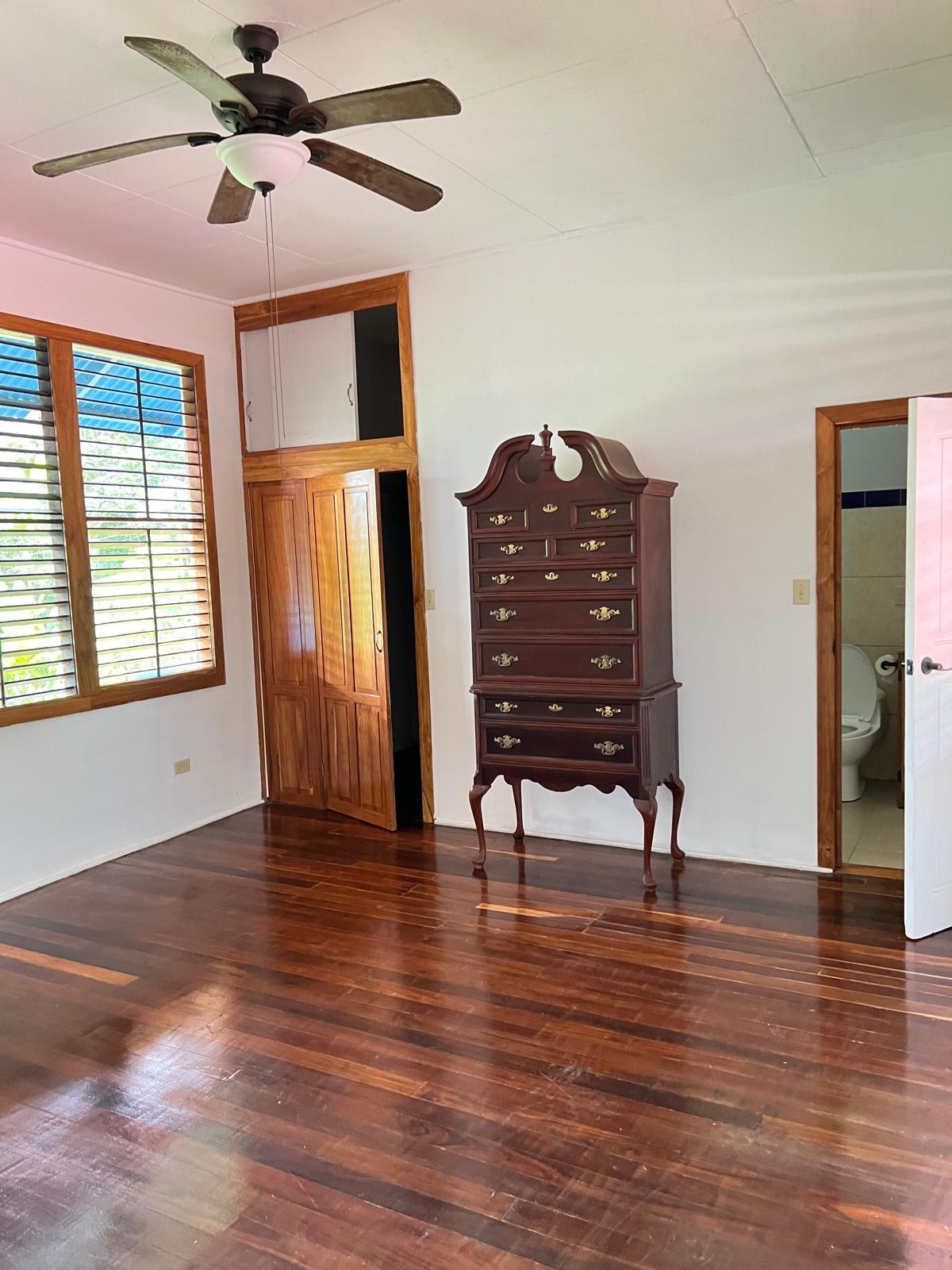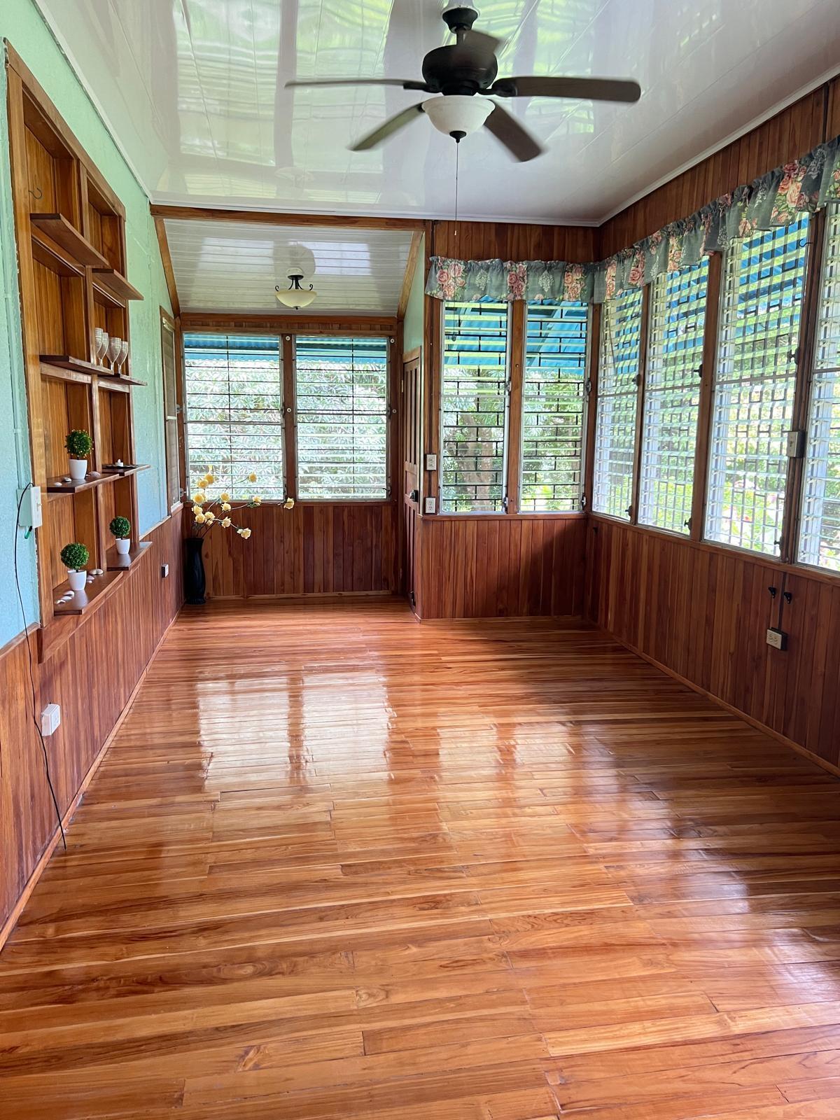 Beautifully Restored Classic Plantation Home in Puerto Armuelles Painstakingly updated to modern standards while maintaining the elegance and charm of the original 1940’s post and beam construction. The 2118 square foot main floor has three bedrooms and two full baths, with a fully equipped one bedroom and one bathroom apartment downstairs. The large kitchen has a central island, breakfast bar, tile floors and expansive storage cabinets of native teak. The upper living areas of the house are graced with beautiful new hardwood floors. The house is designed to take advantage of the Pacific breeze–you can even hear the whisper of the waves from the house. Windows cover most of the external walls, with ceiling fans in every room. The three bedrooms are spacious and the ceilings are 9 feet throughout the house, giving even more of an open feeling. The home comes partly furnished. The lower level features a one bedroom, 1 bath air-conditioned guest quarters with a large indoor laundry room and new teak closets. The apartment has been rented for $500 per month, so it can be used for income or as a guest quarters. The apartment comes partly furnished. Modern amenities such as phone, satellite TV, and DSL hook-up are available. A reserve water tank with a pressurized pump system ensures you will always have plenty of water. The property is landscaped and there is an automatic electric gate at the driveway entrance.