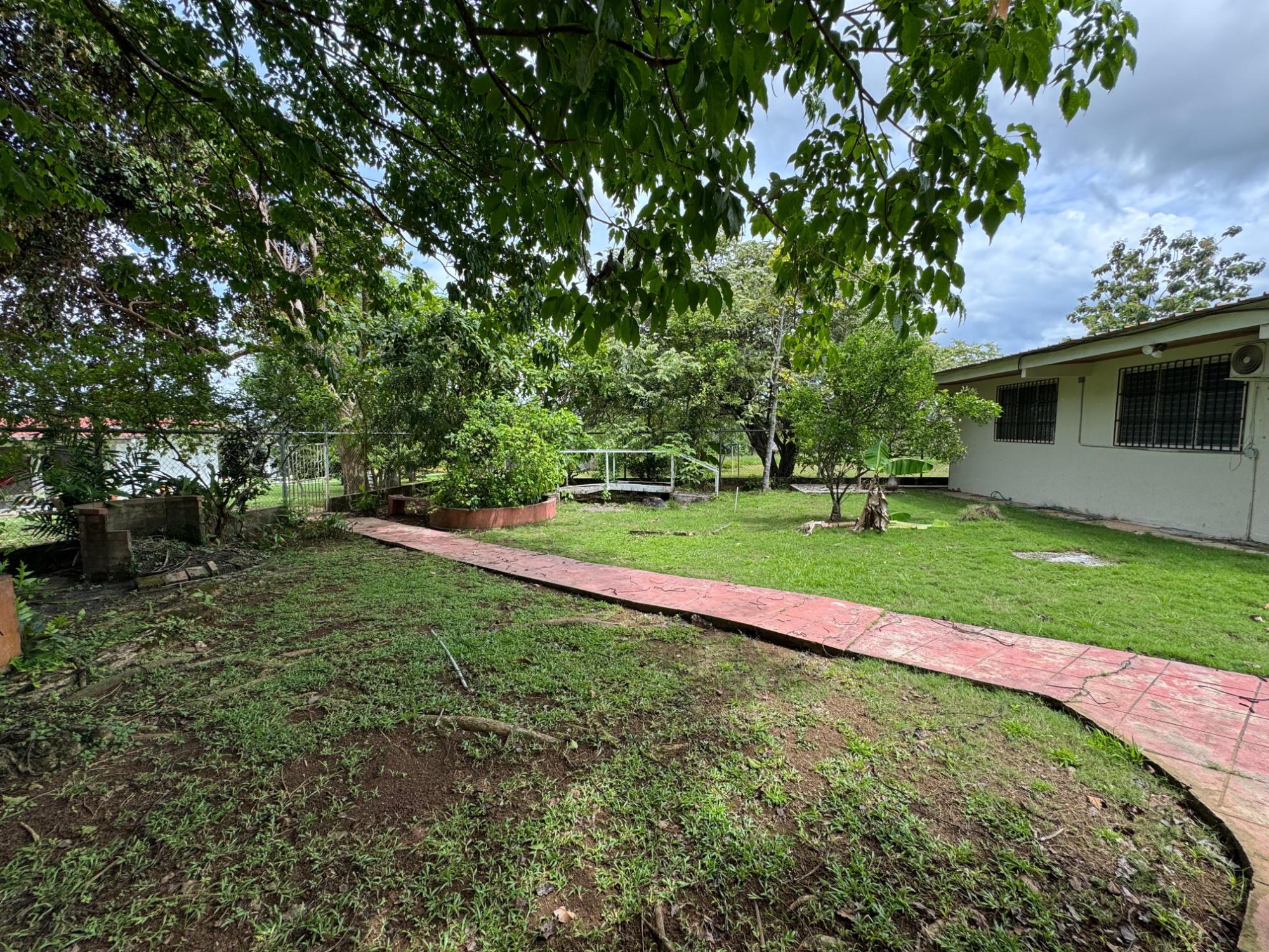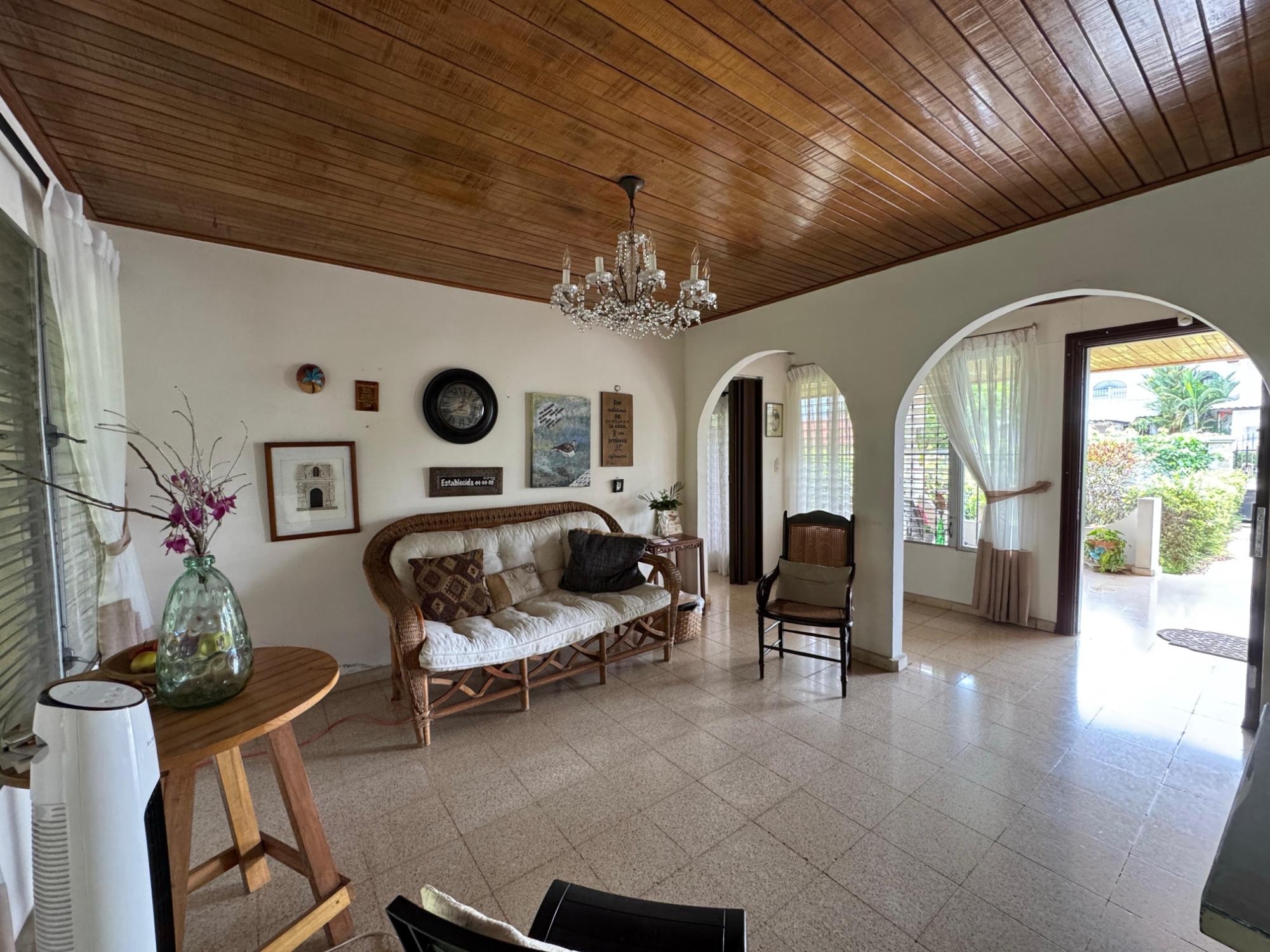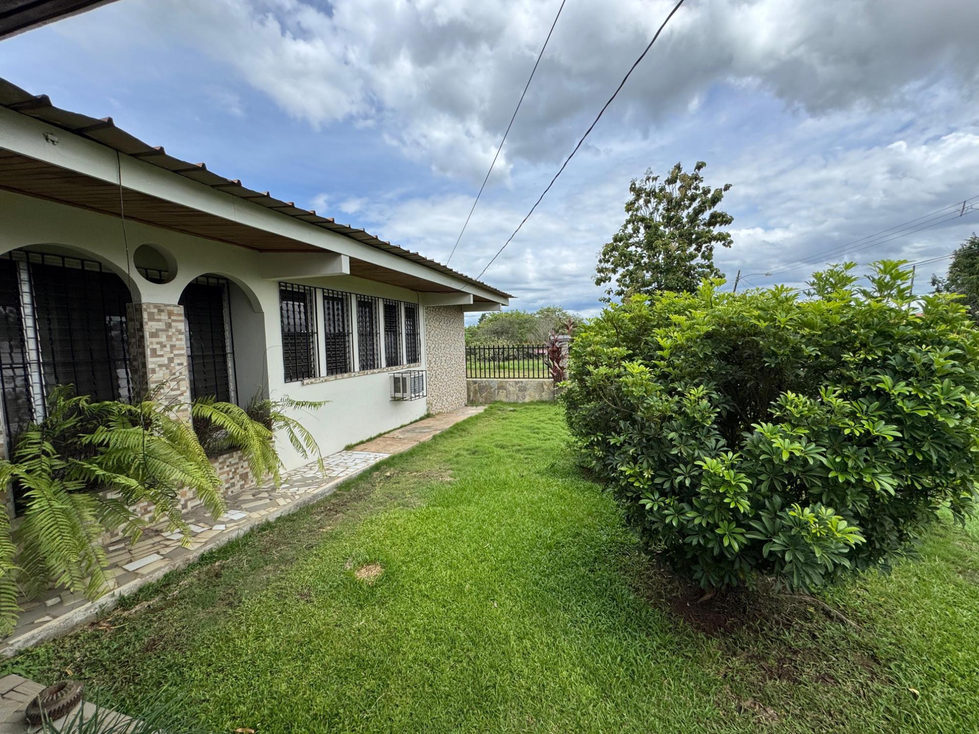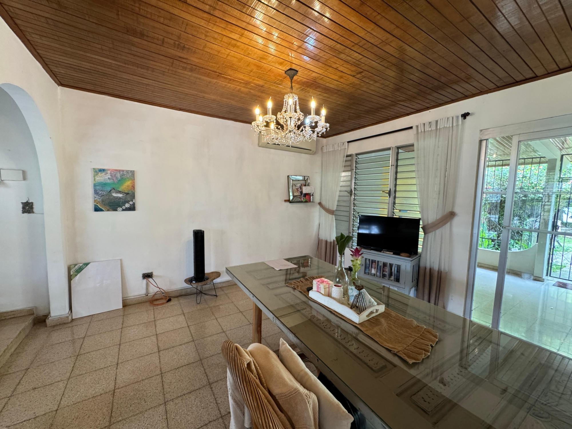 This property is located in a residential street in Santiago de Veraguas, sitting on a flat lot of 1,050 m² with ample space for outdoor living. The house has a built area of 212.40 m², along with semi-open spaces of 93.78 m² and a paved area of 107.09 m². Property Features: Bedrooms and Bathrooms: The home offers 4 bedrooms and 4 bathrooms. The master bedroom includes a custom-built teak closet (installed in 2023) and an en-suite bathroom. Living and Dining Areas: The spacious, open-plan living and dining area leads directly to a covered terrace, providing an ideal space for both everyday living and entertaining. Service Quarters: The property includes an independent service room with its own bathroom, adding flexibility for extra accommodation or storage needs. Kitchen: The kitchen was remodeled in 2020, featuring modern appliances and a functional layout. Parking and Outdoor Space: A covered portal provides parking space for two vehicles. The property also includes fruit and forest trees, offering a private green space.