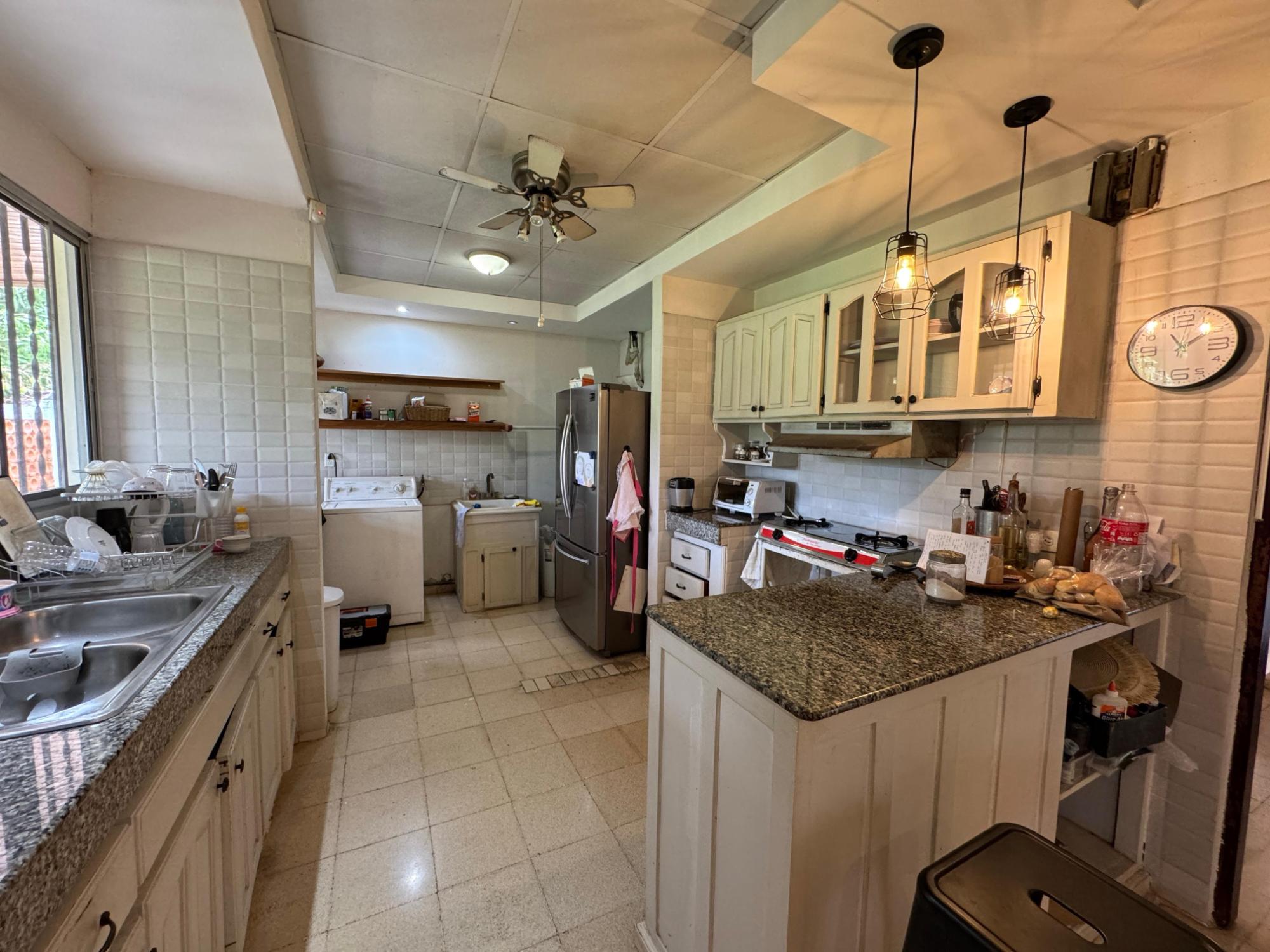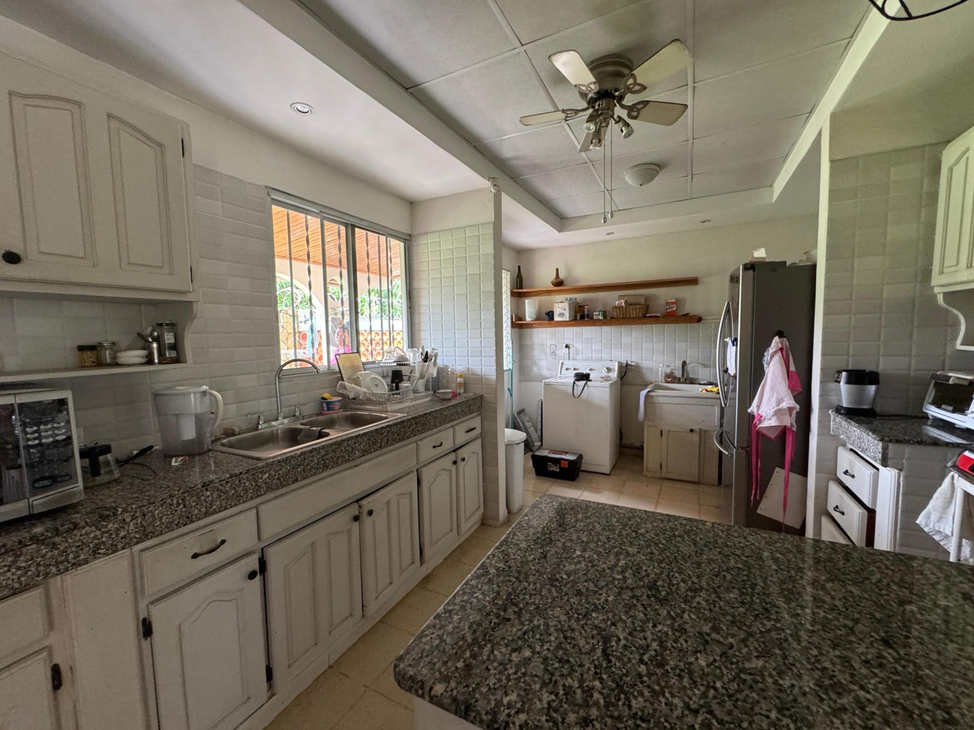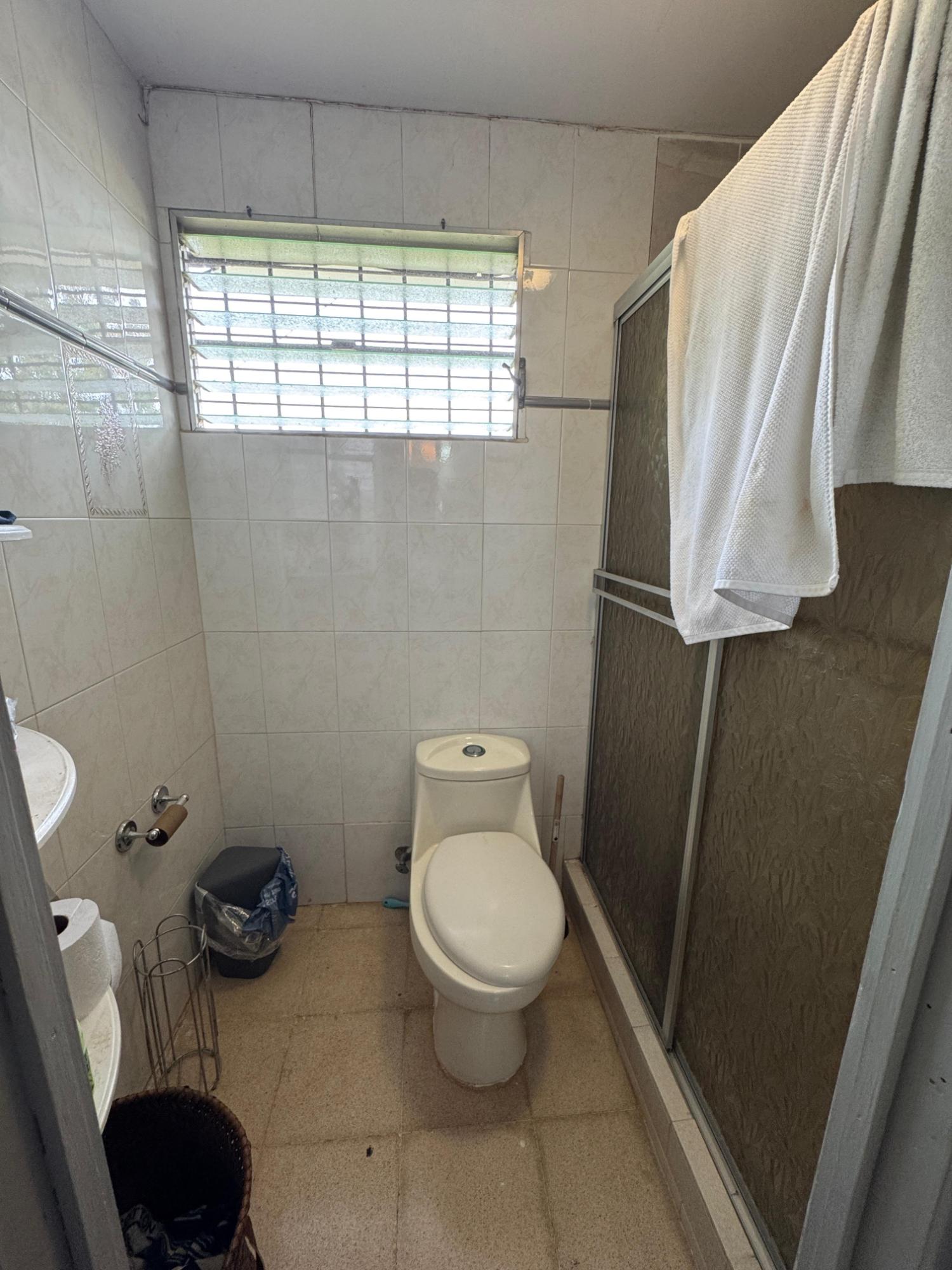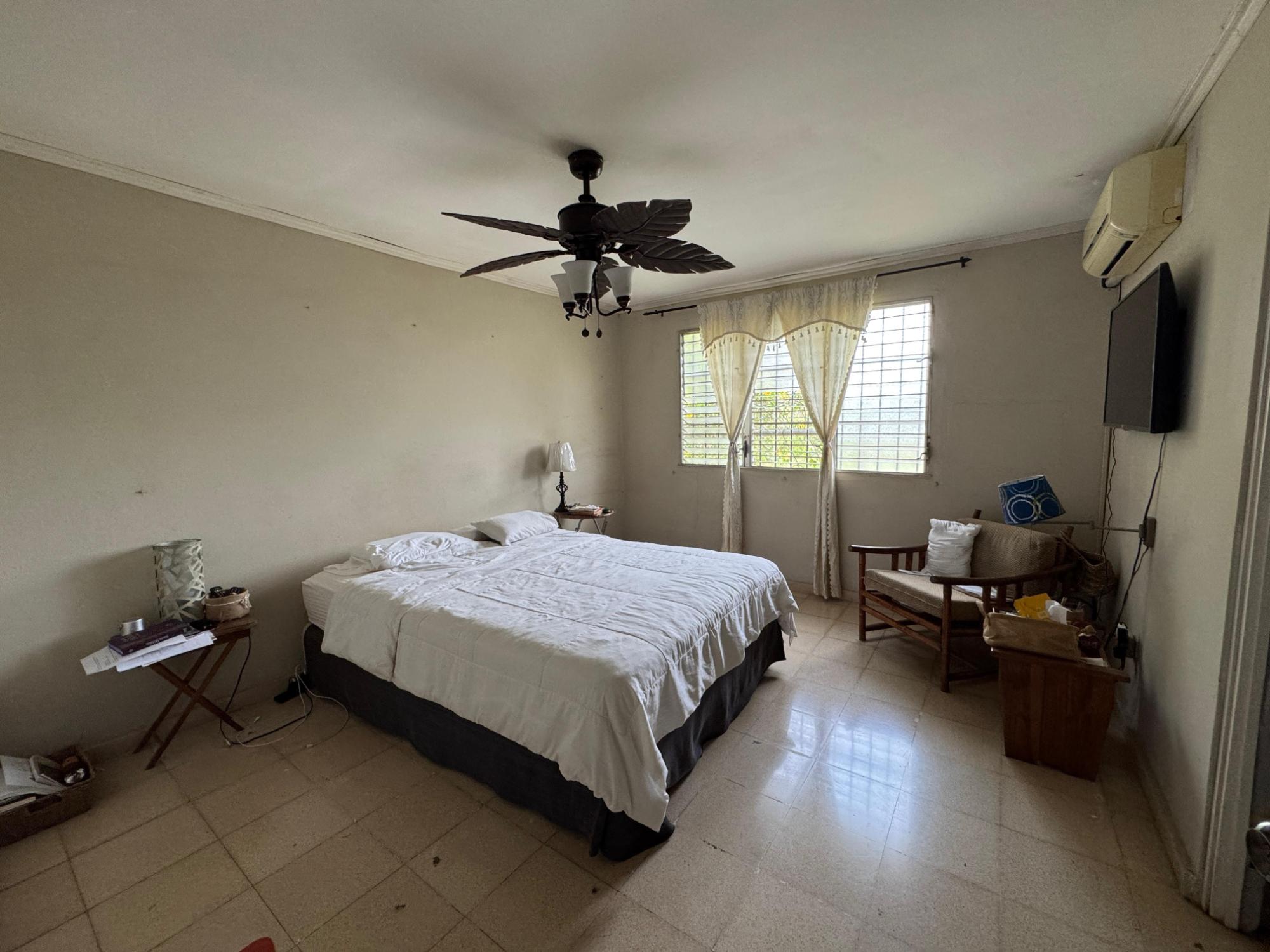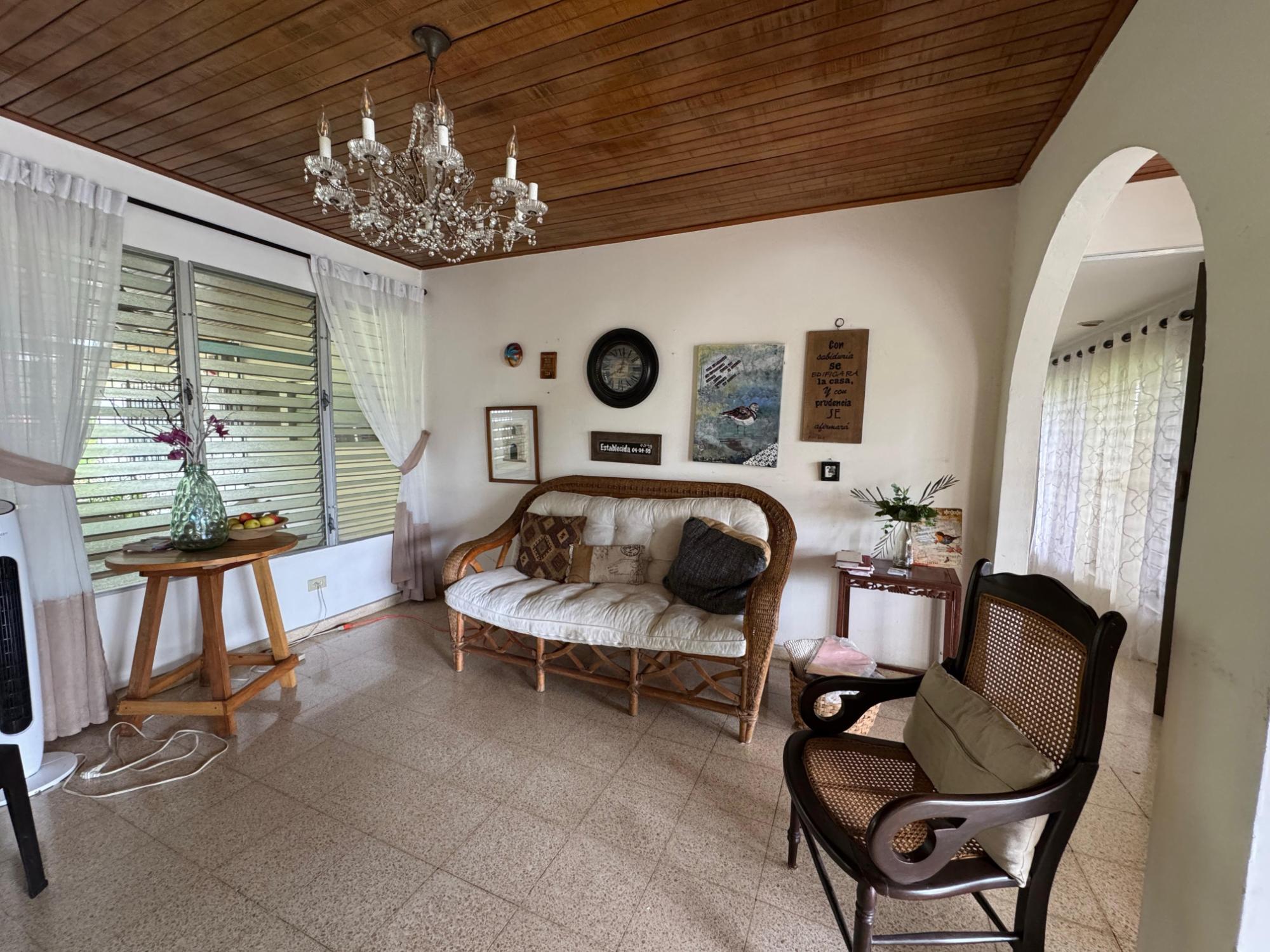 This property is located in a residential street in Santiago de Veraguas, sitting on a flat lot of 1,050 m² with ample space for outdoor living. The house has a built area of 212.40 m², along with semi-open spaces of 93.78 m² and a paved area of 107.09 m². Property Features: Bedrooms and Bathrooms: The home offers 4 bedrooms and 4 bathrooms. The master bedroom includes a custom-built teak closet (installed in 2023) and an en-suite bathroom. Living and Dining Areas: The spacious, open-plan living and dining area leads directly to a covered terrace, providing an ideal space for both everyday living and entertaining. Service Quarters: The property includes an independent service room with its own bathroom, adding flexibility for extra accommodation or storage needs. Kitchen: The kitchen was remodeled in 2020, featuring modern appliances and a functional layout. Parking and Outdoor Space: A covered portal provides parking space for two vehicles. The property also includes fruit and forest trees, offering a private green space.