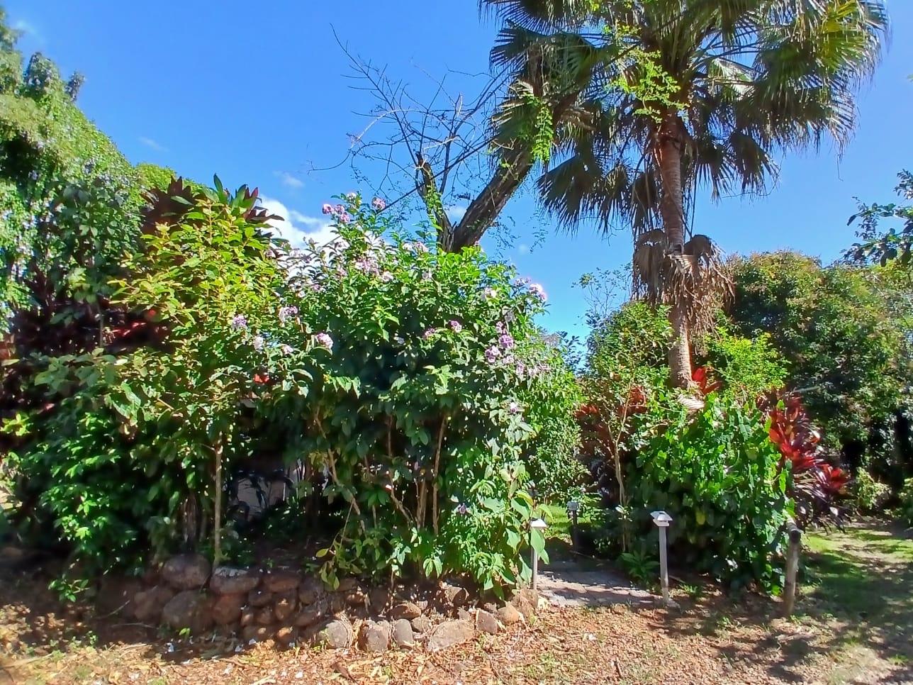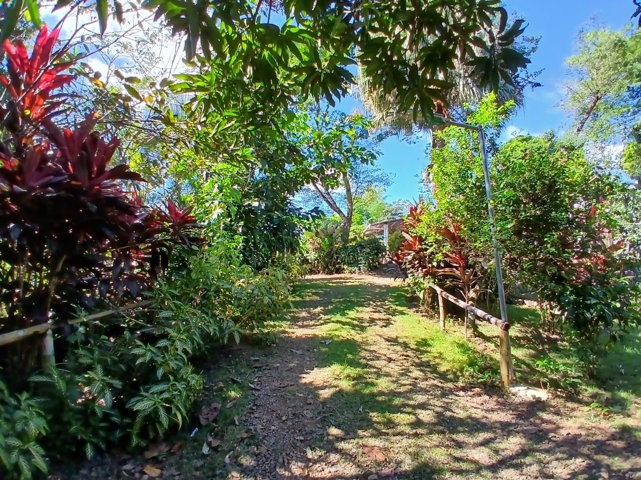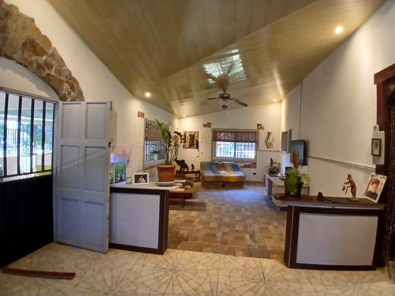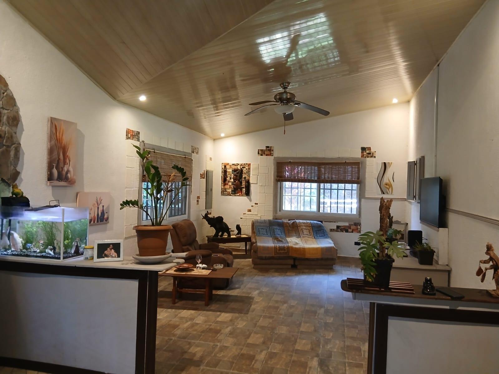 The house, which has been creatively and lovingly renovated over the past two years, has a floor space of 240 m² and features a very large kitchen, dining and living area, two bedrooms, two bathrooms, a large covered terrace with security bars, and a covered parking space for your car. The house comes with all furniture, appliances, and complete inventory—perfect for feeling right at home. The 1360 m² property is located in the second row on the paved road through Tinajas, only a 15-minute drive to David and 30 minutes to Boquete. Nevertheless, as soon as you enter your new home, you feel like you are in a rural setting. Lush plants provide pleasant coolness and tranquility, and a duck coop adds to the country charm. For your security, the lot is equipped with complete fencing, an automatic sliding gate, and solar lamps in the garden. A private well with two tanks, electricity, and internet are also available.