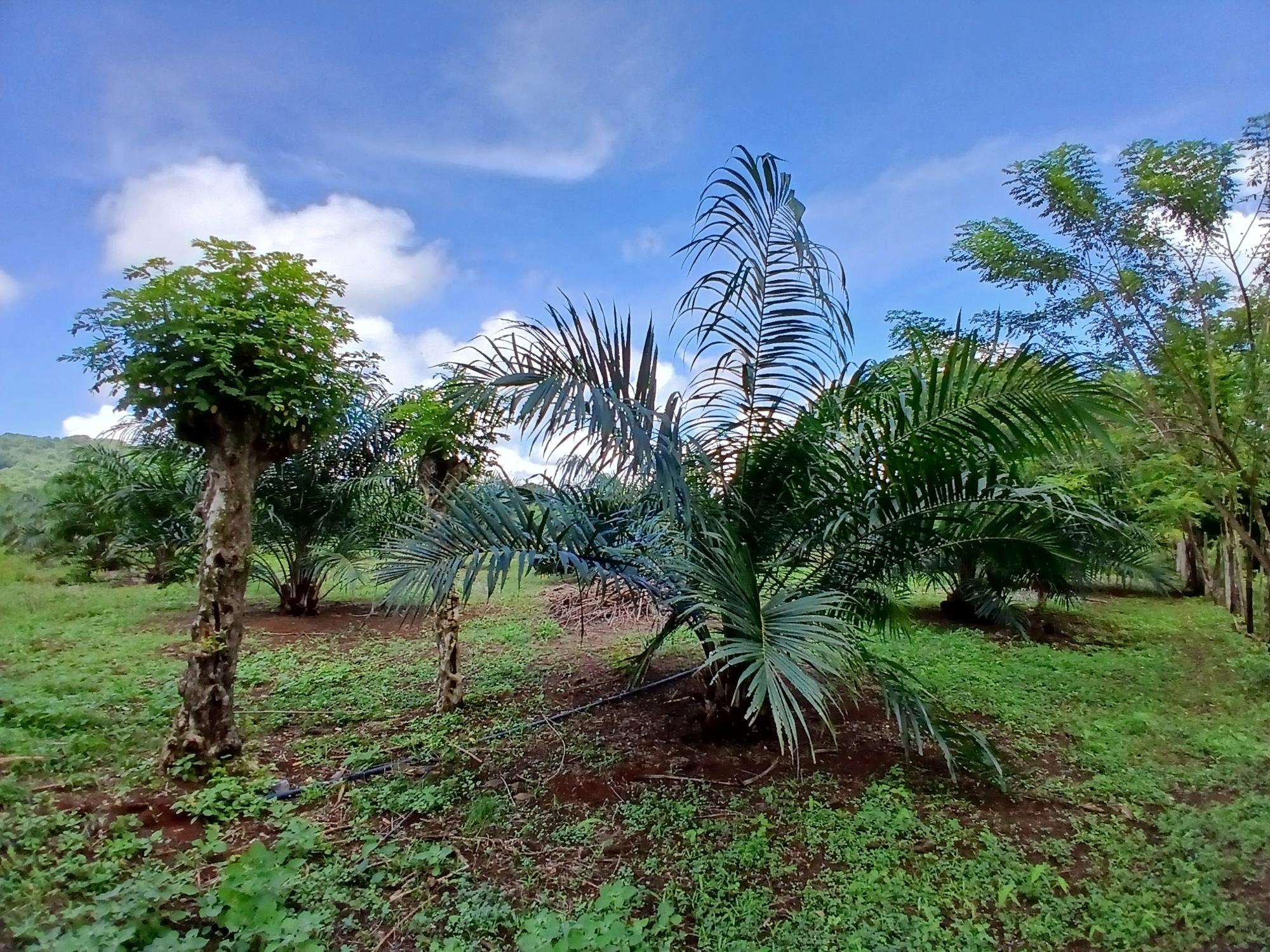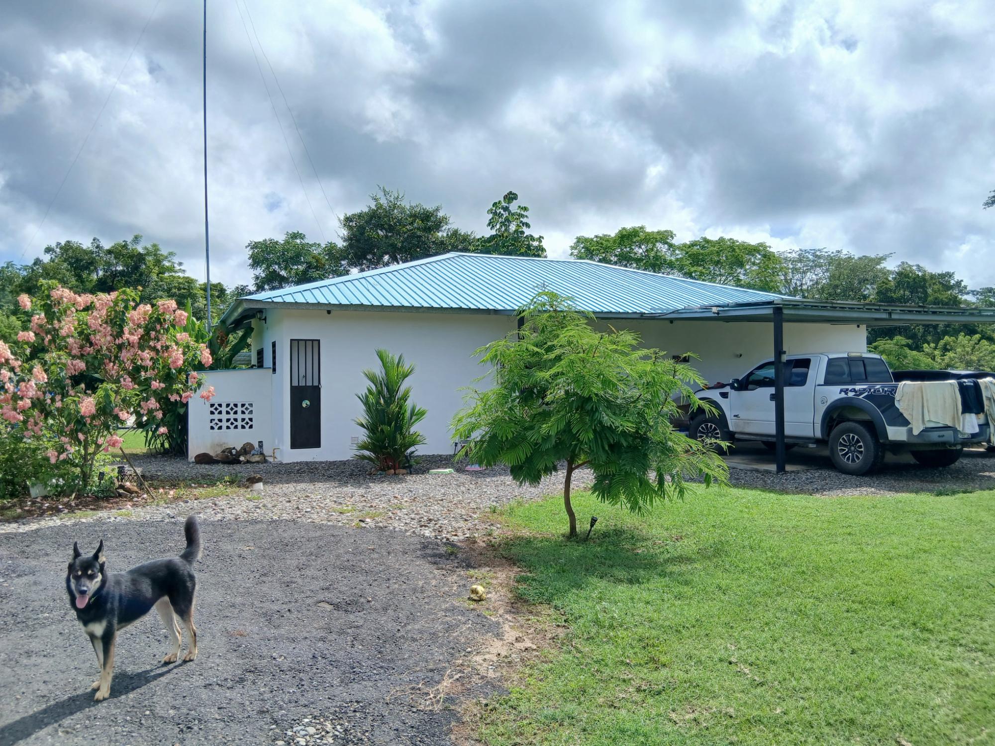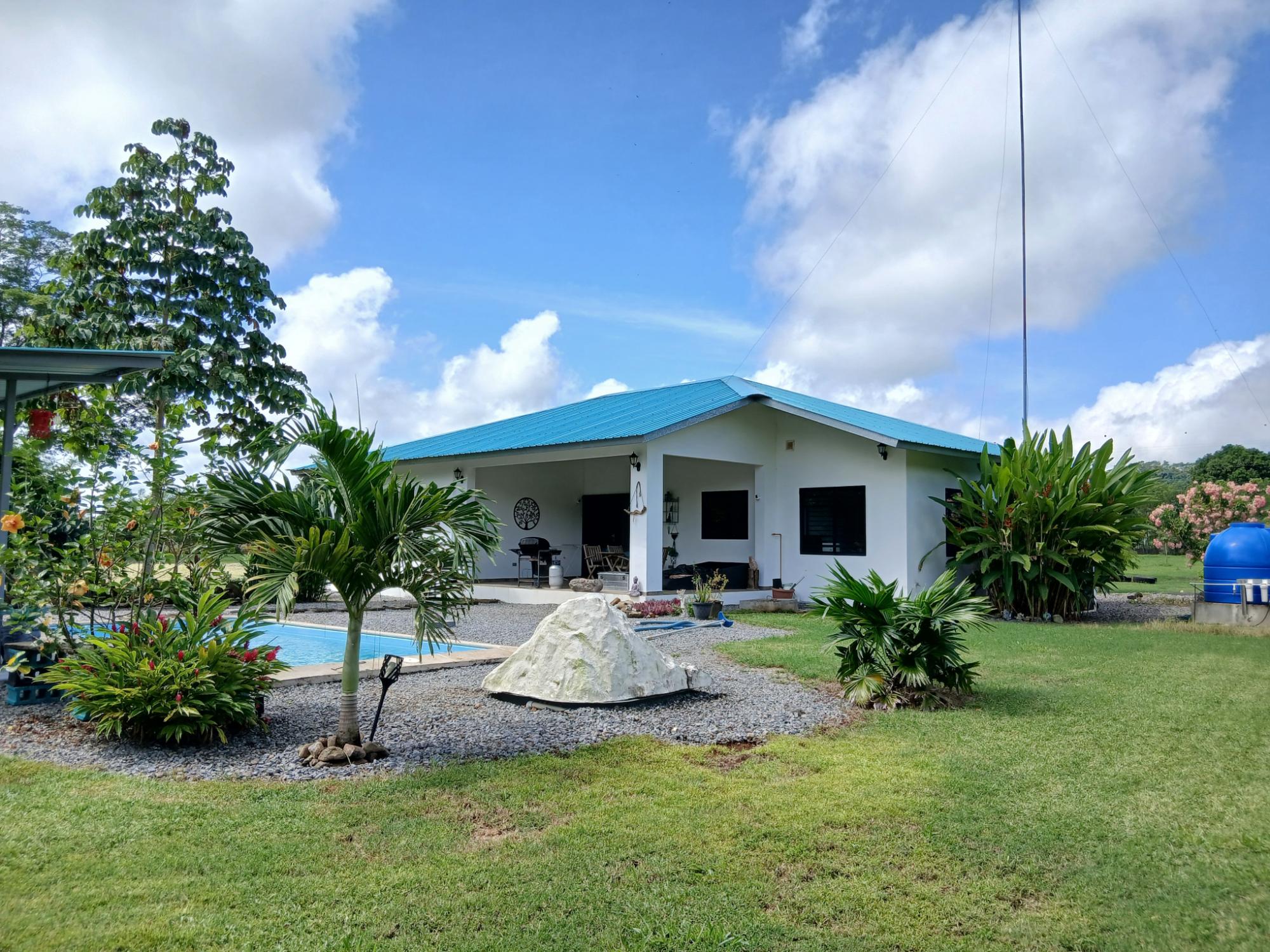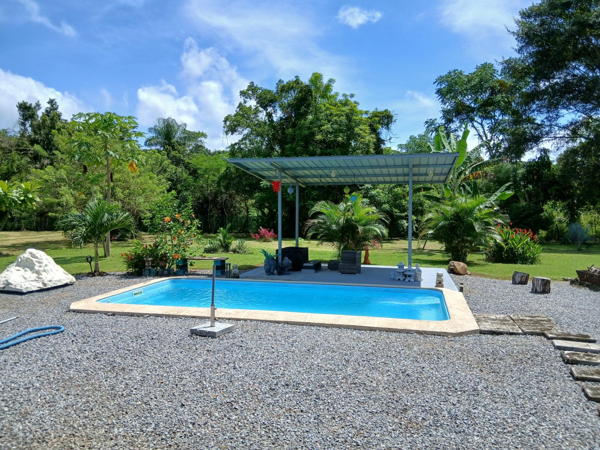 Bring your personal furniture and belongings; everything else is already in place so that you can feel at home right away. The 5-hectare property is divided into three sections, completely fenced in, and located in Zambrano, just a 20-minute drive from David, on a gravel but very well-maintained road. Boquete is a 45-minute drive away. On the 1.5-hectare, very well-maintained part of the property with numerous fruit trees such as papaya, mango, avocado, banana, citrus fruits, etc., you will find the main house, built just 2.5 years ago, with two bedrooms, two bathrooms, a large living room with kitchen, a studio, and a laundry room. There is also a large covered terrace, a pool with another small terrace, and two shipping containers that are used as a workshop and storage space. The house can be operated completely self-sufficiently; there is a solar system, a well, and the hot water is also heated by a solar module. But, just in case, municipal water and electricity are also already installed. The 3-hectare central part of the property is planted with oil palms, which are just coming into production. Another piece of the puzzle for financing your independent lifestyle. The remaining 0.5 hectares contain another simple, older house, which is currently occupied by the employee. There is also a large vegetable garden, a chicken coop, and even space for a cow. All sections are directly accessible from the road, so division would be possible. Need more land? No problem – additional land can be purchased adjacent to this property.