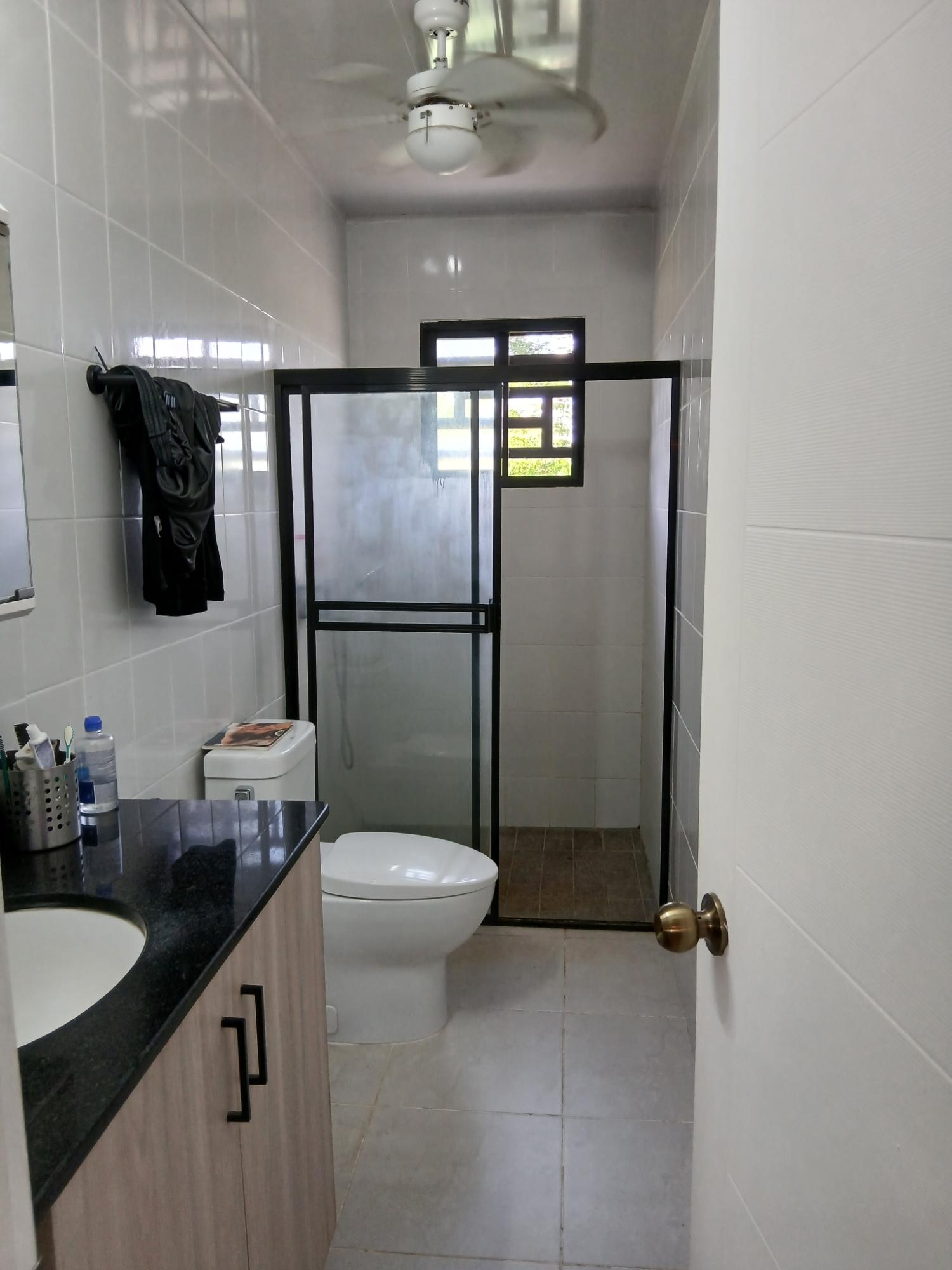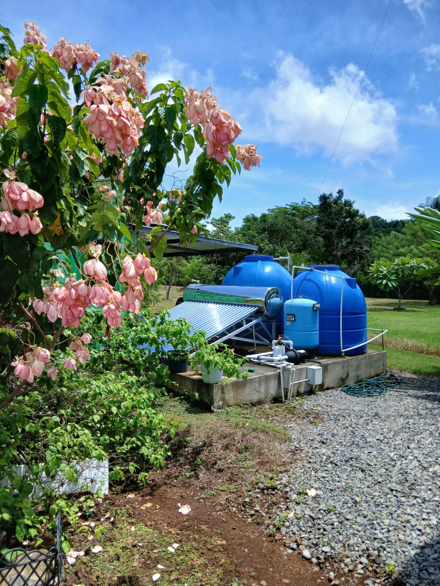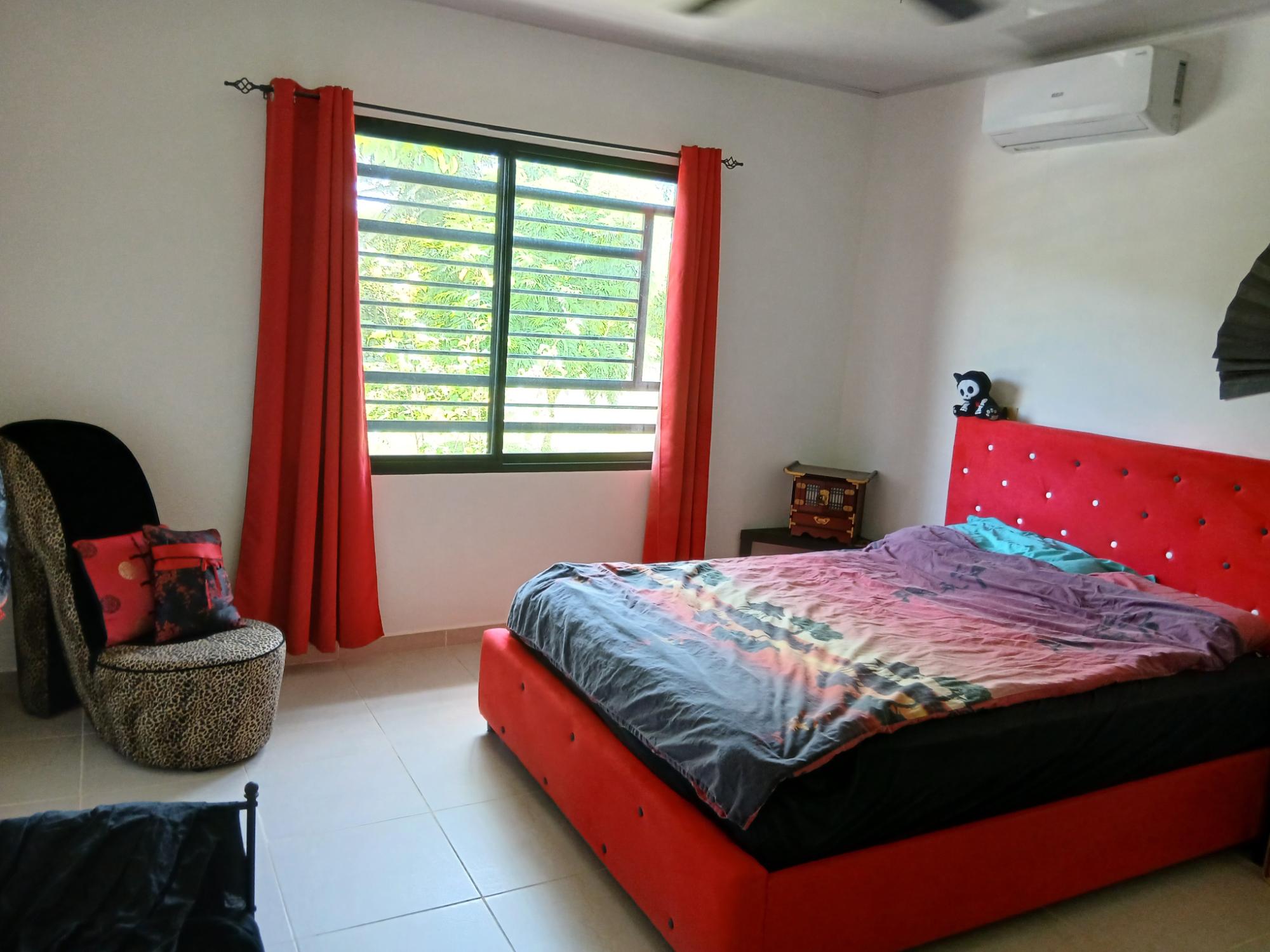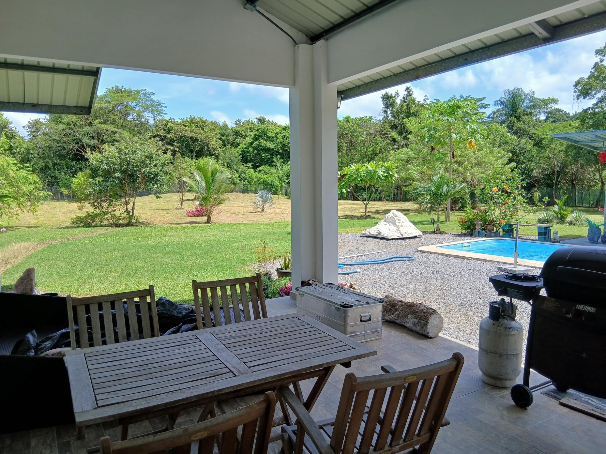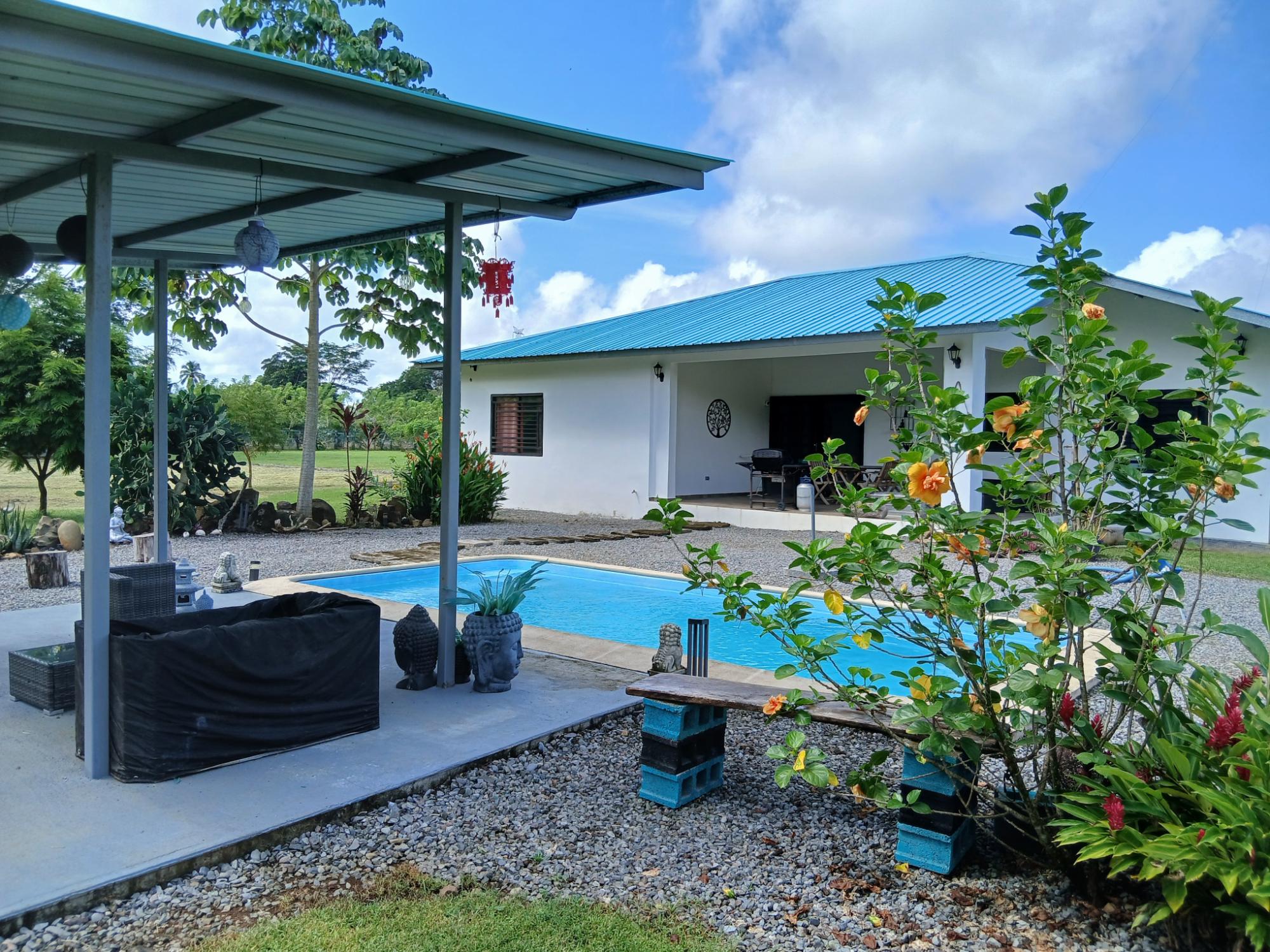 Bring your personal furniture and belongings; everything else is already in place so that you can feel at home right away. The 5-hectare property is divided into three sections, completely fenced in, and located in Zambrano, just a 20-minute drive from David, on a gravel but very well-maintained road. Boquete is a 45-minute drive away. On the 1.5-hectare, very well-maintained part of the property with numerous fruit trees such as papaya, mango, avocado, banana, citrus fruits, etc., you will find the main house, built just 2.5 years ago, with two bedrooms, two bathrooms, a large living room with kitchen, a studio, and a laundry room. There is also a large covered terrace, a pool with another small terrace, and two shipping containers that are used as a workshop and storage space. The house can be operated completely self-sufficiently; there is a solar system, a well, and the hot water is also heated by a solar module. But, just in case, municipal water and electricity are also already installed. The 3-hectare central part of the property is planted with oil palms, which are just coming into production. Another piece of the puzzle for financing your independent lifestyle. The remaining 0.5 hectares contain another simple, older house, which is currently occupied by the employee. There is also a large vegetable garden, a chicken coop, and even space for a cow. All sections are directly accessible from the road, so division would be possible. Need more land? No problem – additional land can be purchased adjacent to this property.